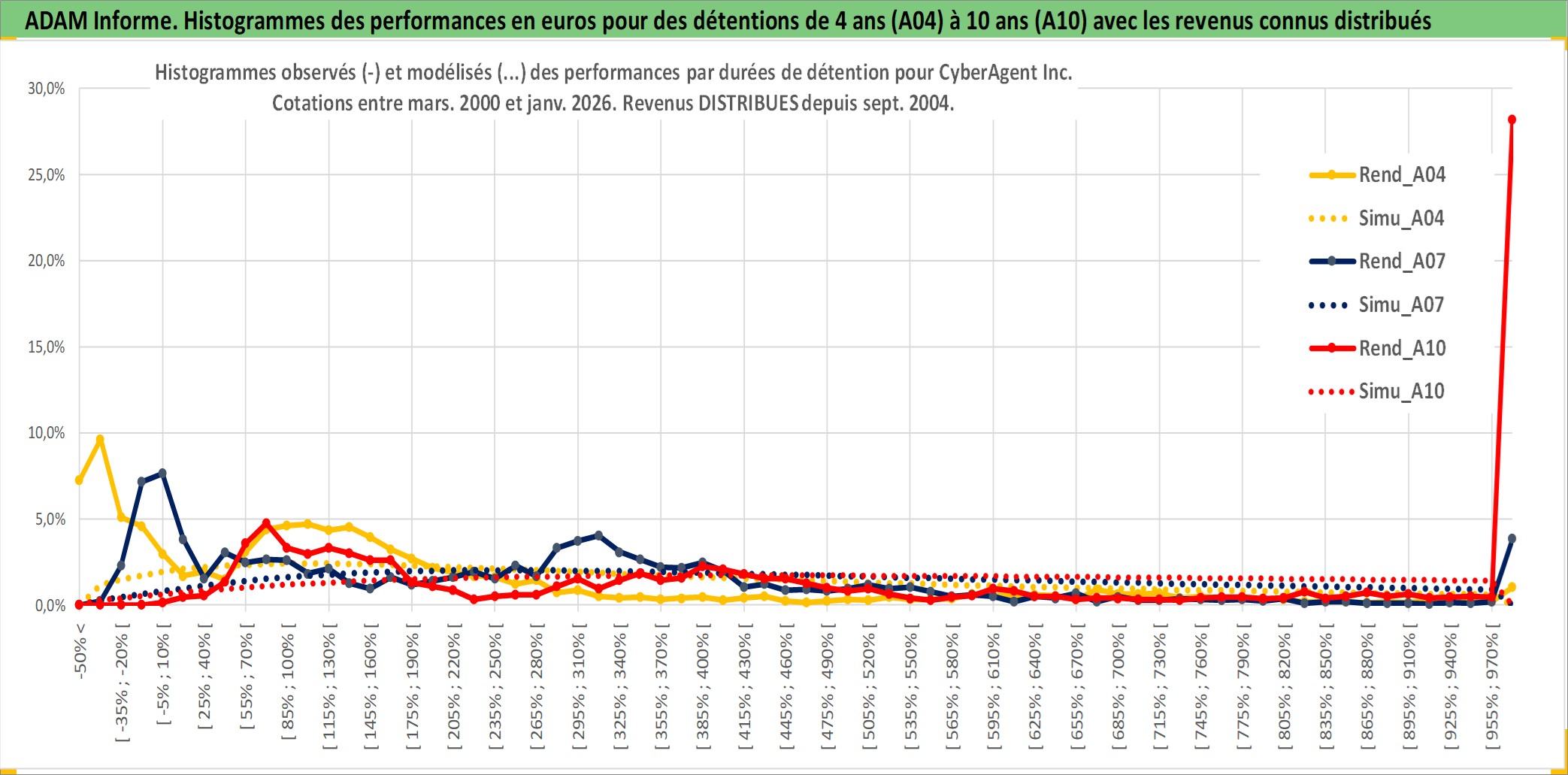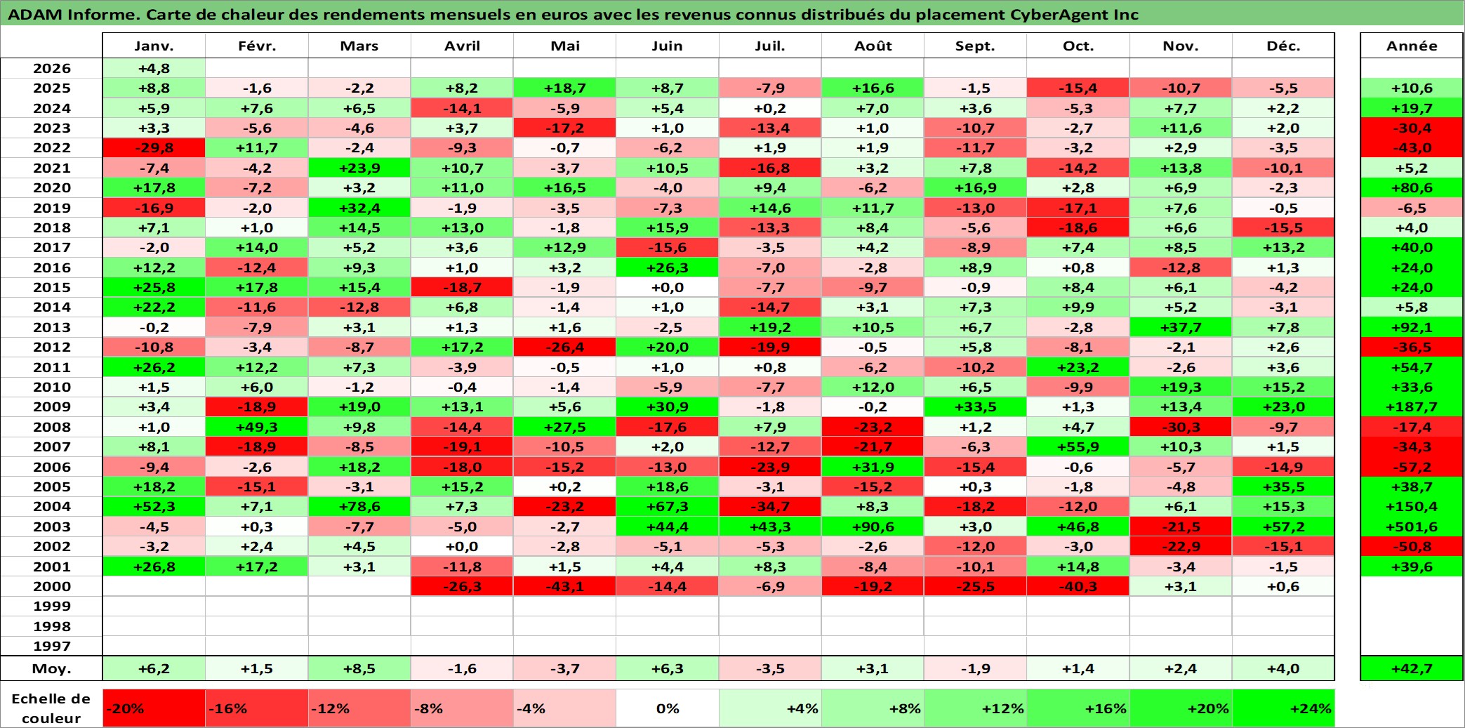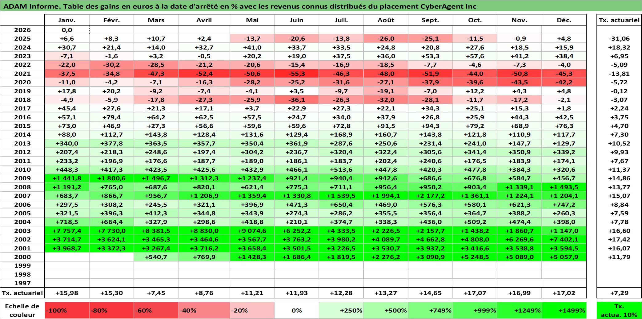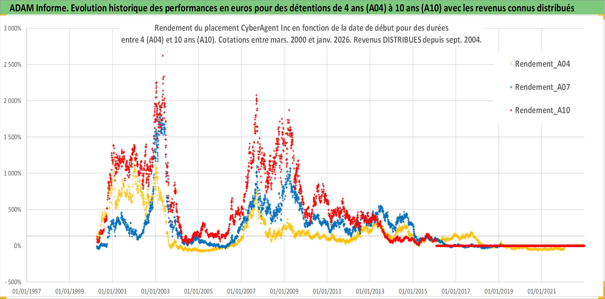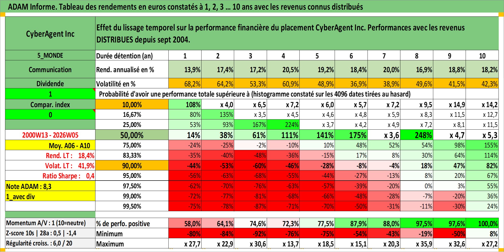 Site dédié aux investisseursPage dédiée sur site financeAnalyse des valorisations hebdomadaires de l'action CyberAgent Inc. Cet actif est cote en JPY. Les valorisations sont en contrevaleur EURO et couvrent les semaines 2000W13 a 2026W05. Les revenus de cet actif financier sont pris en compte depuis la semaine 2004W40. La note ESG de cet actif n'est pas connue.
