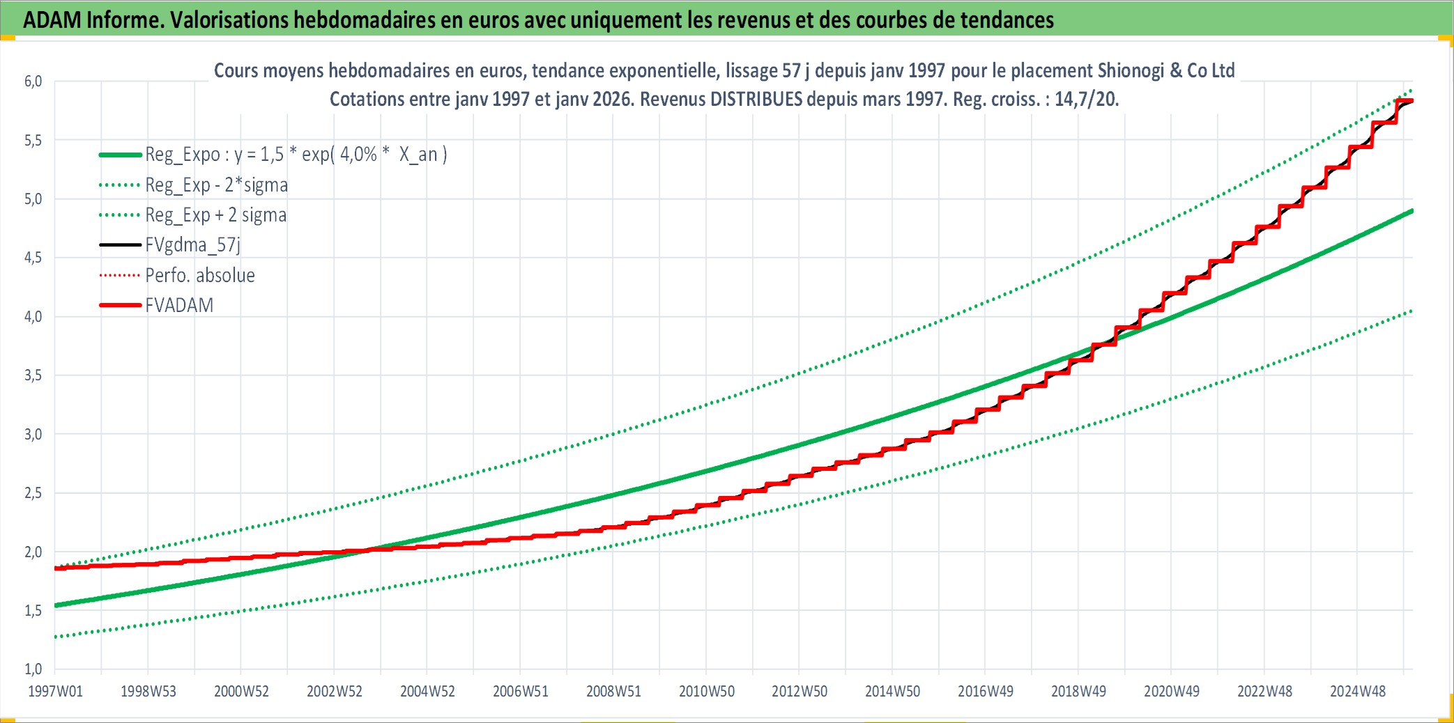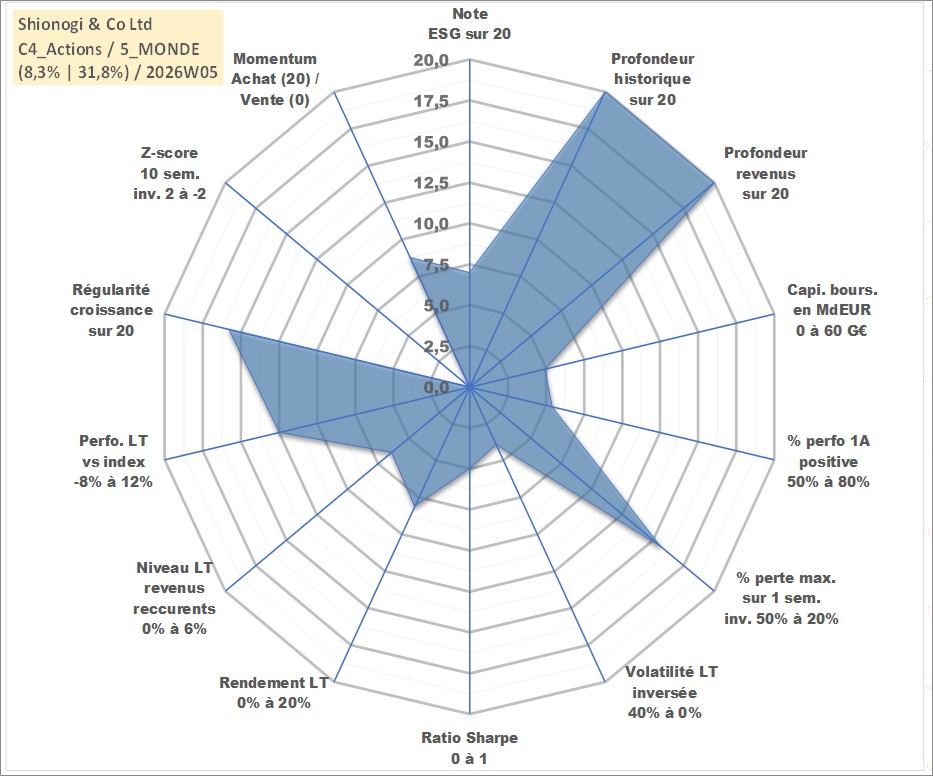 Site dédié aux investisseursPage dédiée sur site financeAnalyse des valorisations hebdomadaires de l'action Shionogi & Co Ltd. Cet actif est cote en JPY. Les valorisations sont en contrevaleur EURO et couvrent les semaines 1997W01 a 2026W05. Les revenus de cet actif financier sont pris en compte depuis la semaine 1997W13. La note globale ESG de cet actif est estimee a 7.0 (apres rebasage entre 0 et 20).