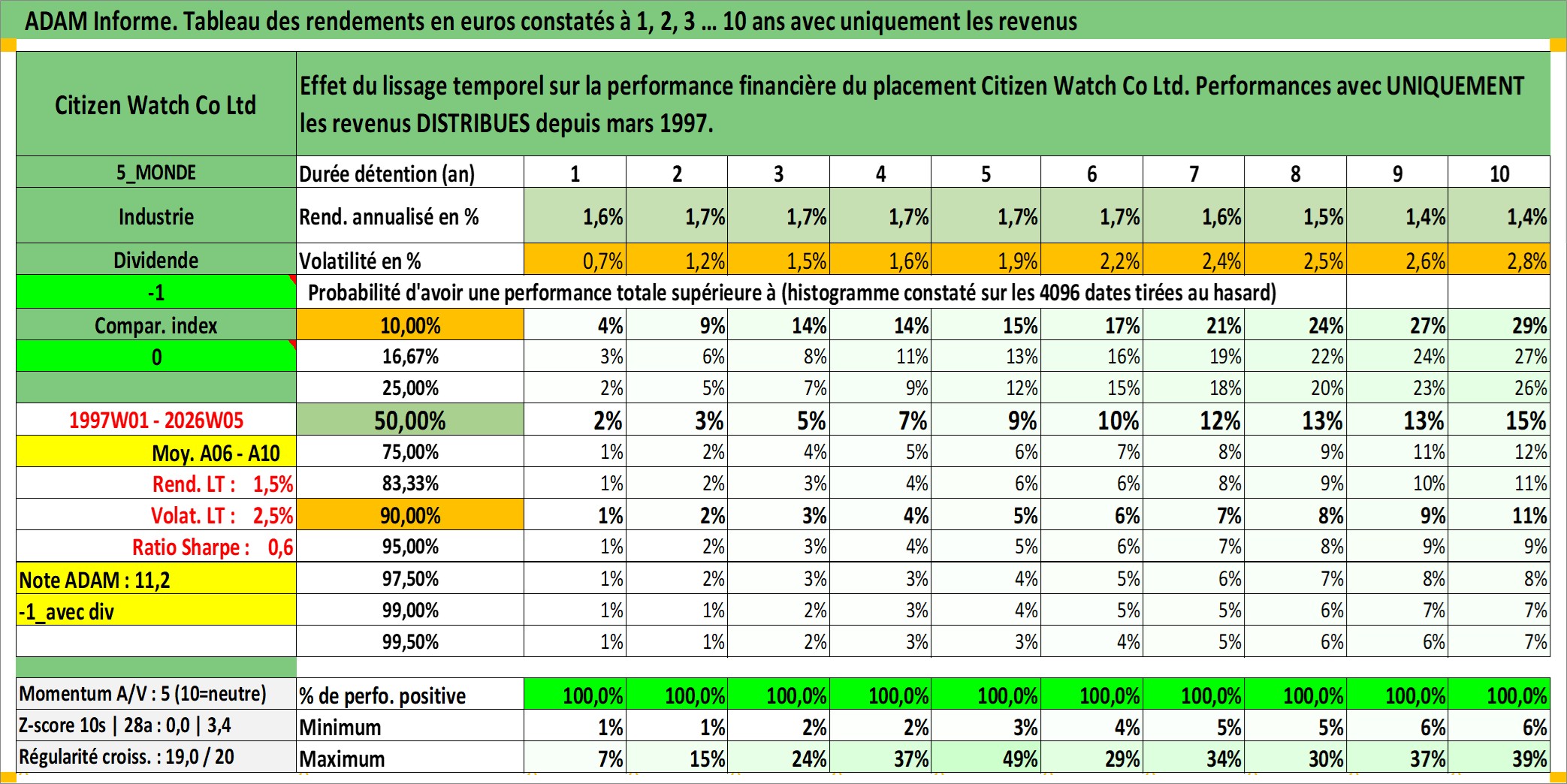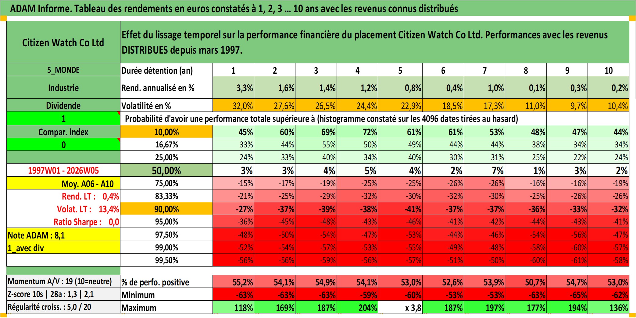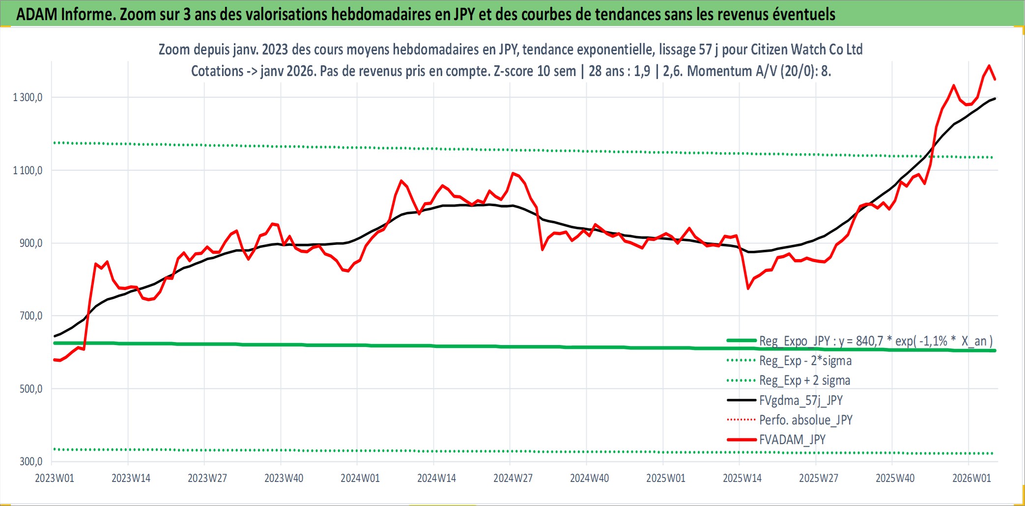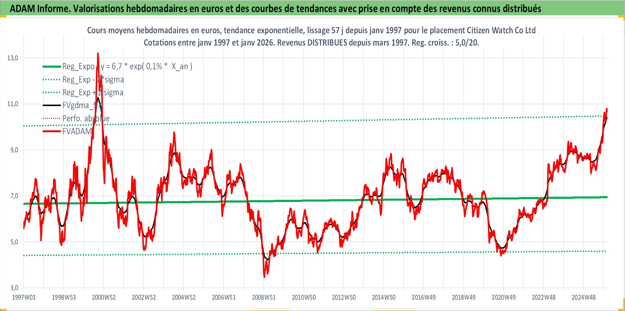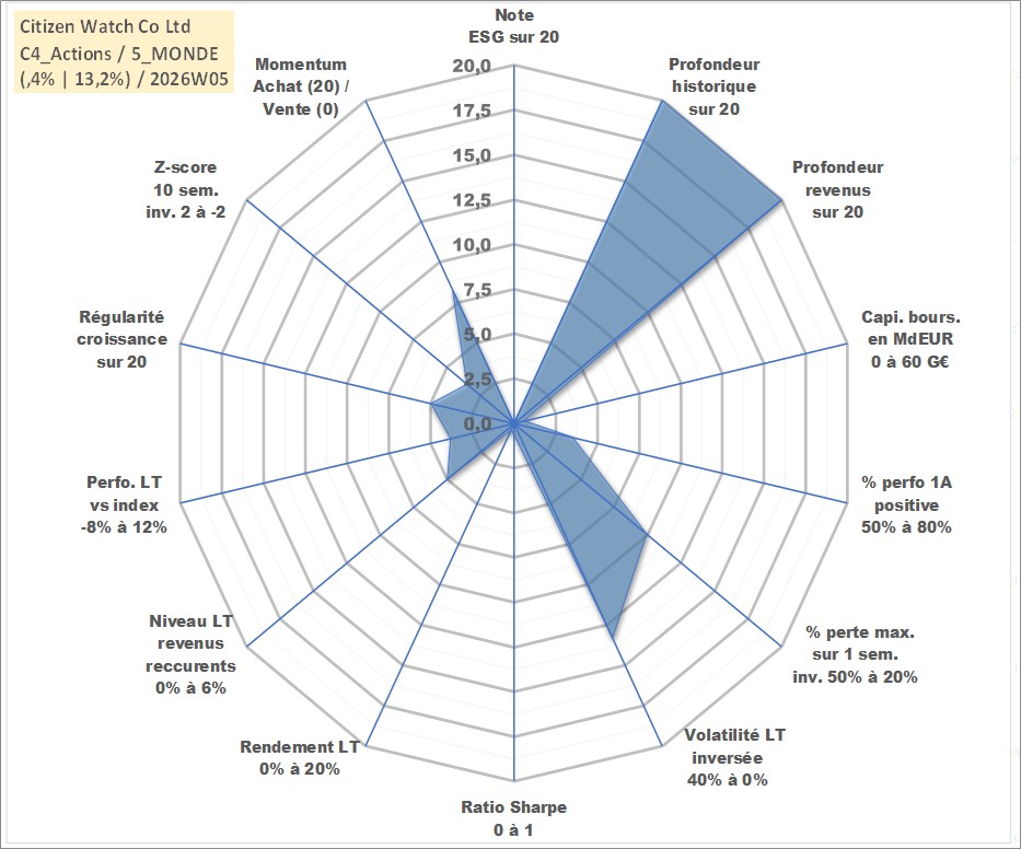Site dédié aux investisseursPage dédiée sur site financeAnalyse des valorisations hebdomadaires de l'action Citizen Watch Co Ltd. Cet actif est cote en JPY. Les valorisations sont en contrevaleur EURO et couvrent les semaines 1997W01 a 2026W05. Les revenus de cet actif financier sont pris en compte depuis la semaine 1997W13. La note ESG de cet actif n'est pas connue.