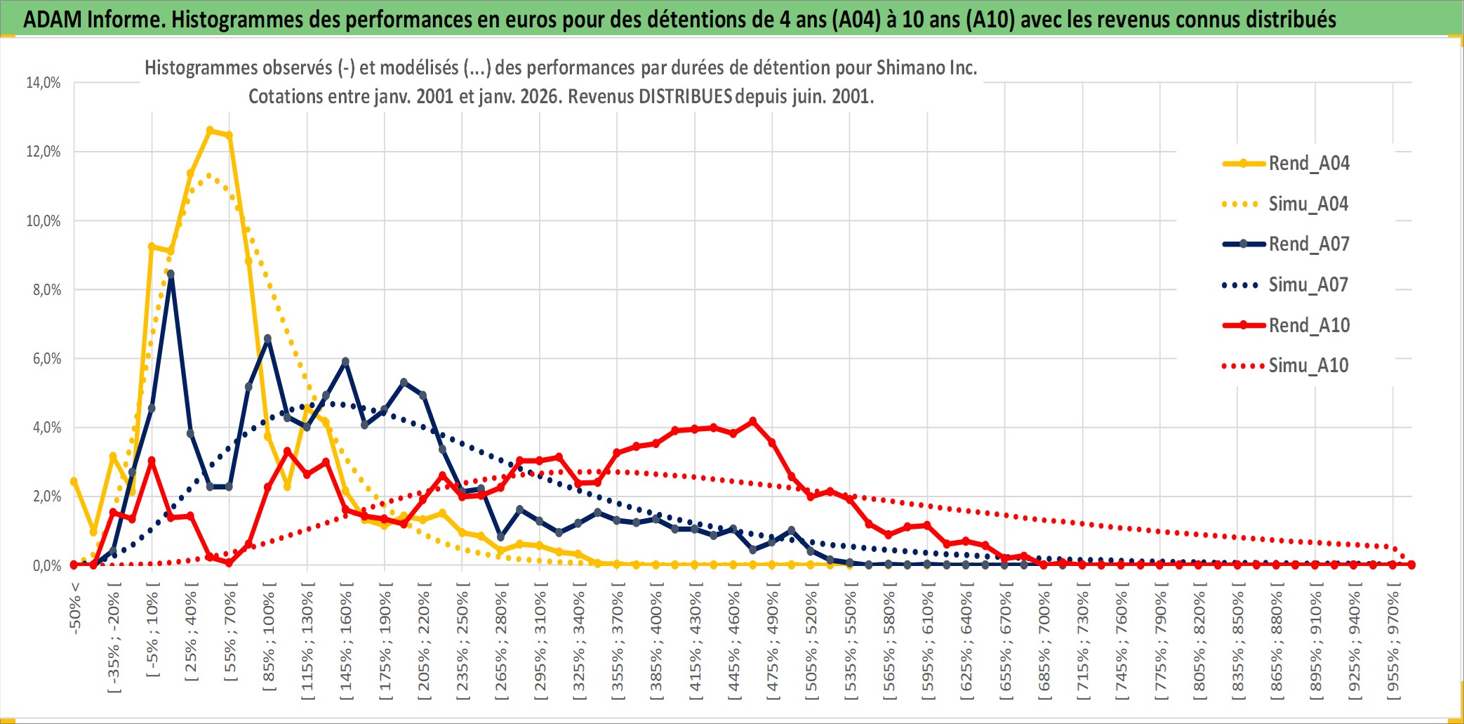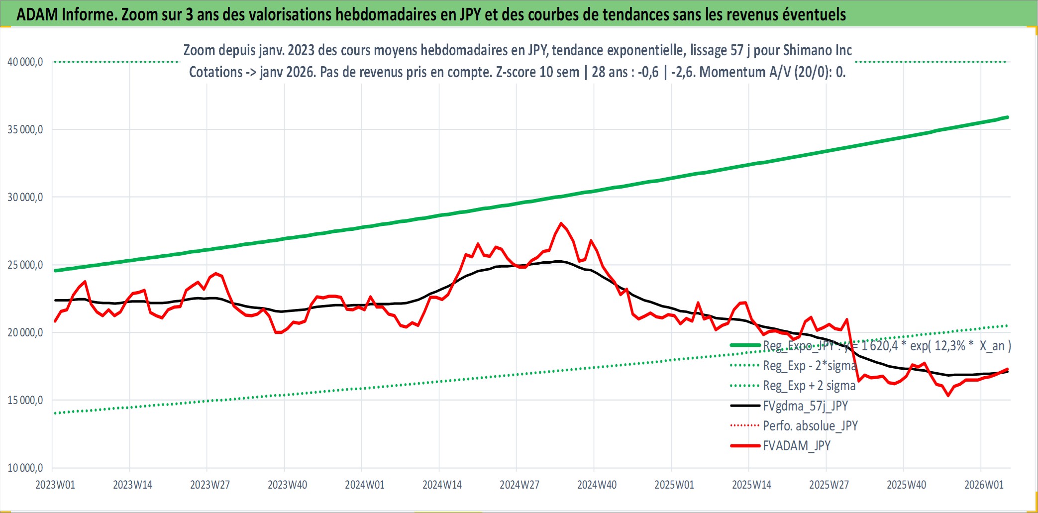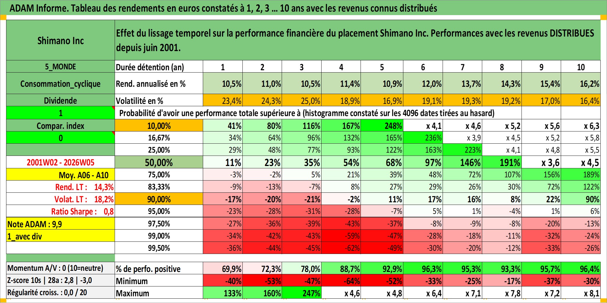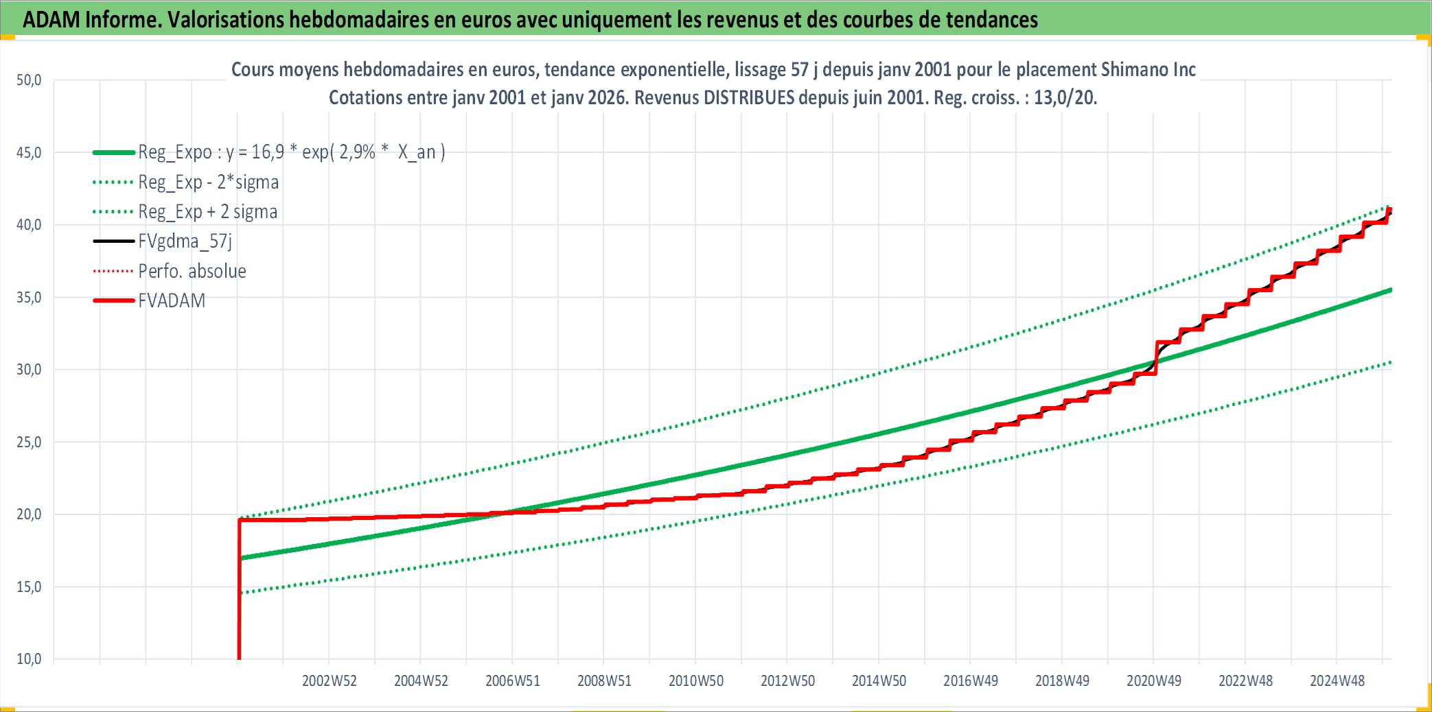 Site dédié aux investisseursPage dédiée sur site financeAnalyse des valorisations hebdomadaires de l'action Shimano Inc. Cet actif est cote en JPY. Les valorisations sont en contrevaleur EURO et couvrent les semaines 2001W02 a 2026W05. Les revenus de cet actif financier sont pris en compte depuis la semaine 2001W26. La note globale ESG de cet actif est estimee a 13.0 (apres rebasage entre 0 et 20).