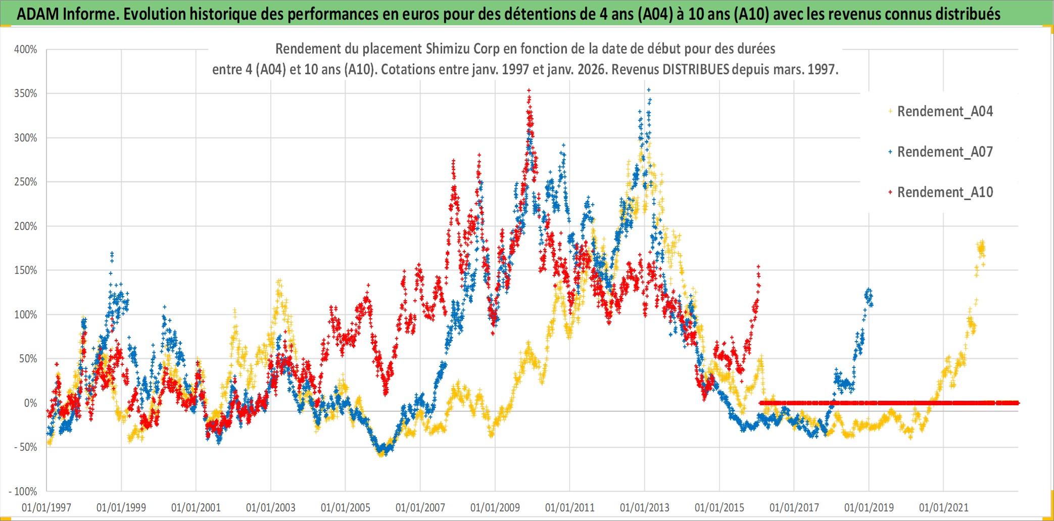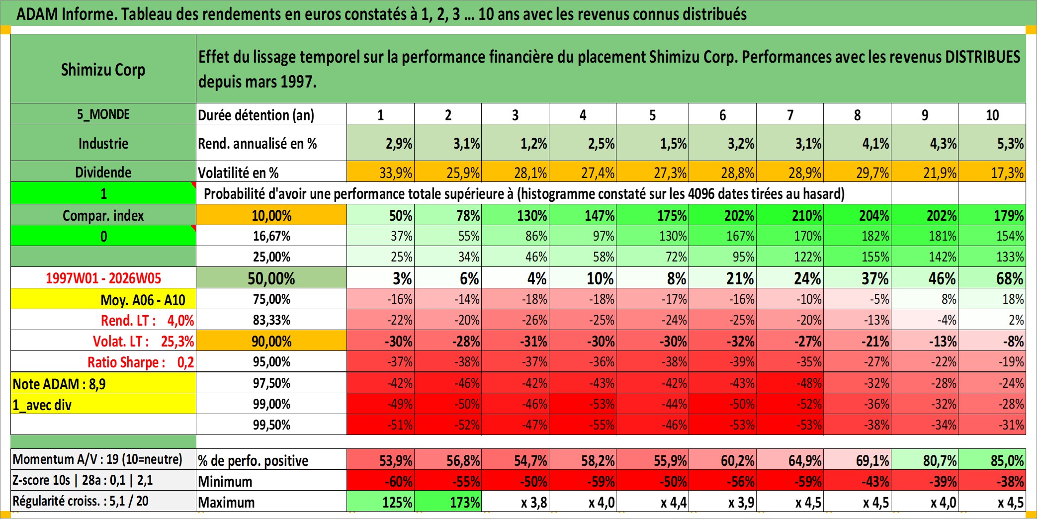 Site dédié aux investisseursPage dédiée sur site financeAnalyse des valorisations hebdomadaires de l'action Shimizu Corp. Cet actif est cote en JPY. Les valorisations sont en contrevaleur EURO et couvrent les semaines 1997W01 a 2026W05. Les revenus de cet actif financier sont pris en compte depuis la semaine 1997W13. La note globale ESG de cet actif est estimee a 4.0 (apres rebasage entre 0 et 20).