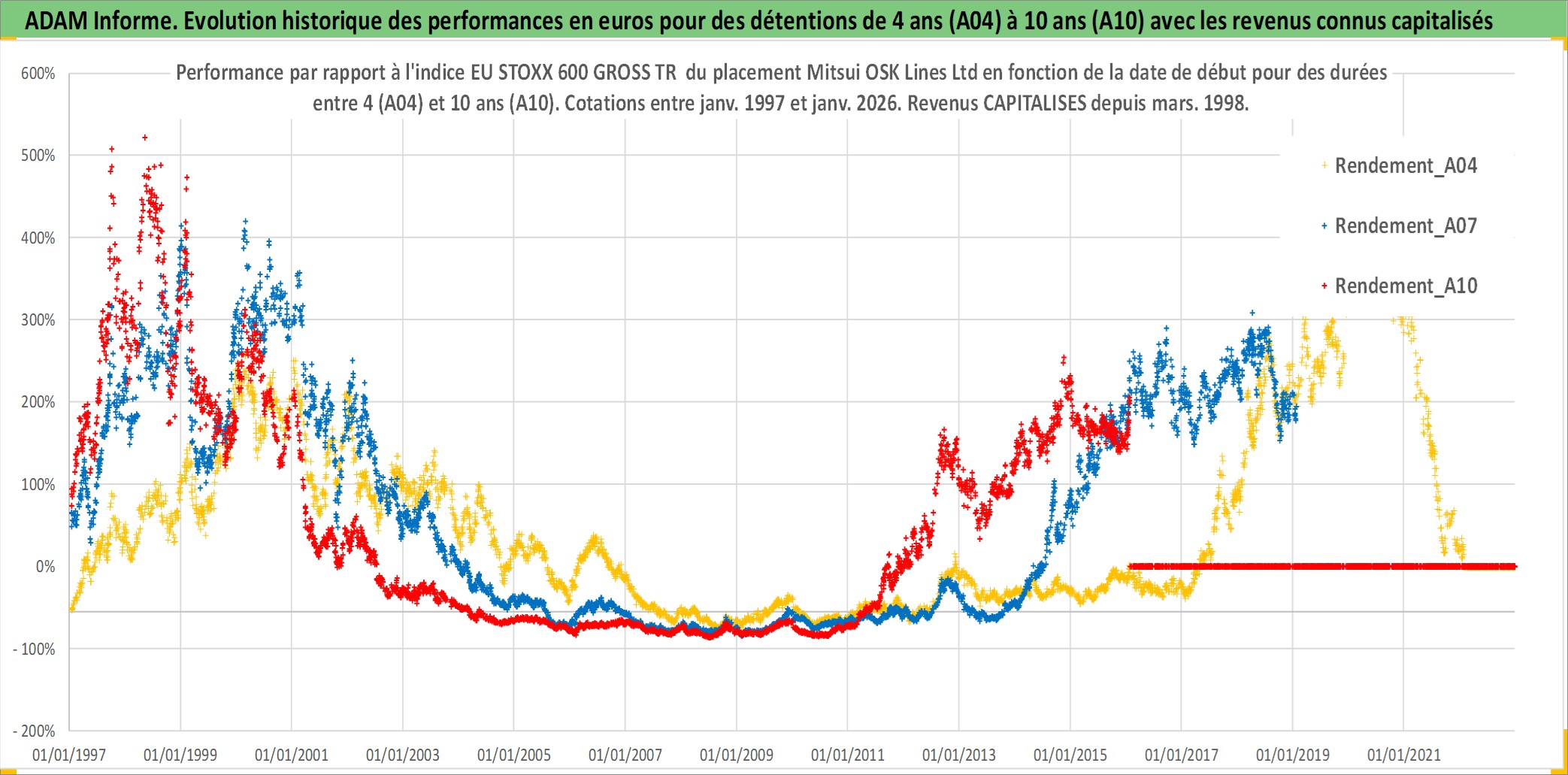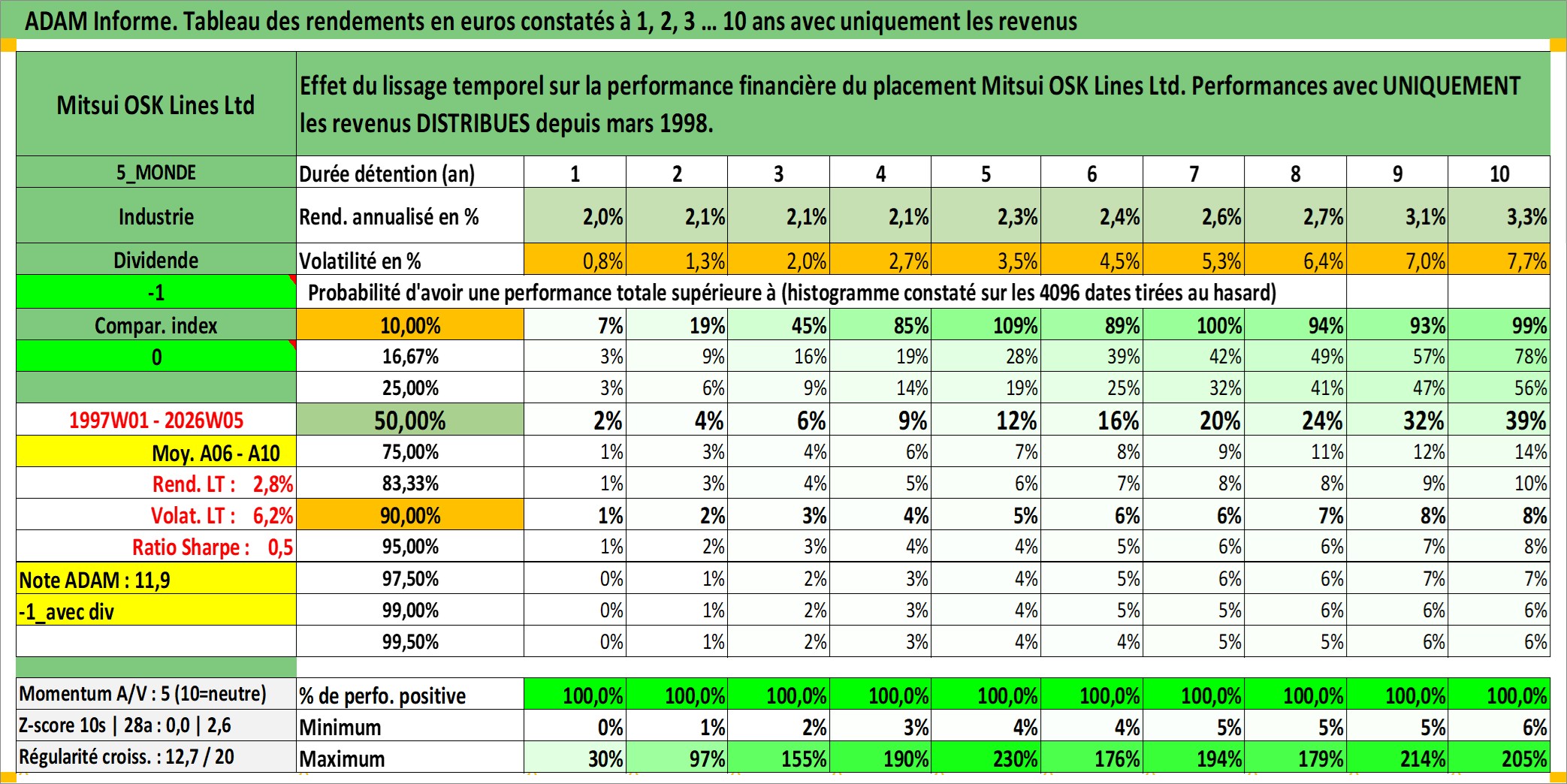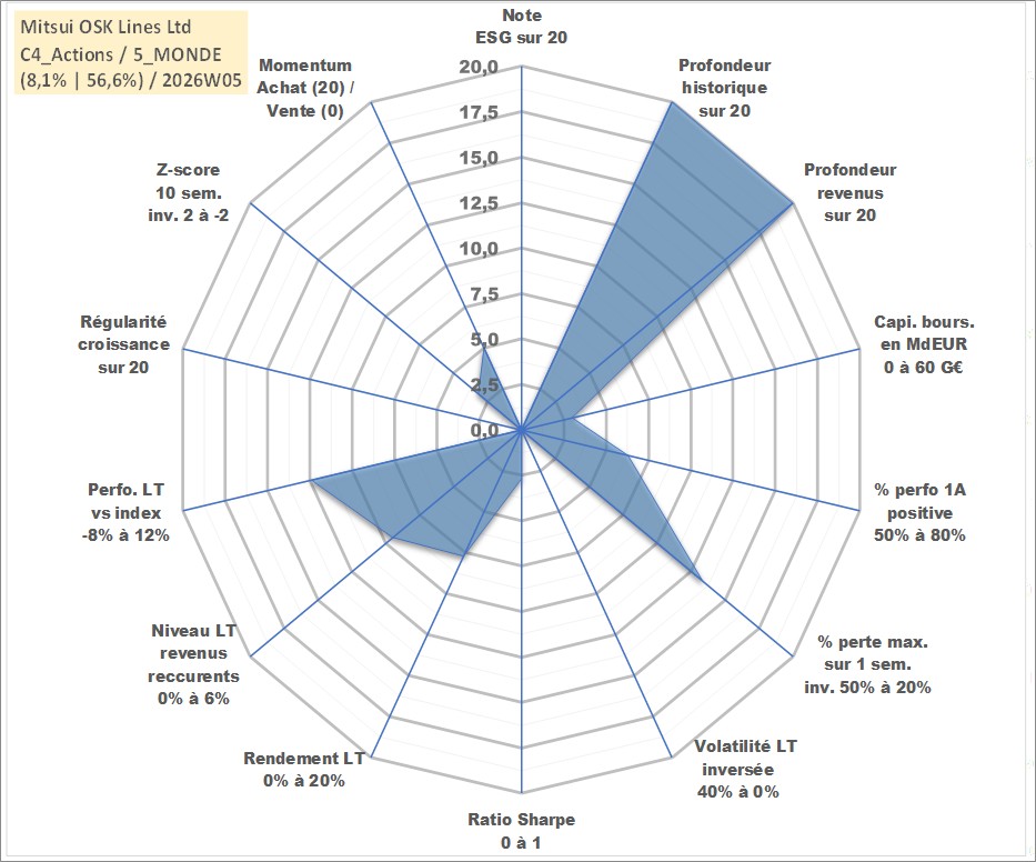 Site dédié aux investisseursPage dédiée sur site financeAnalyse des valorisations hebdomadaires de l'action Mitsui OSK Lines Ltd. Cet actif est cote en JPY. Les valorisations sont en contrevaleur EURO et couvrent les semaines 1997W01 a 2026W05. Les revenus de cet actif financier sont pris en compte depuis la semaine 1998W13. La note ESG de cet actif n'est pas connue.