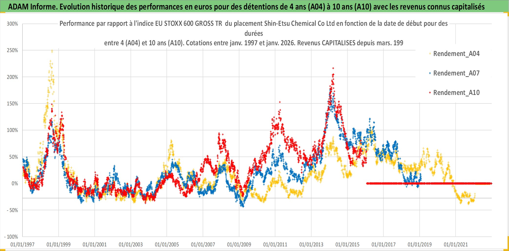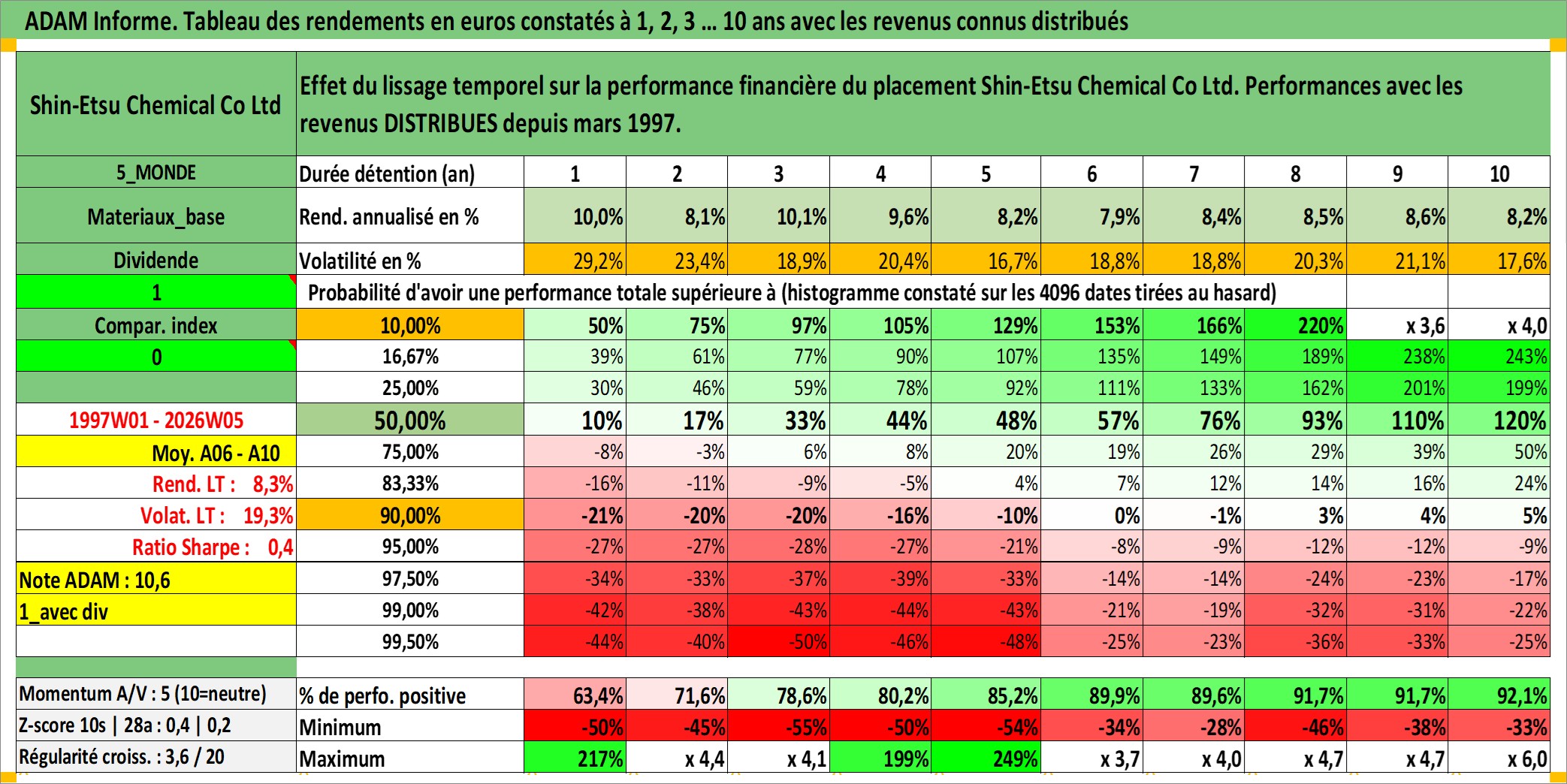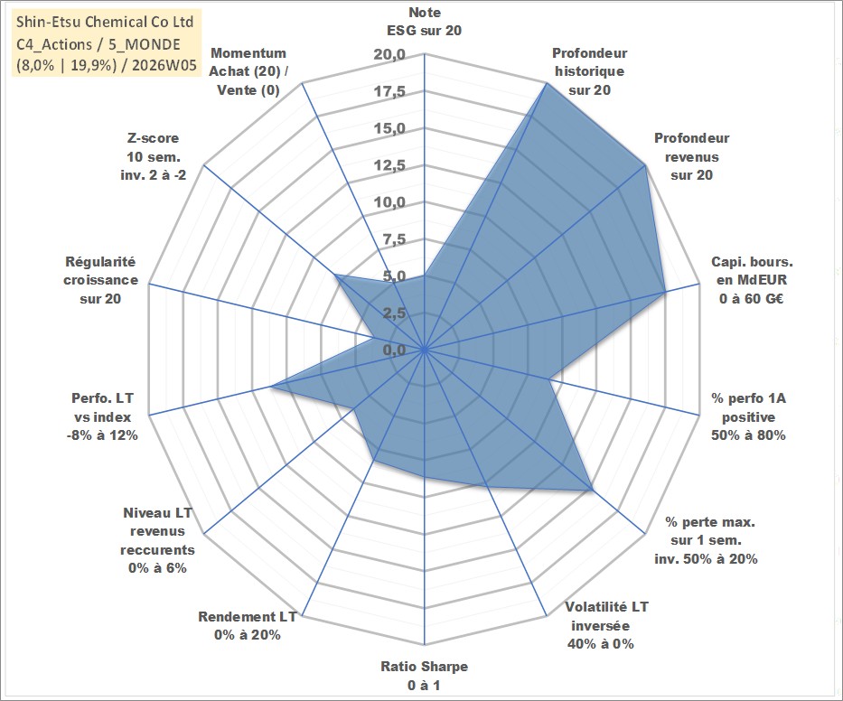 Site dédié aux investisseursPage dédiée sur site financeAnalyse des valorisations hebdomadaires de l'action Shin-Etsu Chemical Co Ltd. Cet actif est cote en JPY. Les valorisations sont en contrevaleur EURO et couvrent les semaines 1997W01 a 2026W05. Les revenus de cet actif financier sont pris en compte depuis la semaine 1997W13. La note globale ESG de cet actif est estimee a 5.0 (apres rebasage entre 0 et 20).