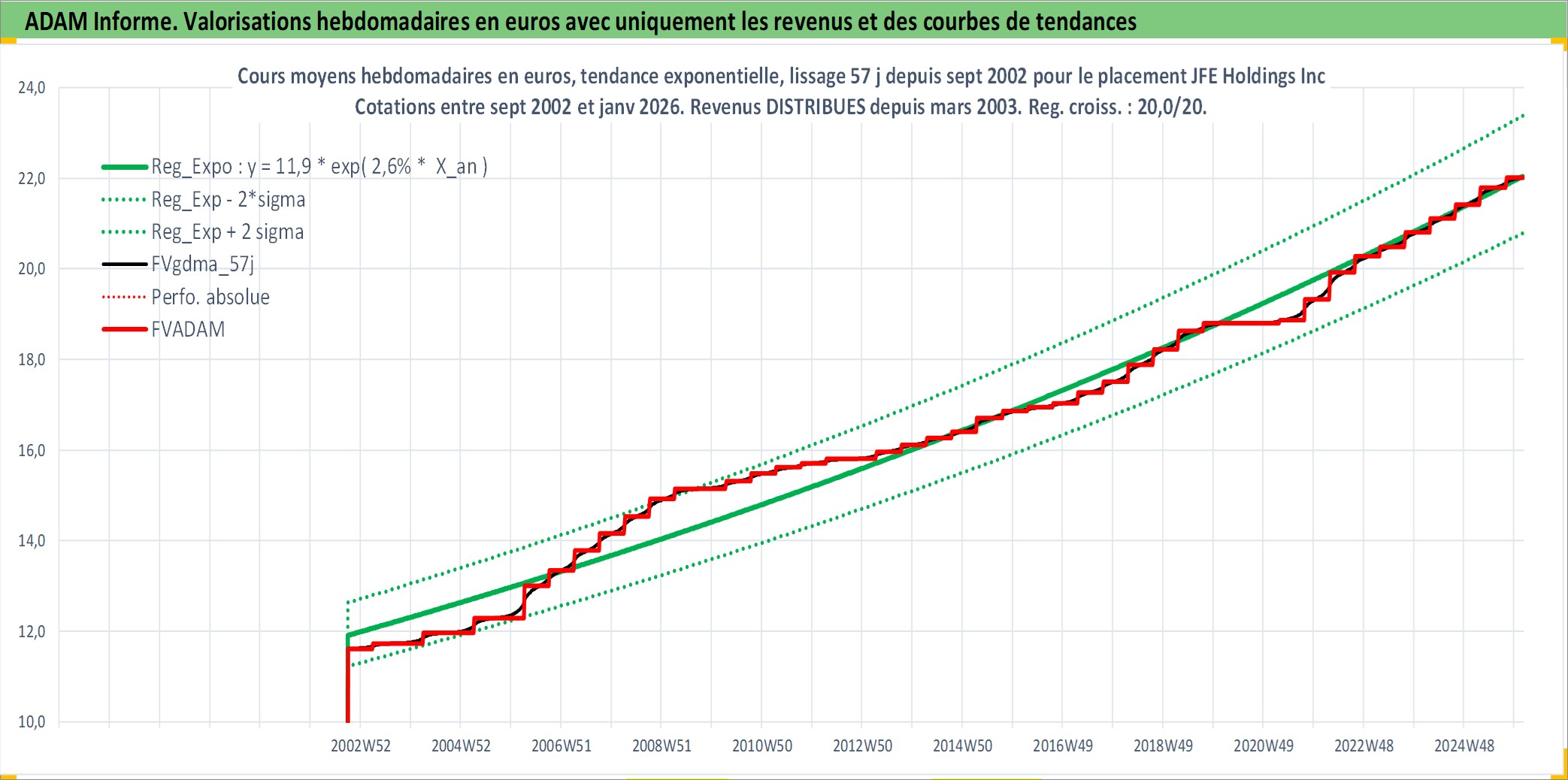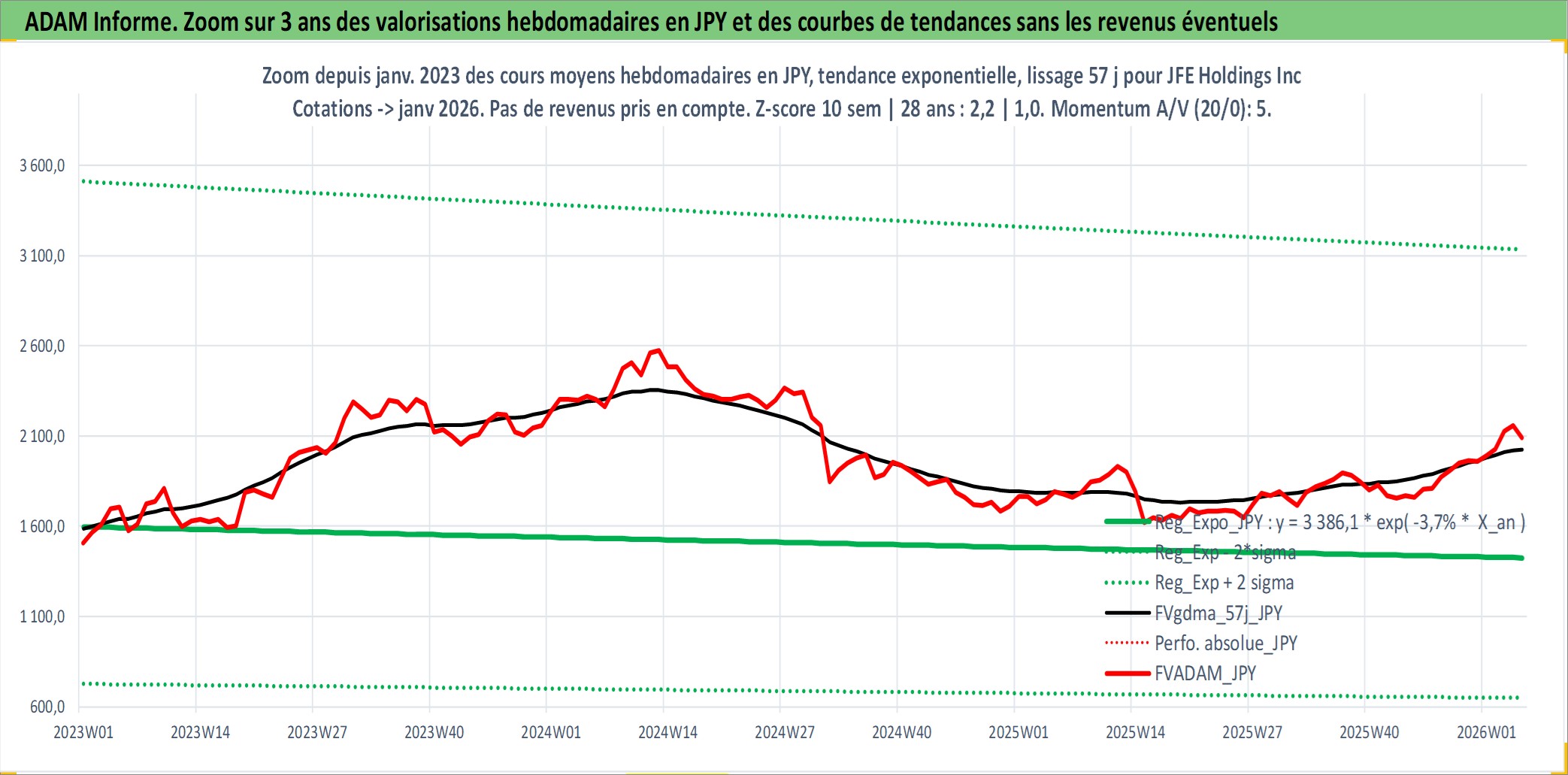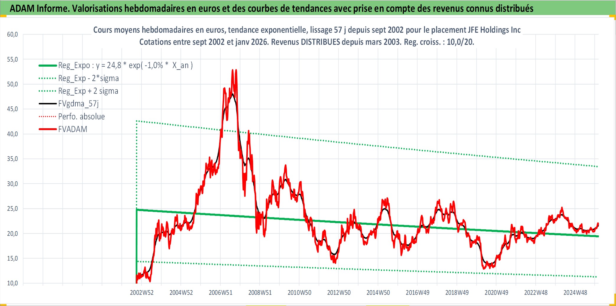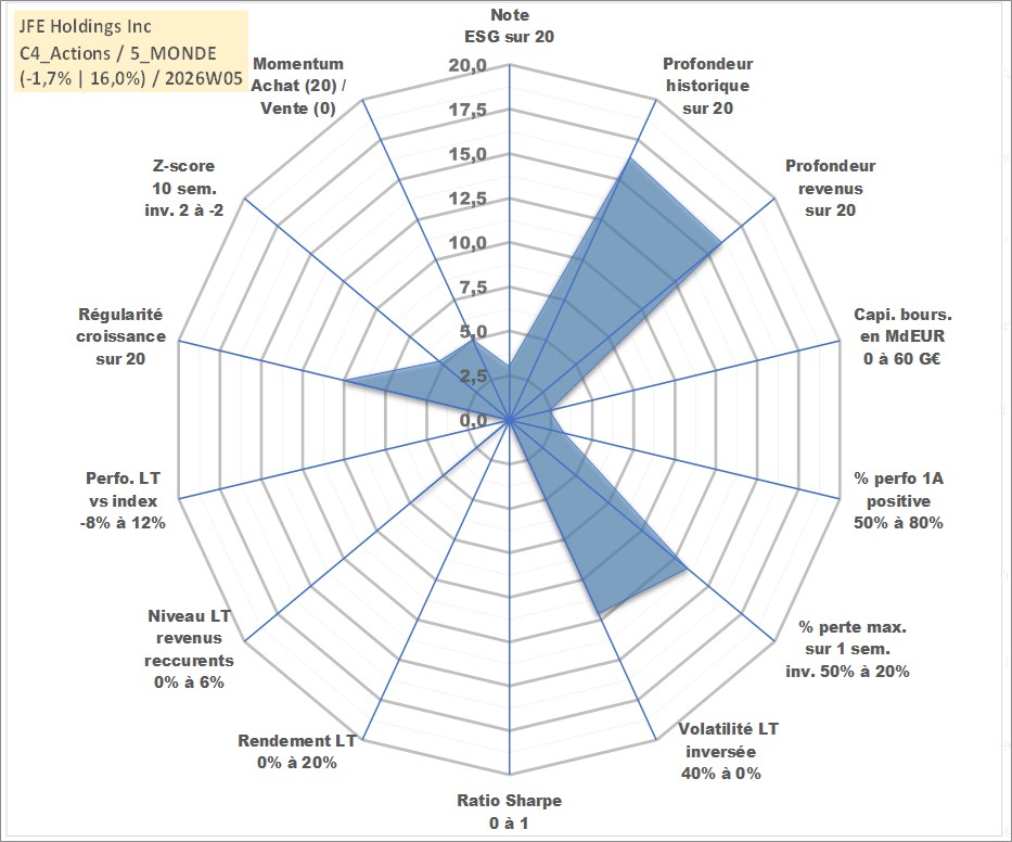 Site dédié aux investisseursPage dédiée sur site financeAnalyse des valorisations hebdomadaires de l'action JFE Holdings Inc. Cet actif est cote en JPY. Les valorisations sont en contrevaleur EURO et couvrent les semaines 2002W39 a 2026W05. Les revenus de cet actif financier sont pris en compte depuis la semaine 2003W13. La note globale ESG de cet actif est estimee a 3.0 (apres rebasage entre 0 et 20).