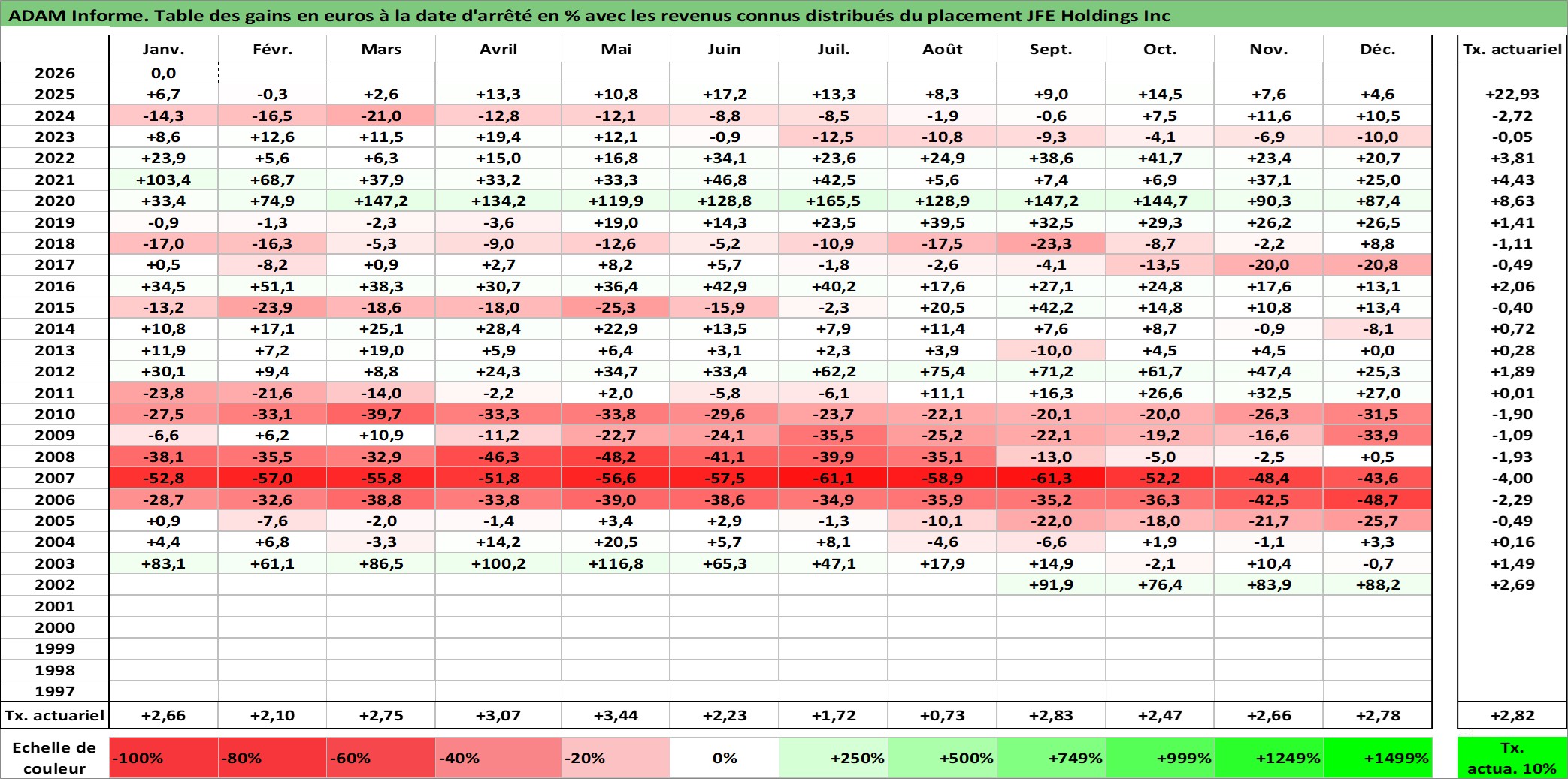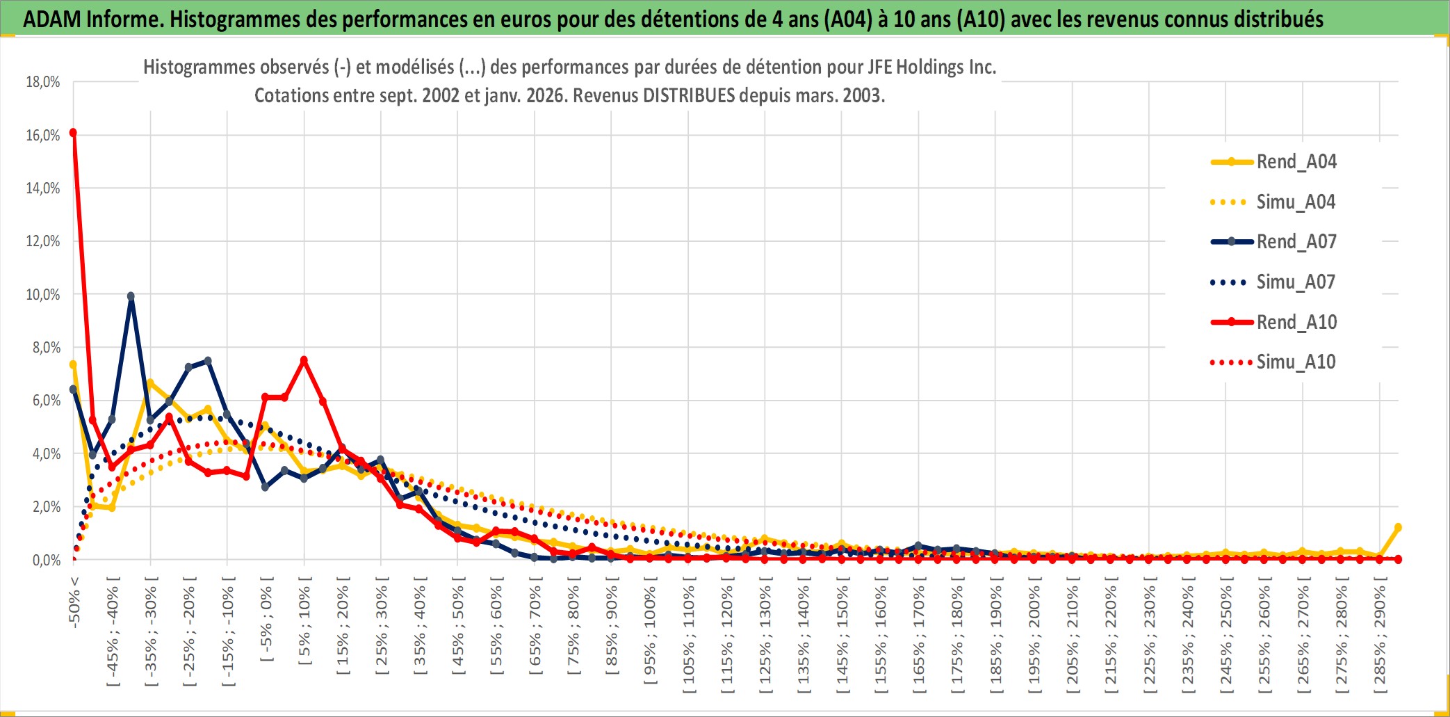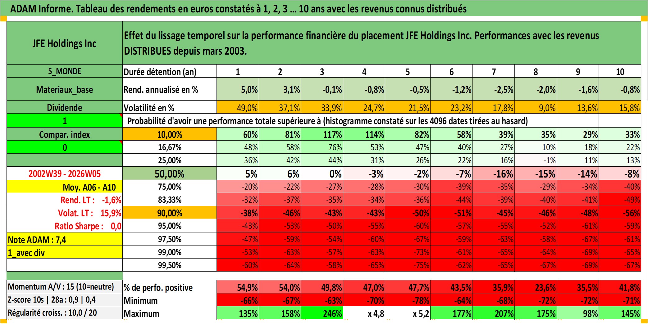 Site dédié aux investisseursPage dédiée sur site financeAnalyse des valorisations hebdomadaires de l'action JFE Holdings Inc. Cet actif est cote en JPY. Les valorisations sont en contrevaleur EURO et couvrent les semaines 2002W39 a 2026W05. Les revenus de cet actif financier sont pris en compte depuis la semaine 2003W13. La note globale ESG de cet actif est estimee a 3.0 (apres rebasage entre 0 et 20).
