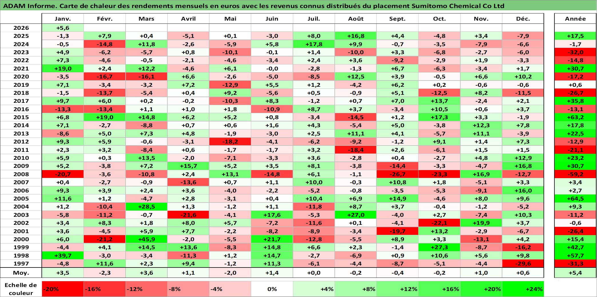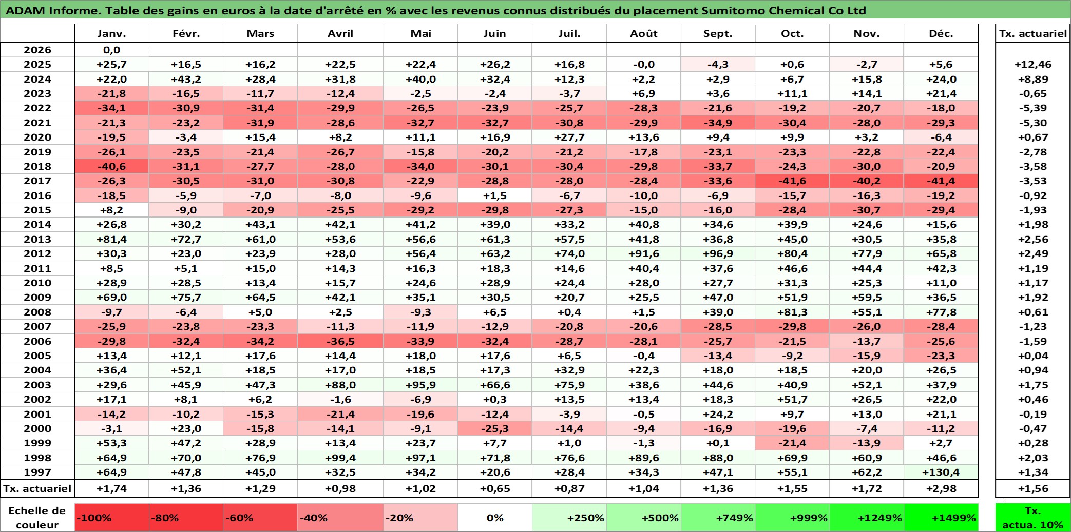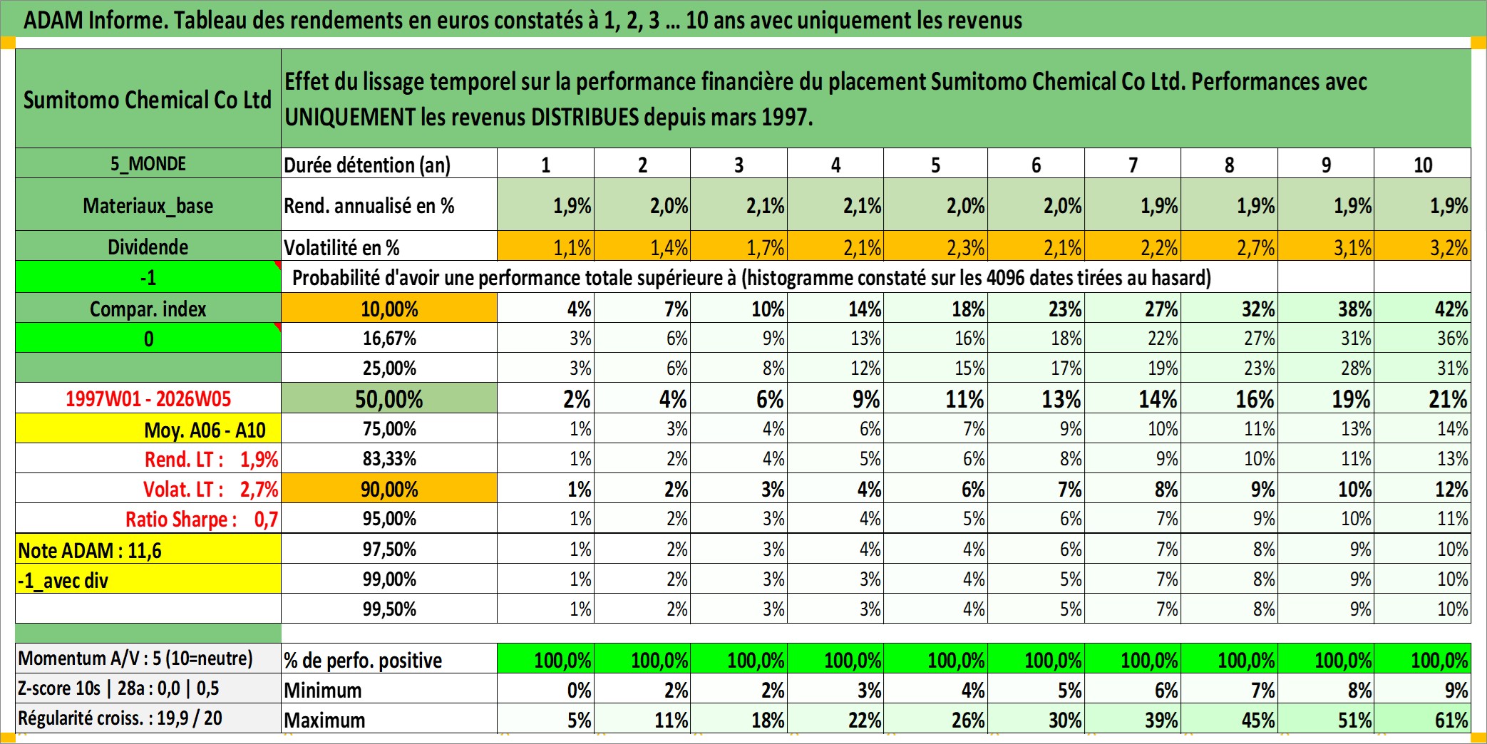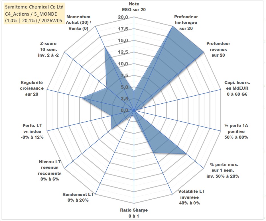 Site dédié aux investisseursPage dédiée sur site financeAnalyse des valorisations hebdomadaires de l'action Sumitomo Chemical Co Ltd. Cet actif est cote en JPY. Les valorisations sont en contrevaleur EURO et couvrent les semaines 1997W01 a 2026W05. Les revenus de cet actif financier sont pris en compte depuis la semaine 1997W13. La note globale ESG de cet actif est estimee a 4.0 (apres rebasage entre 0 et 20).
