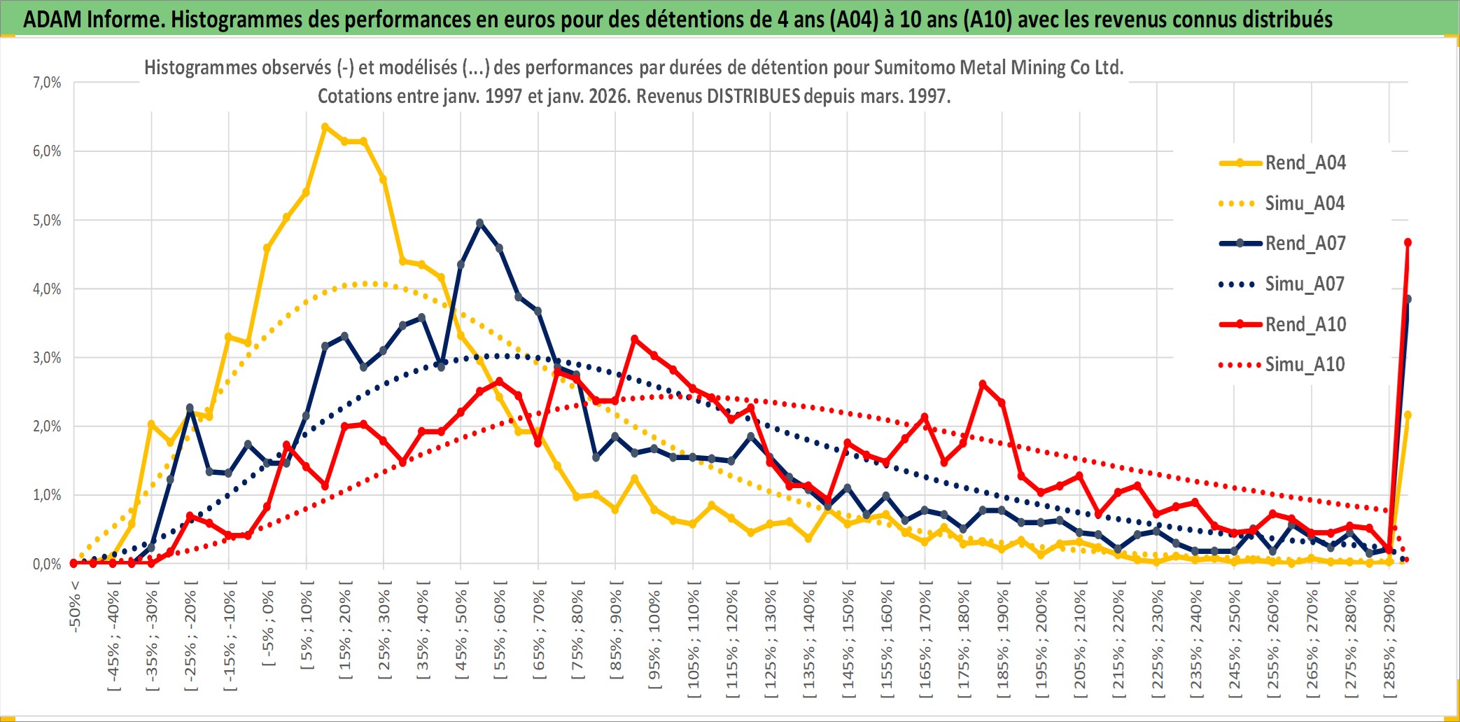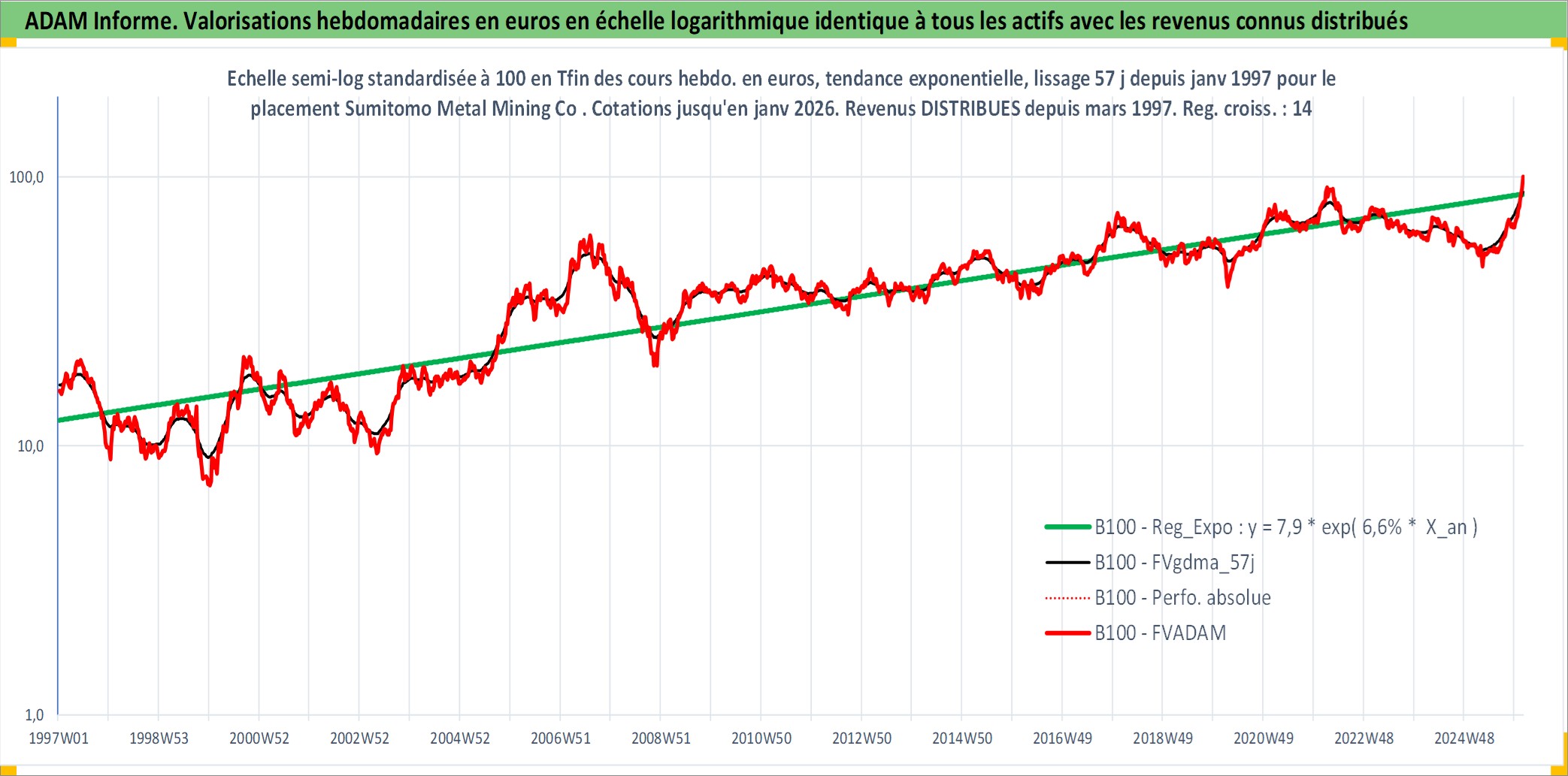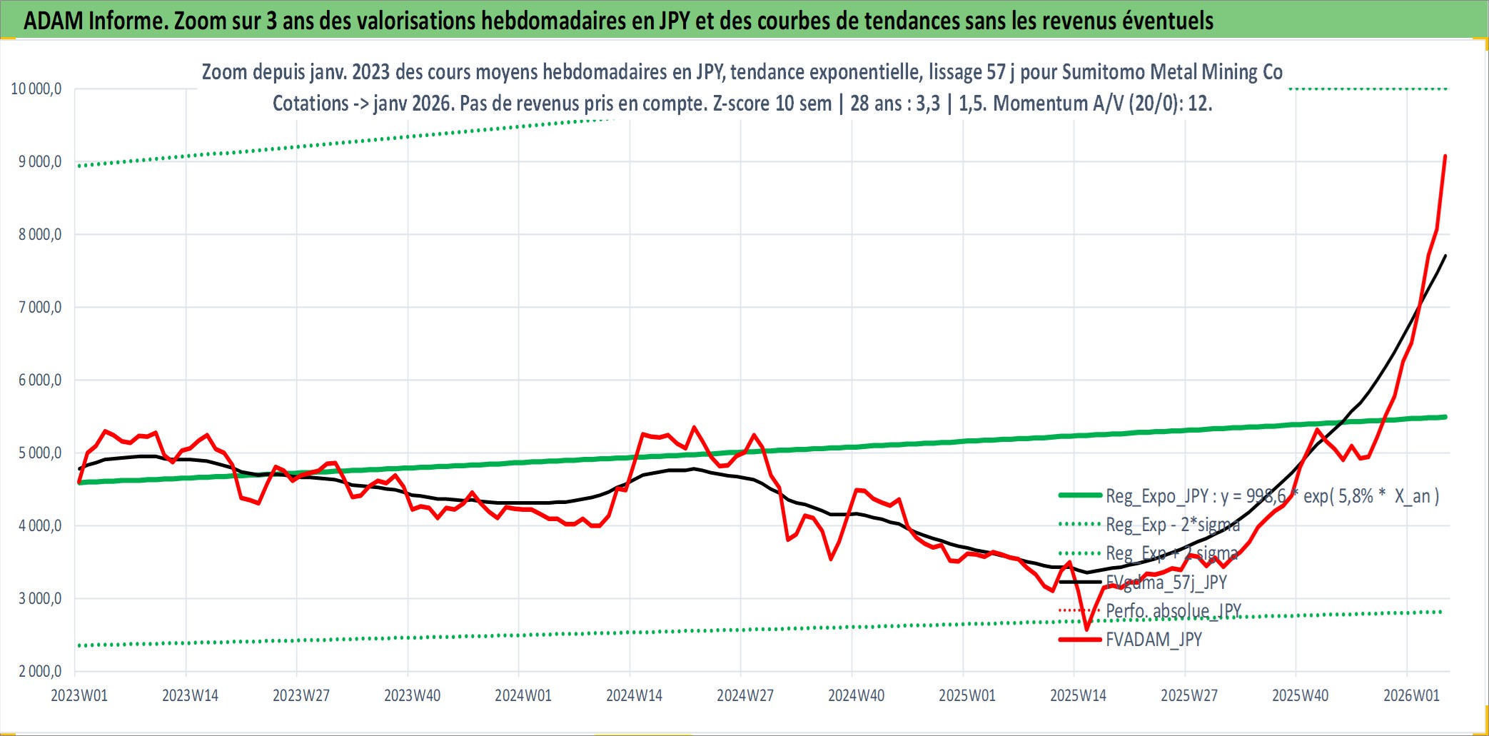 Site dédié aux investisseursPage dédiée sur site financeAnalyse des valorisations hebdomadaires de l'action Sumitomo Metal Mining Co Ltd. Cet actif est cote en JPY. Les valorisations sont en contrevaleur EURO et couvrent les semaines 1997W01 a 2026W05. Les revenus de cet actif financier sont pris en compte depuis la semaine 1997W13. La note globale ESG de cet actif est estimee a 3.0 (apres rebasage entre 0 et 20).