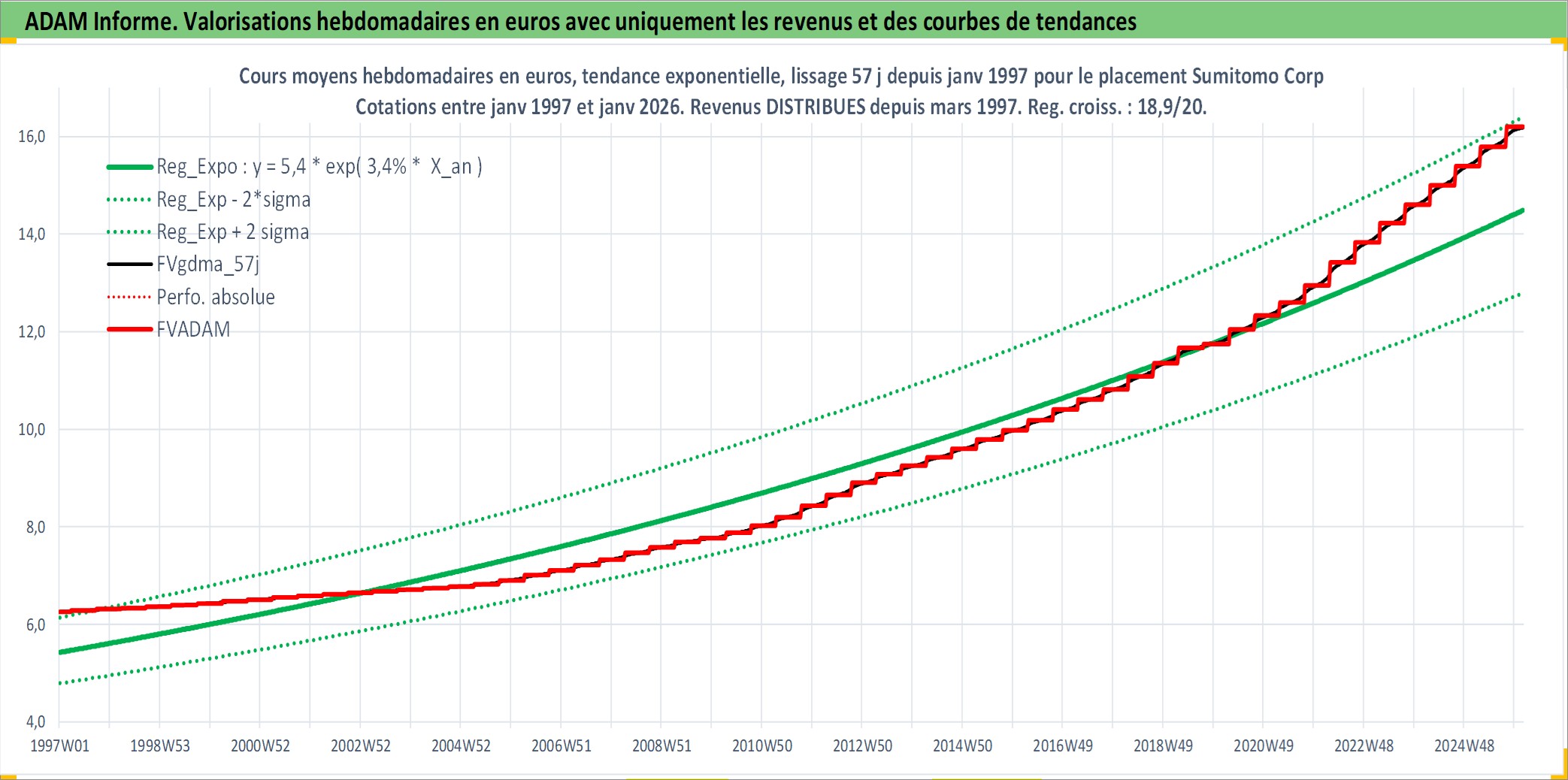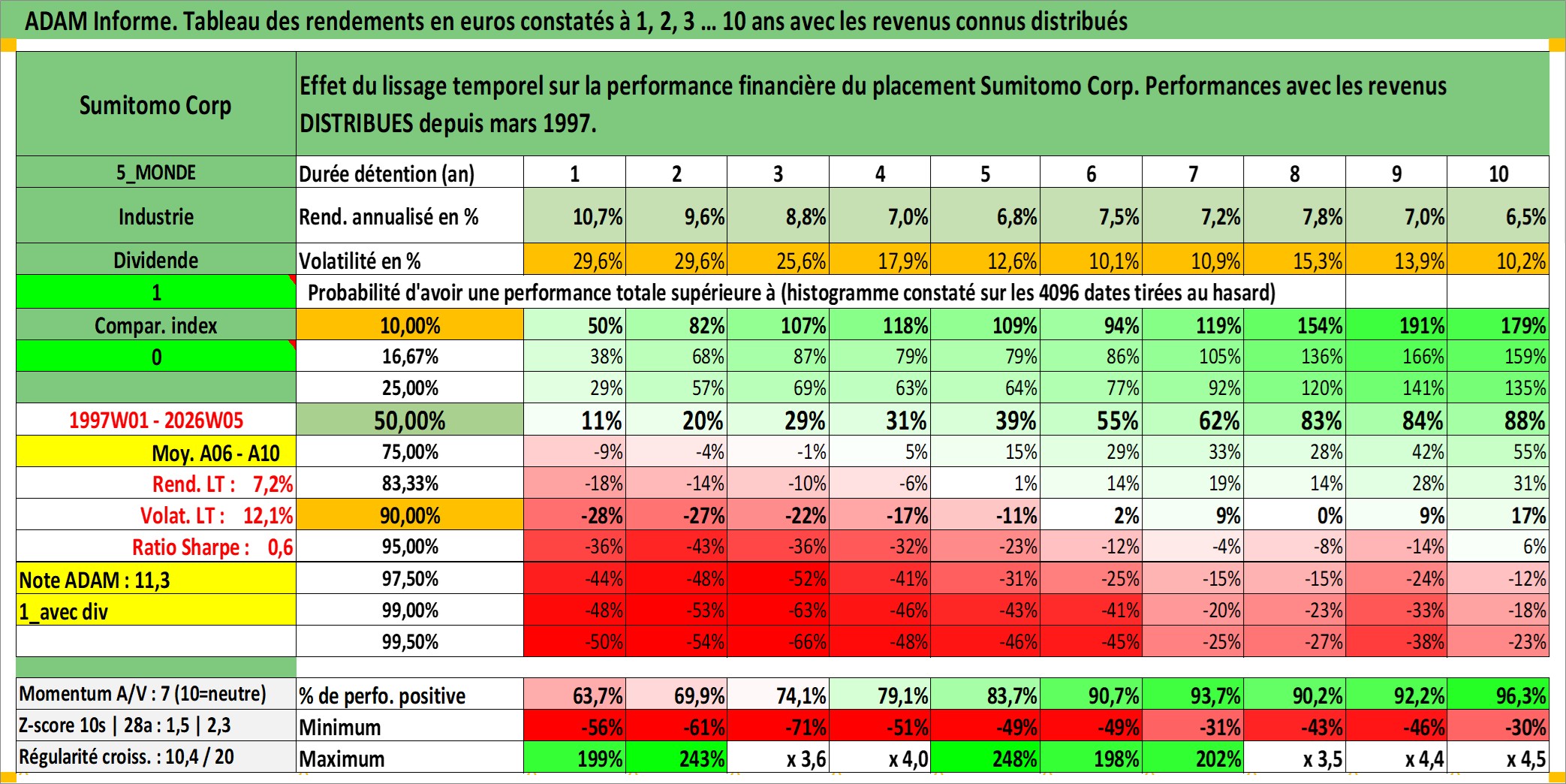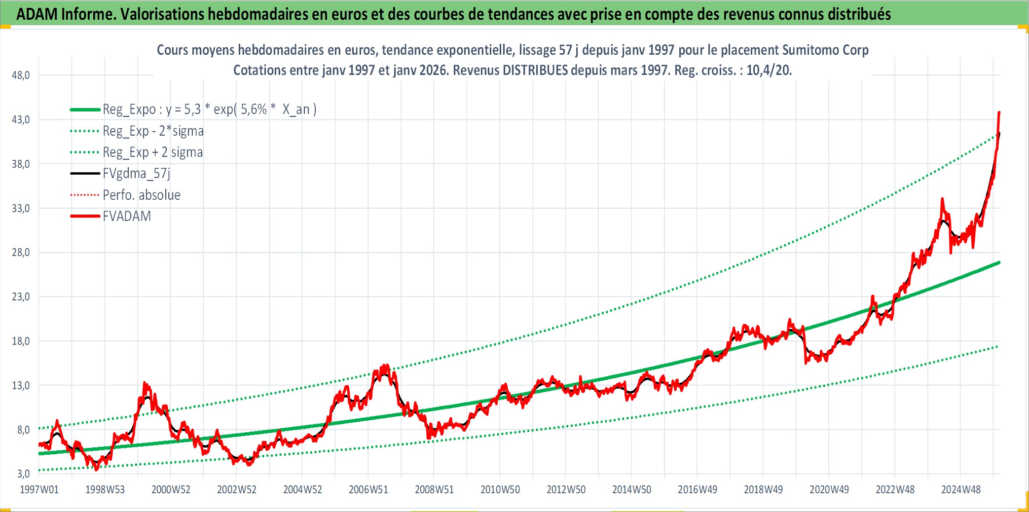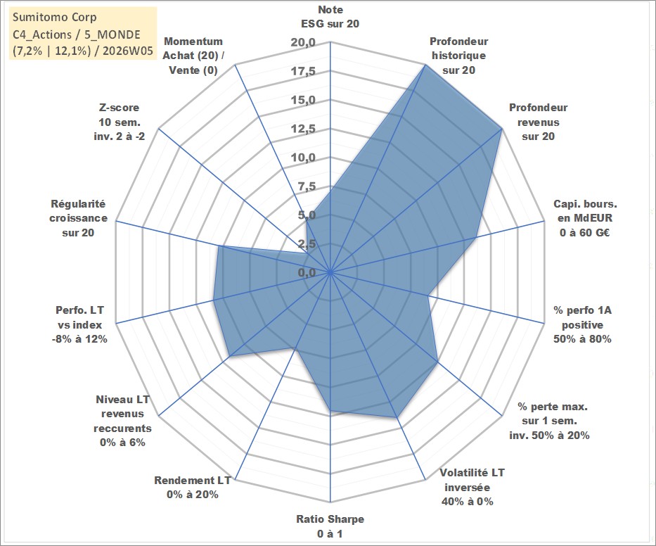 Site dédié aux investisseursPage dédiée sur site financeAnalyse des valorisations hebdomadaires de l'action Sumitomo Corp. Cet actif est cote en JPY. Les valorisations sont en contrevaleur EURO et couvrent les semaines 1997W01 a 2026W05. Les revenus de cet actif financier sont pris en compte depuis la semaine 1997W13. La note globale ESG de cet actif est estimee a 7.0 (apres rebasage entre 0 et 20).