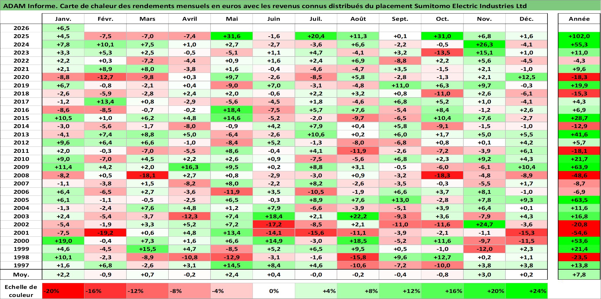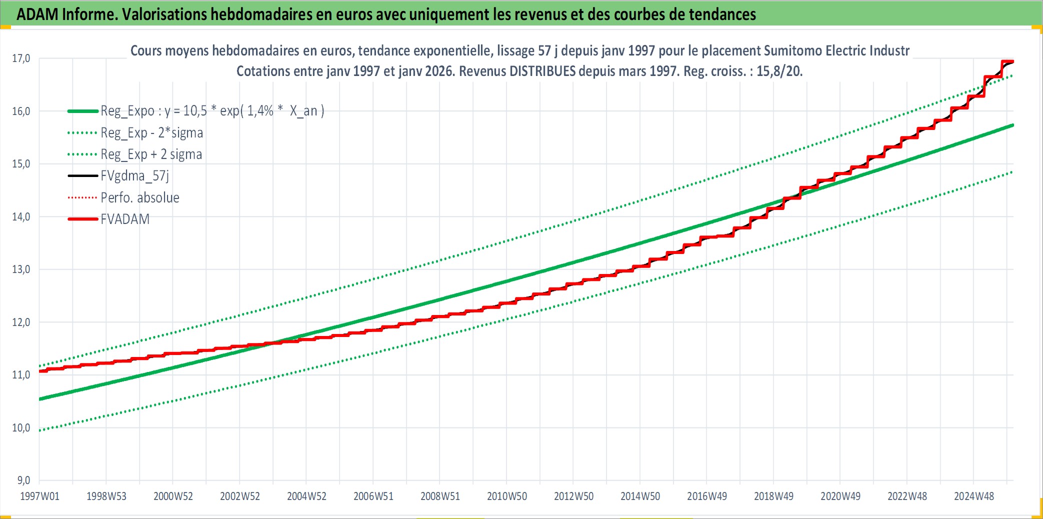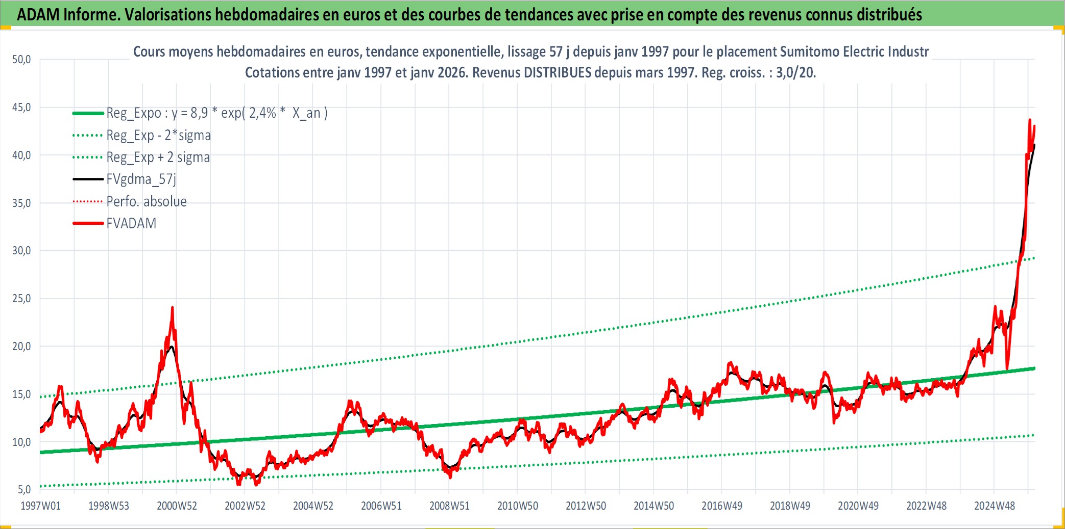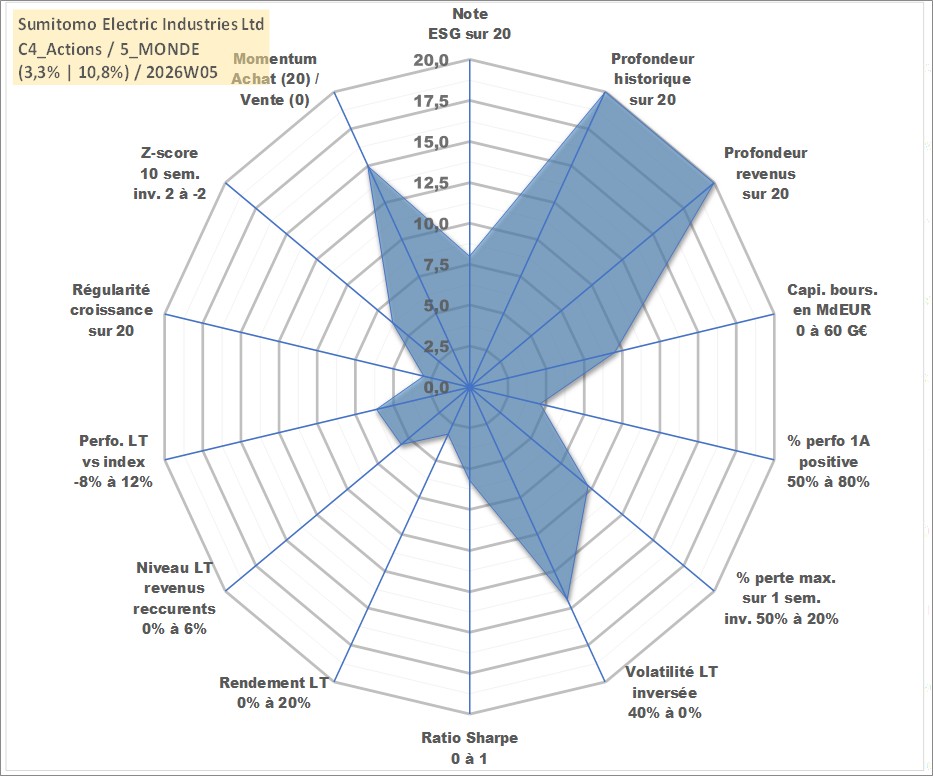 Site dédié aux investisseursPage dédiée sur site financeAnalyse des valorisations hebdomadaires de l'action Sumitomo Electric Industries Ltd. Cet actif est cote en JPY. Les valorisations sont en contrevaleur EURO et couvrent les semaines 1997W01 a 2026W05. Les revenus de cet actif financier sont pris en compte depuis la semaine 1997W13. La note globale ESG de cet actif est estimee a 8.0 (apres rebasage entre 0 et 20).