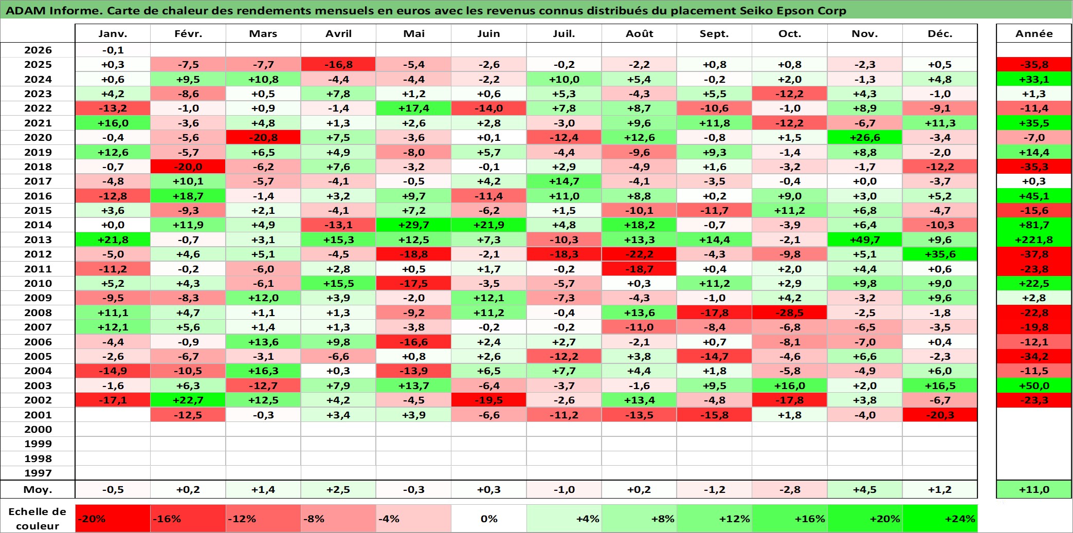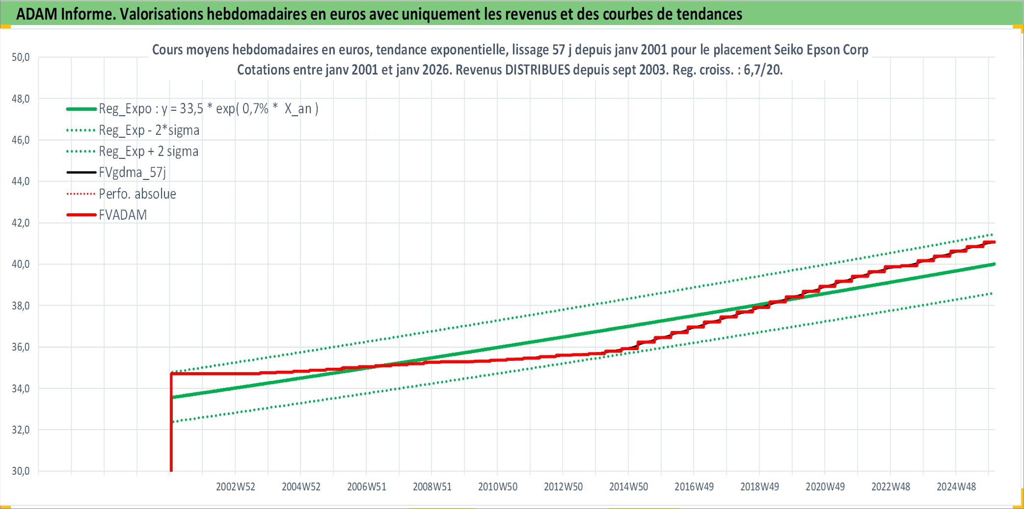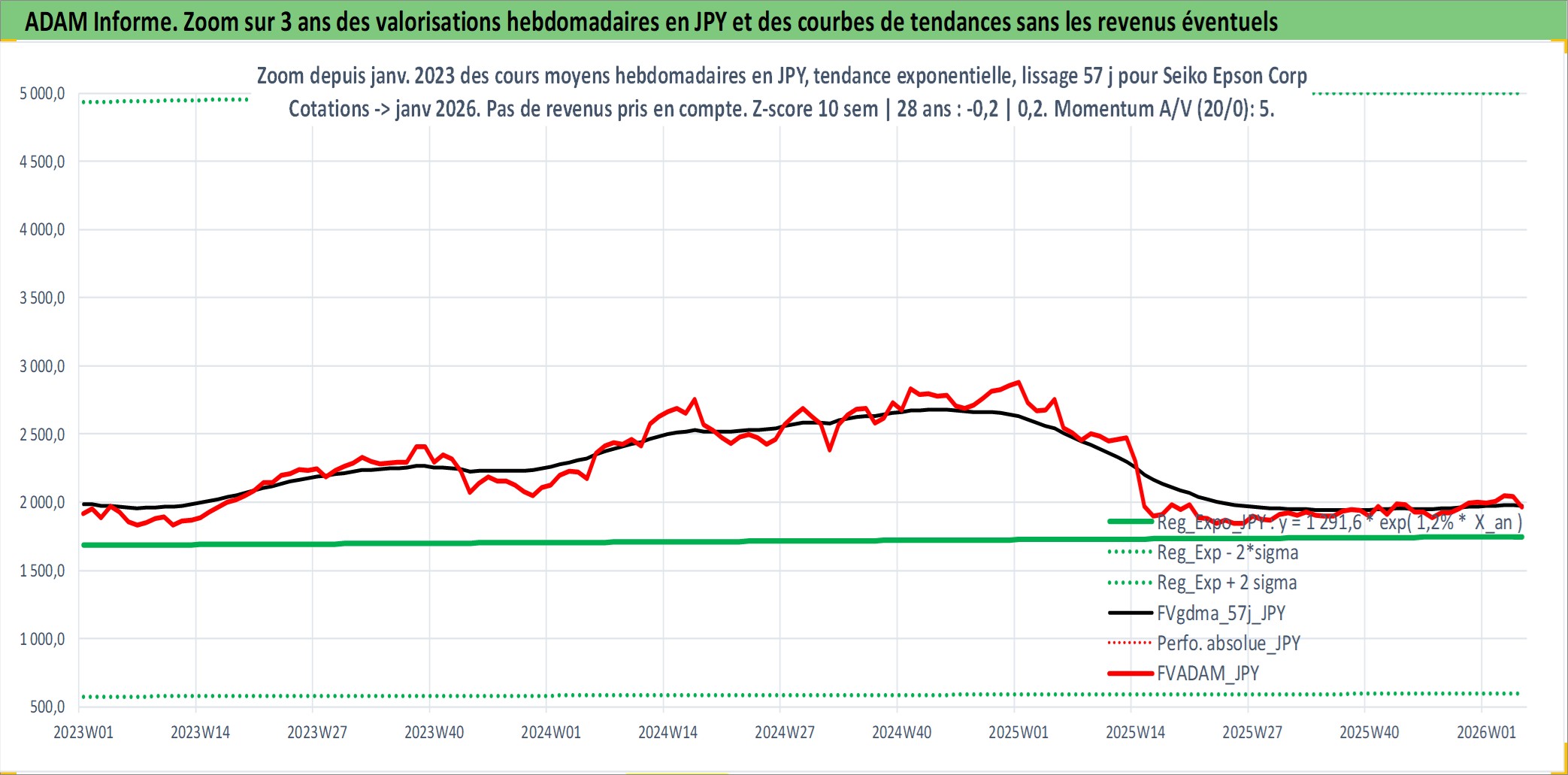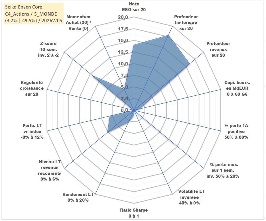 Site dédié aux investisseursPage dédiée sur site financeAnalyse des valorisations hebdomadaires de l'action Seiko Epson Corp. Cet actif est cote en JPY. Les valorisations sont en contrevaleur EURO et couvrent les semaines 2001W02 a 2026W05. Les revenus de cet actif financier sont pris en compte depuis la semaine 2003W39. La note globale ESG de cet actif est estimee a 14.0 (apres rebasage entre 0 et 20).