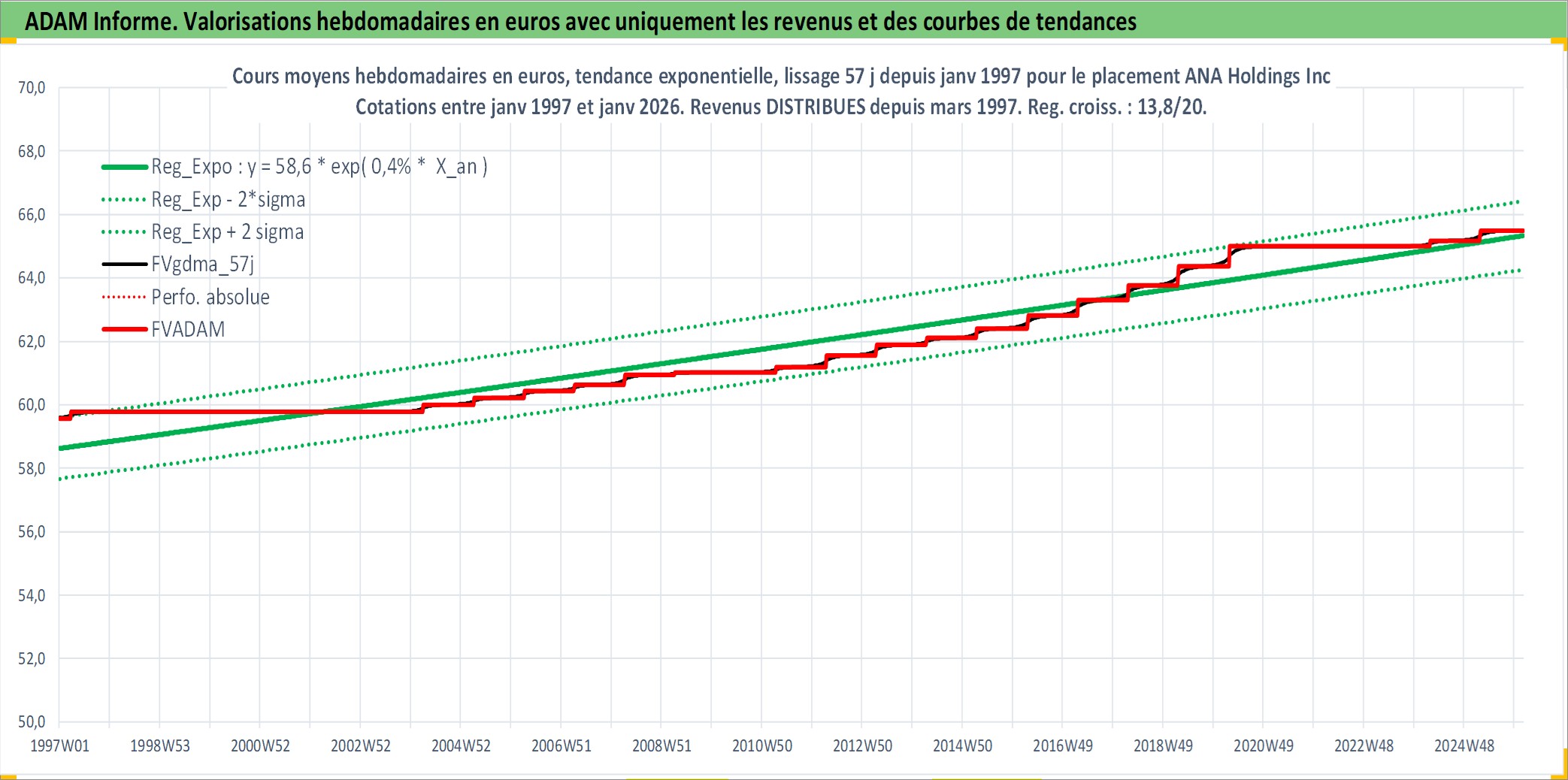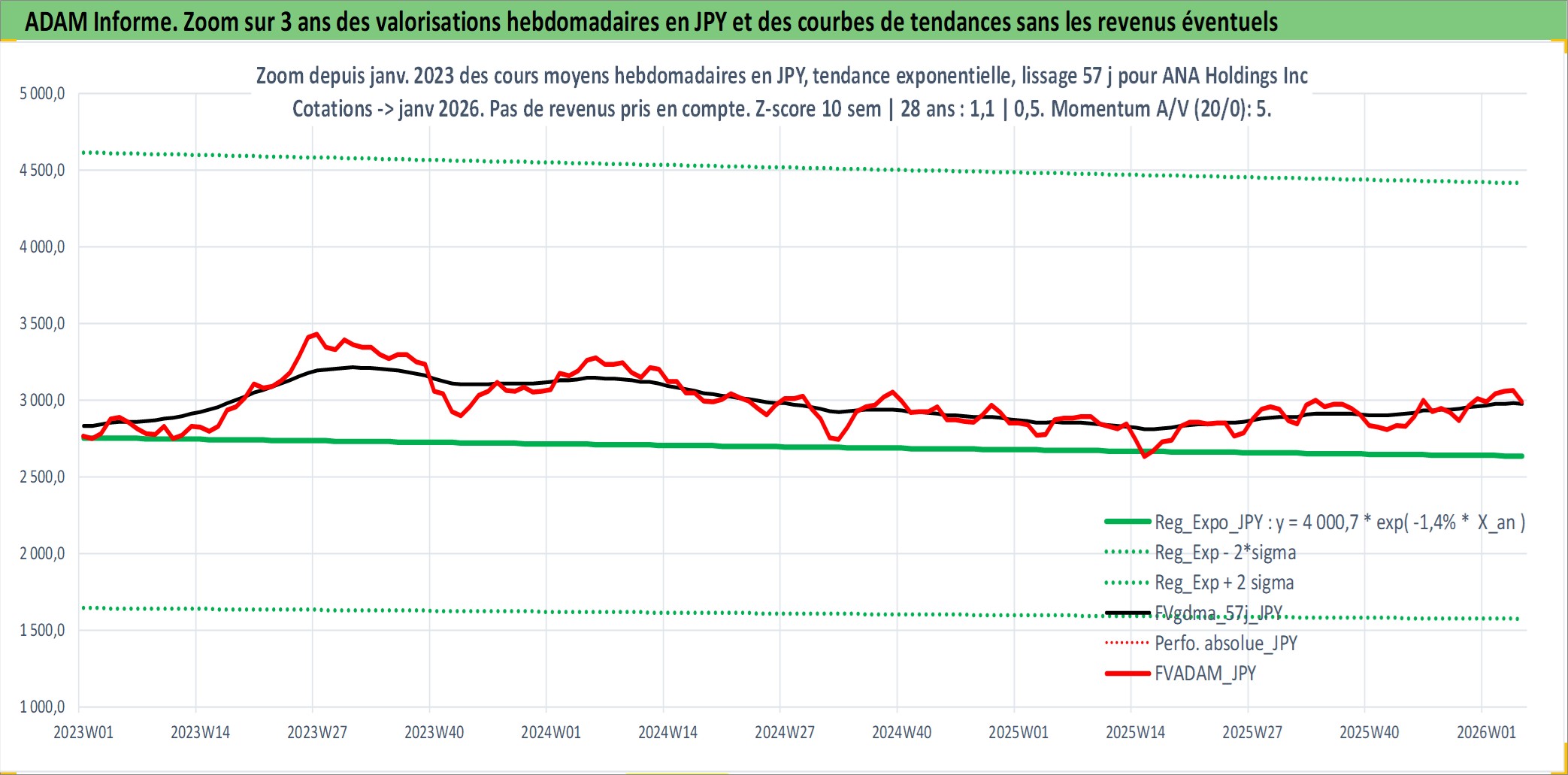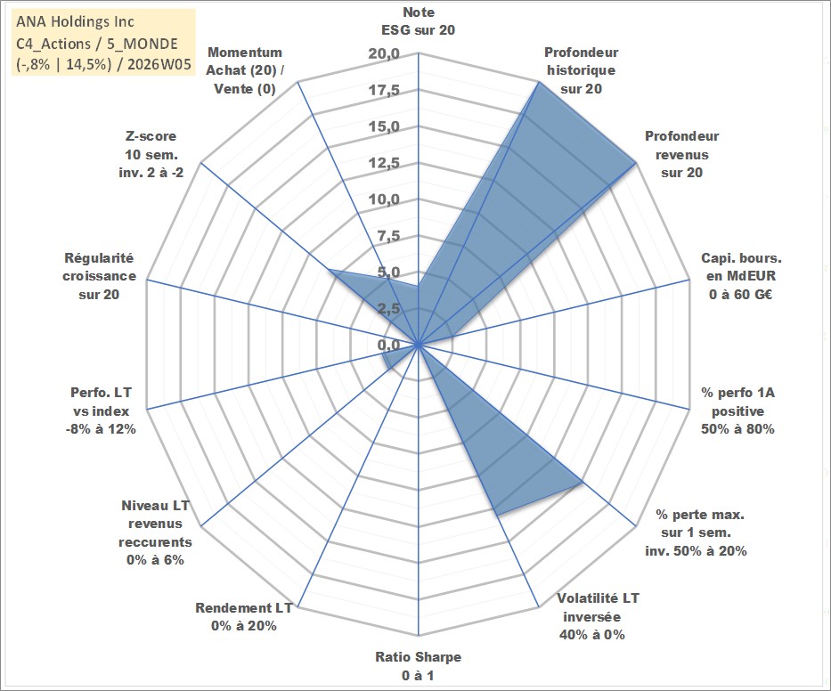 Site dédié aux investisseursPage dédiée sur site financeAnalyse des valorisations hebdomadaires de l'action ANA Holdings Inc. Cet actif est cote en JPY. Les valorisations sont en contrevaleur EURO et couvrent les semaines 1997W01 a 2026W05. Les revenus de cet actif financier sont pris en compte depuis la semaine 1997W13. La note globale ESG de cet actif est estimee a 4.0 (apres rebasage entre 0 et 20).