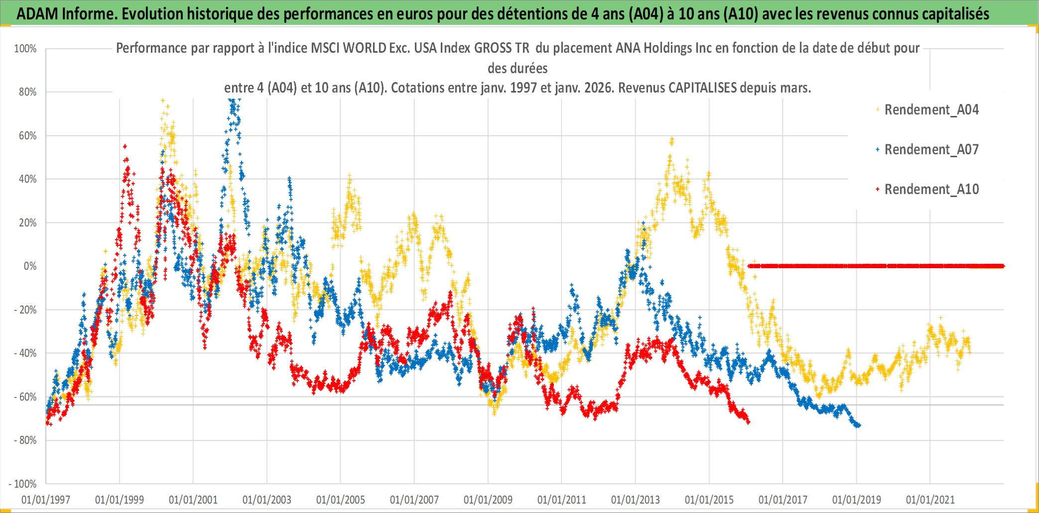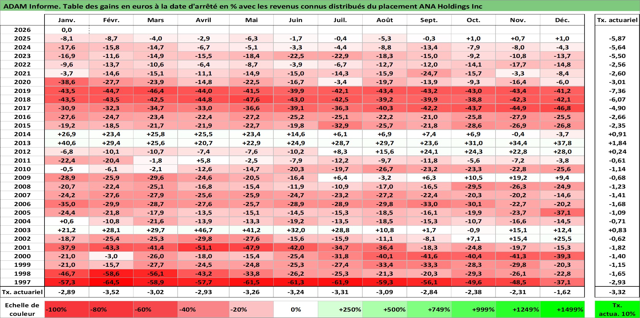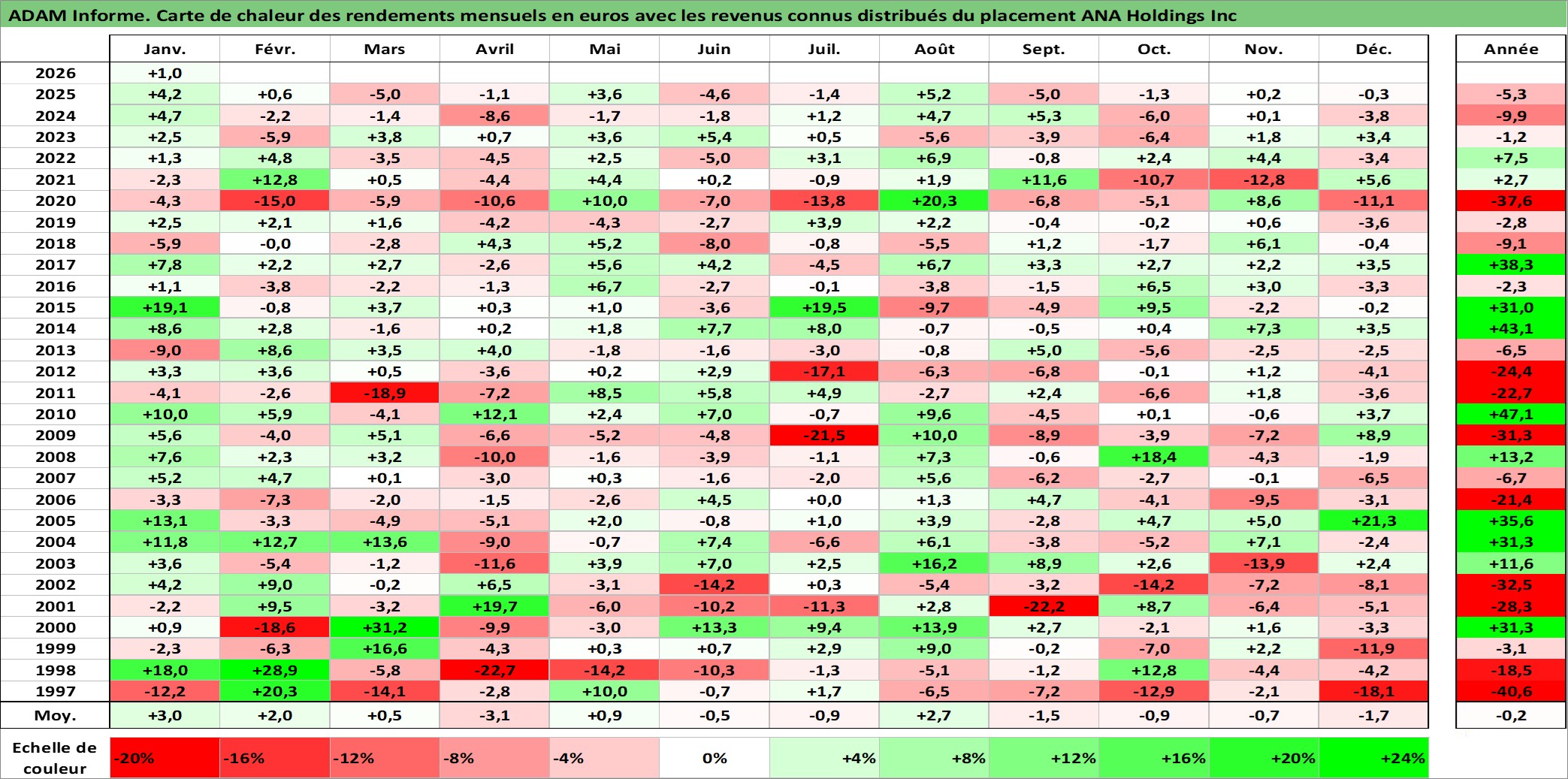 Site dédié aux investisseursPage dédiée sur site financeAnalyse des valorisations hebdomadaires de l'action ANA Holdings Inc. Cet actif est cote en JPY. Les valorisations sont en contrevaleur EURO et couvrent les semaines 1997W01 a 2026W05. Les revenus de cet actif financier sont pris en compte depuis la semaine 1997W13. La note globale ESG de cet actif est estimee a 4.0 (apres rebasage entre 0 et 20).