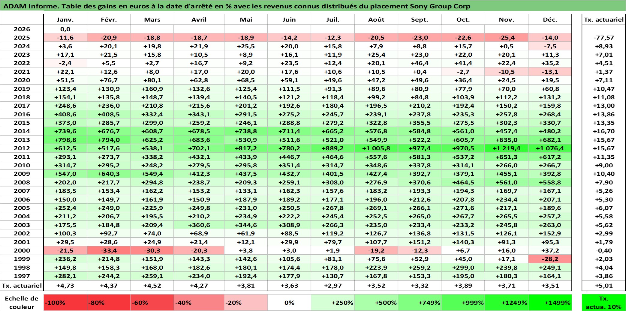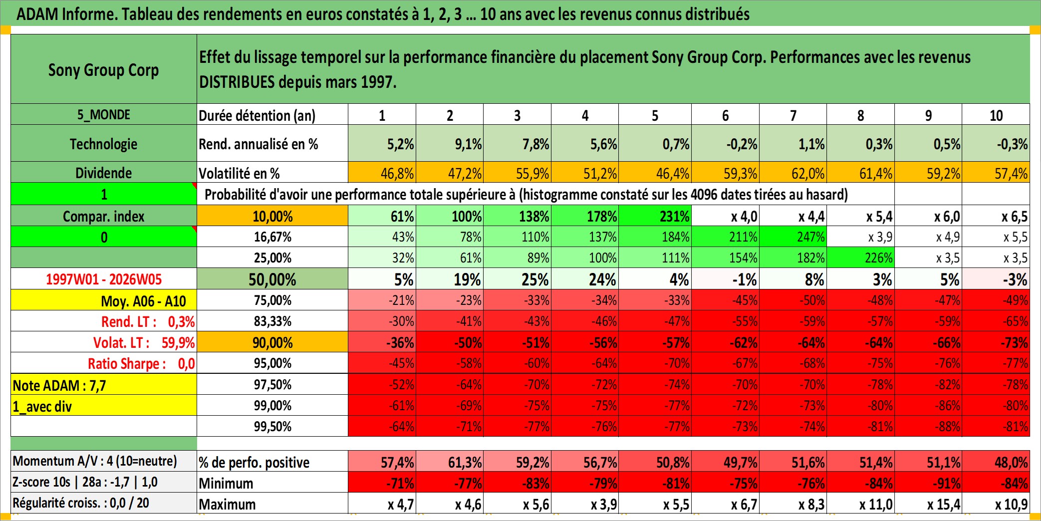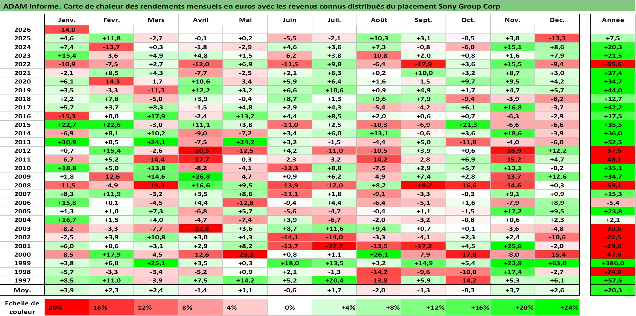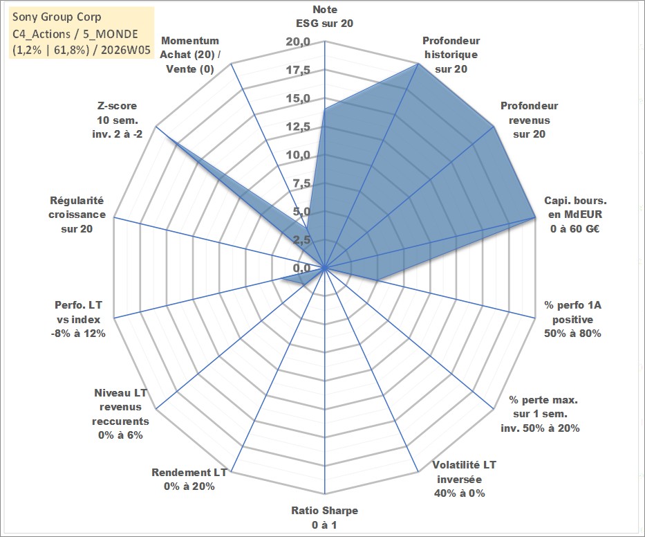Site dédié aux investisseursPage dédiée sur site financeAnalyse des valorisations hebdomadaires de l'action Sony Group Corp. Cet actif est cote en JPY. Les valorisations sont en contrevaleur EURO et couvrent les semaines 1997W01 a 2026W05. Les revenus de cet actif financier sont pris en compte depuis la semaine 1997W13. La note globale ESG de cet actif est estimee a 14.0 (apres rebasage entre 0 et 20).