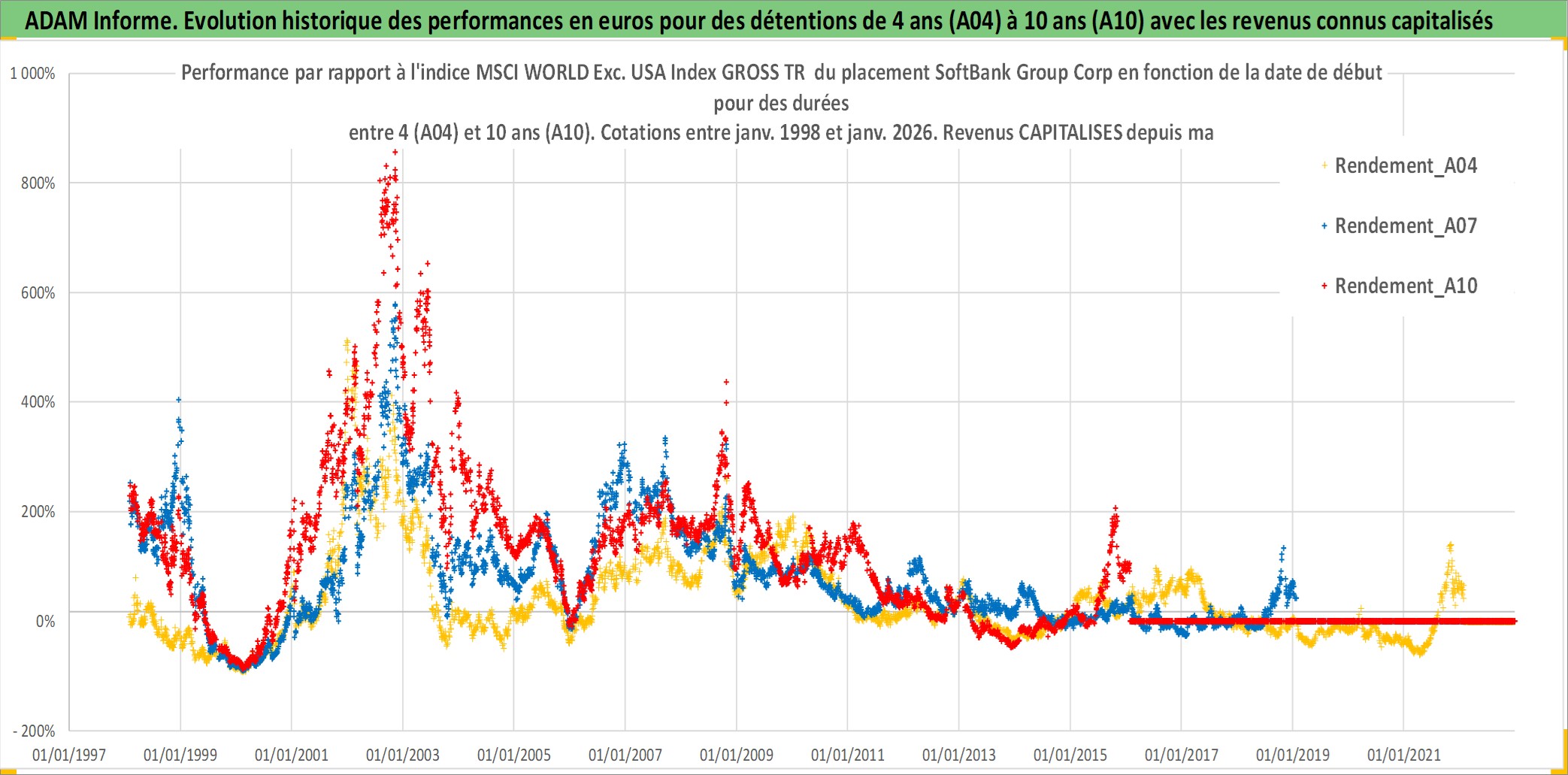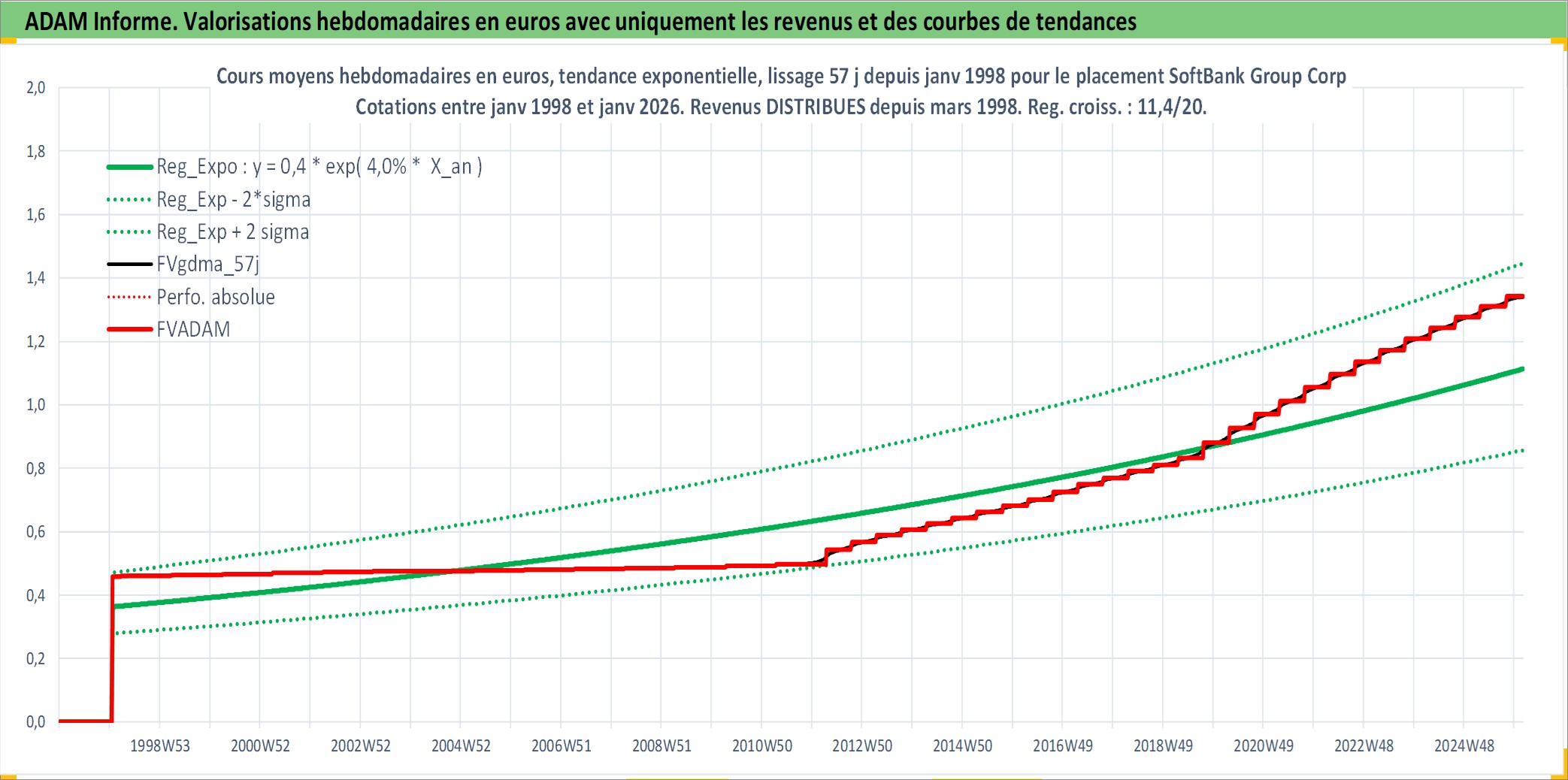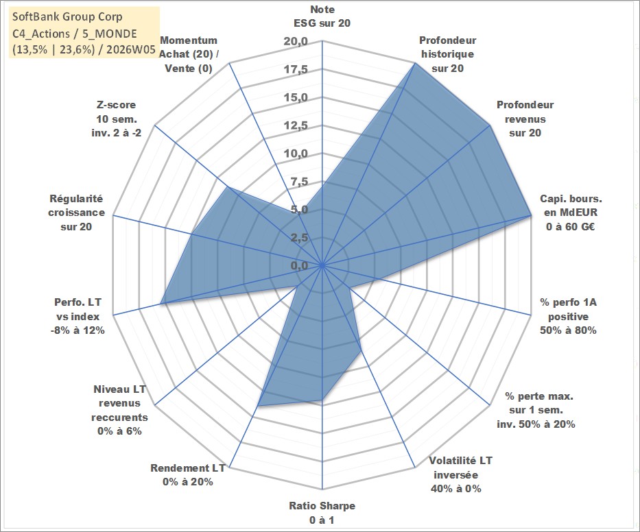 Site dédié aux investisseursPage dédiée sur site financeAnalyse des valorisations hebdomadaires de l'action SoftBank Group Corp. Cet actif est cote en JPY. Les valorisations sont en contrevaleur EURO et couvrent les semaines 1998W04 a 2026W05. Les revenus de cet actif financier sont pris en compte depuis la semaine 1998W13. La note globale ESG de cet actif est estimee a 7.0 (apres rebasage entre 0 et 20).