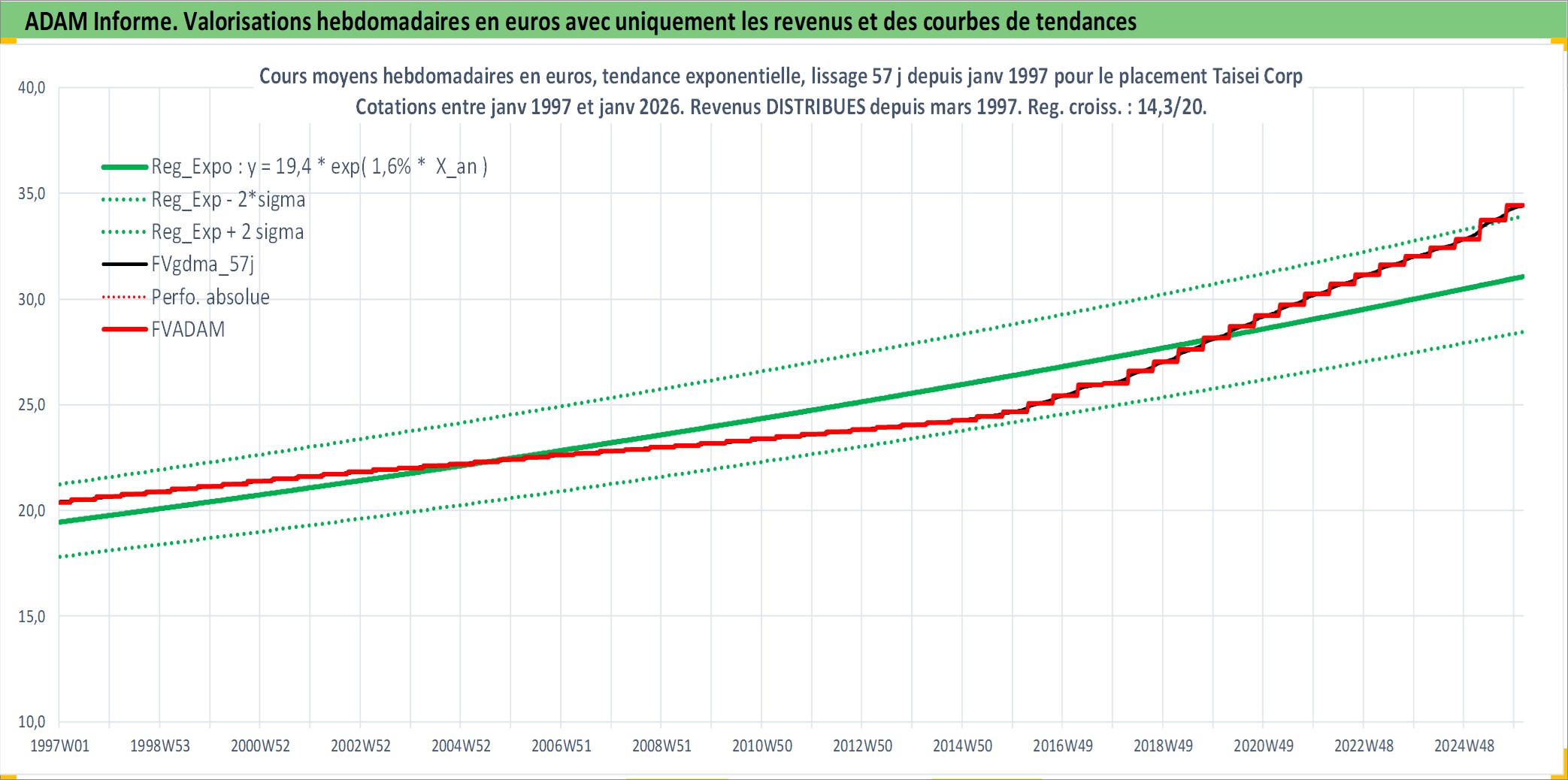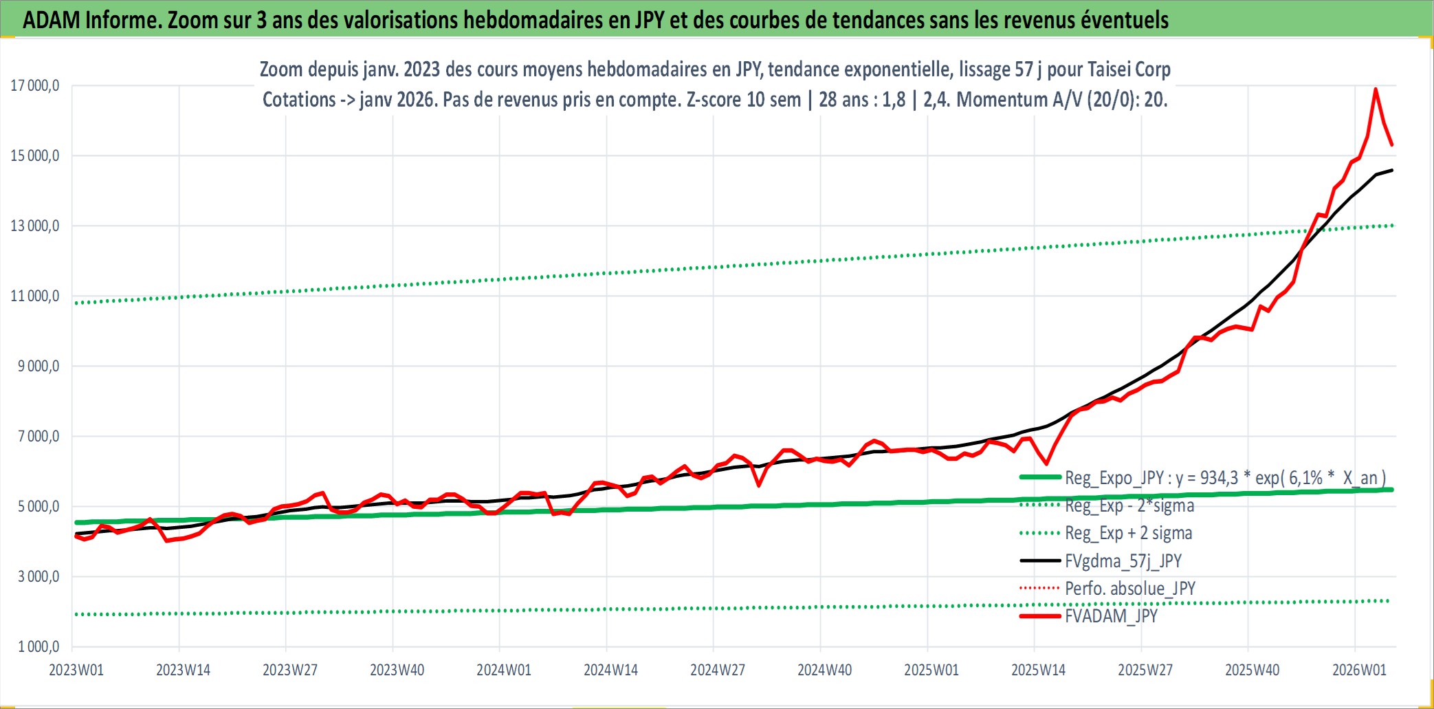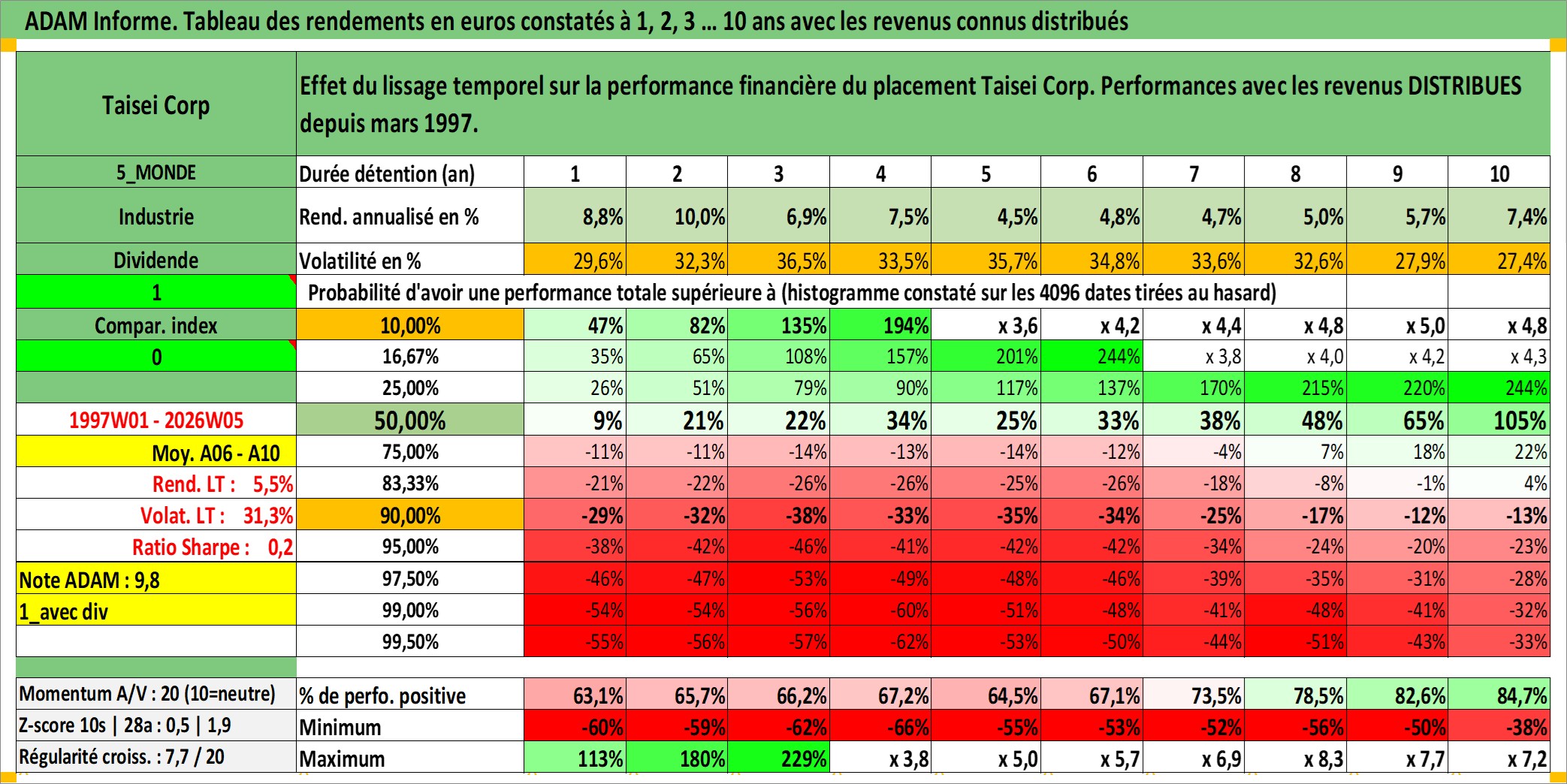 Site dédié aux investisseursPage dédiée sur site financeAnalyse des valorisations hebdomadaires de l'action Taisei Corp. Cet actif est cote en JPY. Les valorisations sont en contrevaleur EURO et couvrent les semaines 1997W01 a 2026W05. Les revenus de cet actif financier sont pris en compte depuis la semaine 1997W13. La note globale ESG de cet actif est estimee a 6.0 (apres rebasage entre 0 et 20).