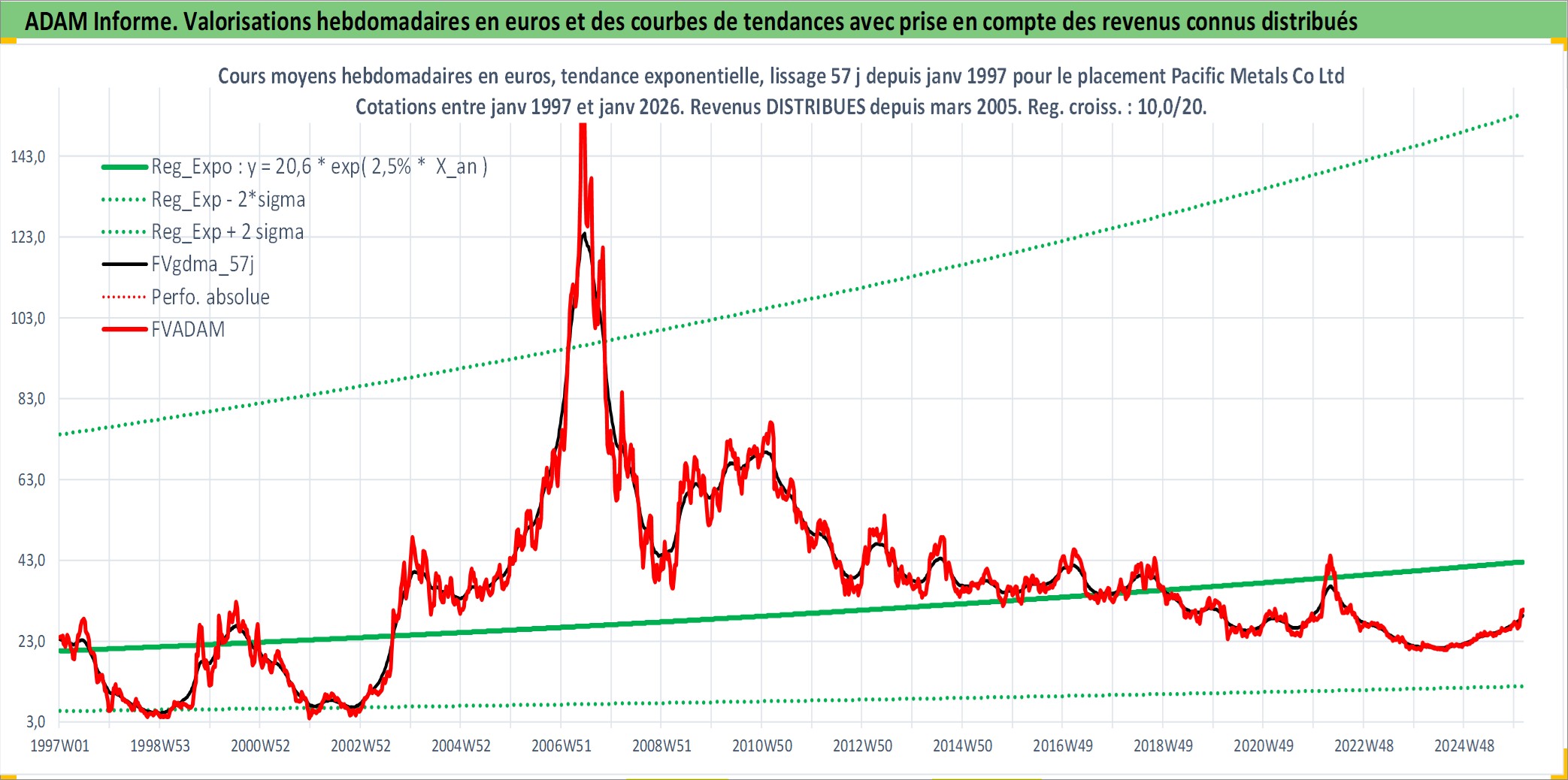 Site dédié aux investisseursPage dédiée sur site financeAnalyse des valorisations hebdomadaires de l'action Pacific Metals Co Ltd. Cet actif est cote en JPY. Les valorisations sont en contrevaleur EURO et couvrent les semaines 1997W01 a 2026W05. Les revenus de cet actif financier sont pris en compte depuis la semaine 2005W13. La note ESG de cet actif n'est pas connue.