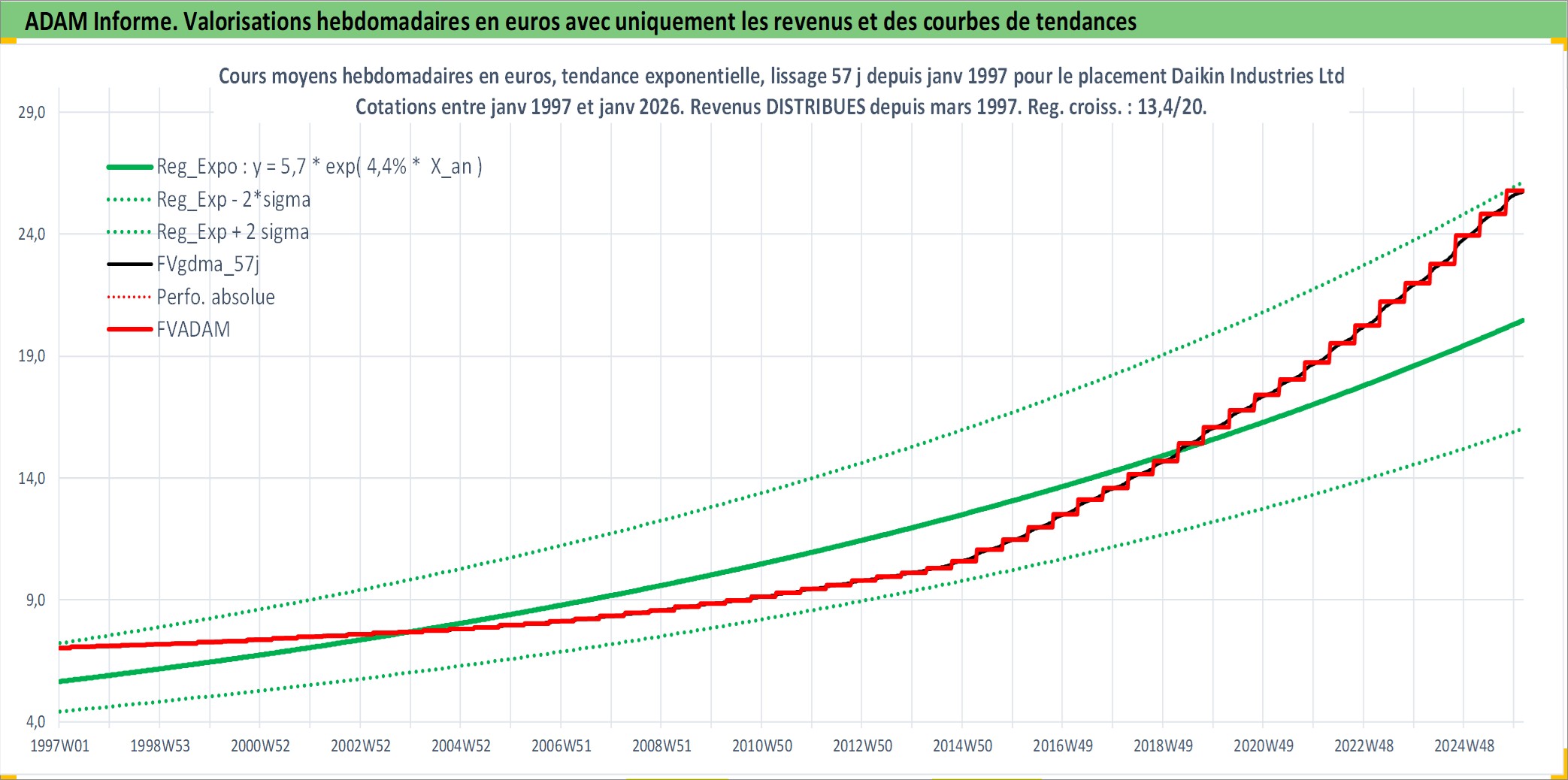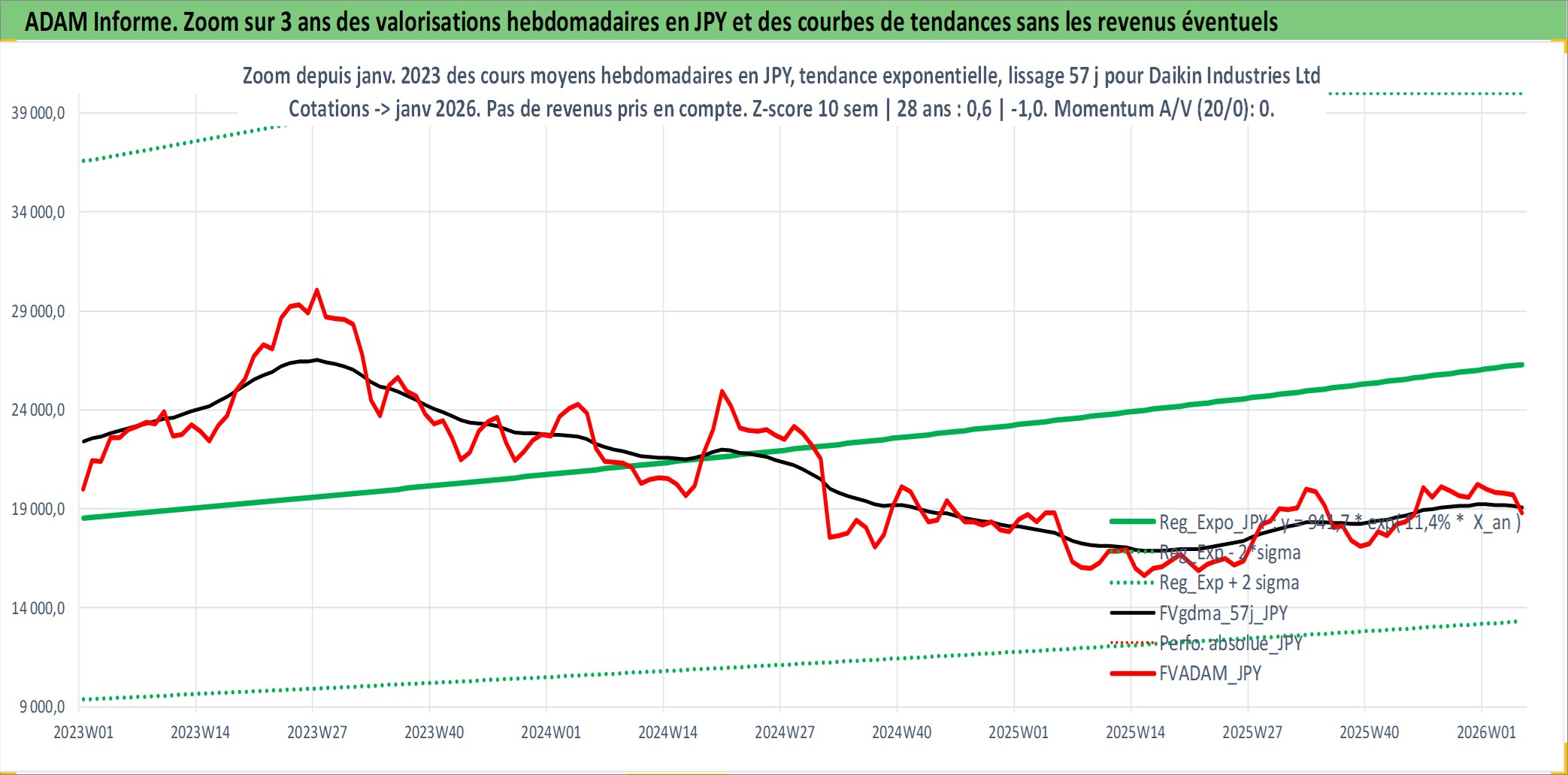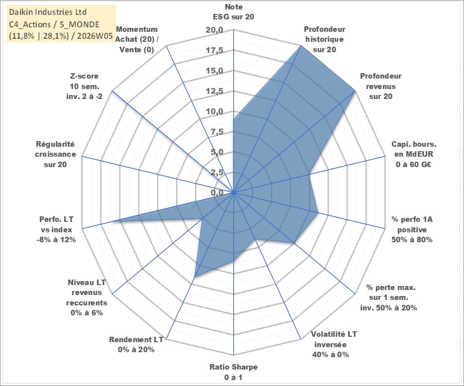 Site dédié aux investisseursPage dédiée sur site financeAnalyse des valorisations hebdomadaires de l'action Daikin Industries Ltd. Cet actif est cote en JPY. Les valorisations sont en contrevaleur EURO et couvrent les semaines 1997W01 a 2026W05. Les revenus de cet actif financier sont pris en compte depuis la semaine 1997W13. La note globale ESG de cet actif est estimee a 9.0 (apres rebasage entre 0 et 20).
