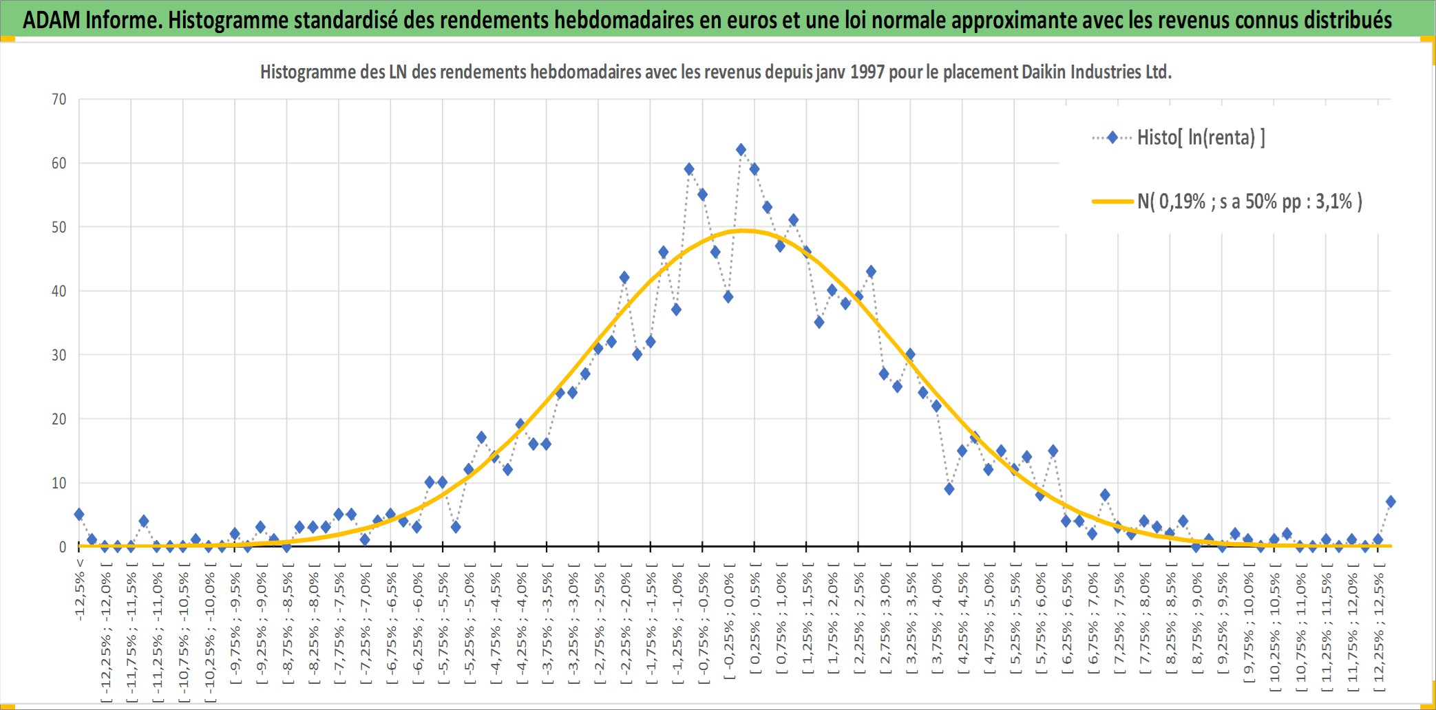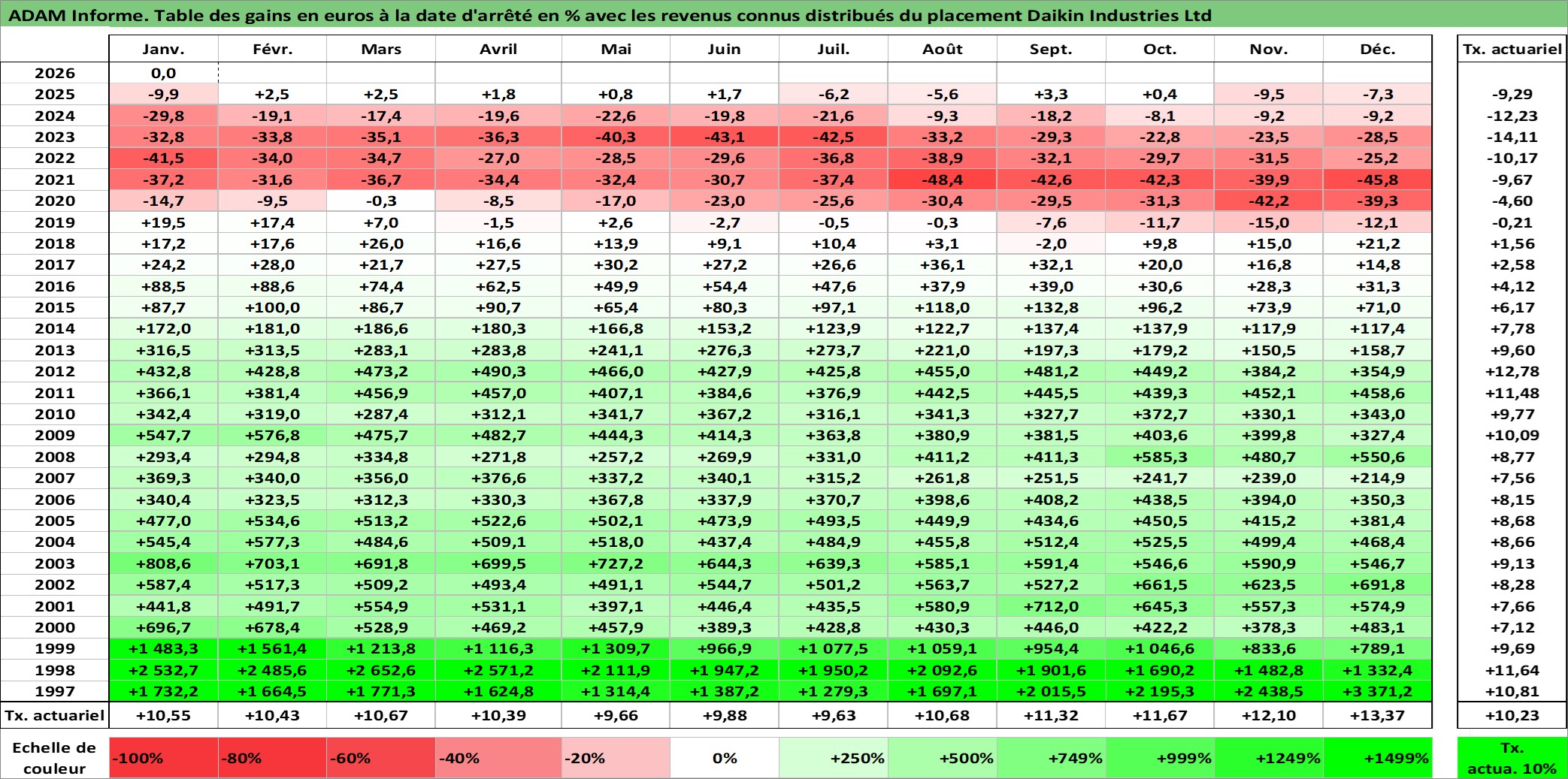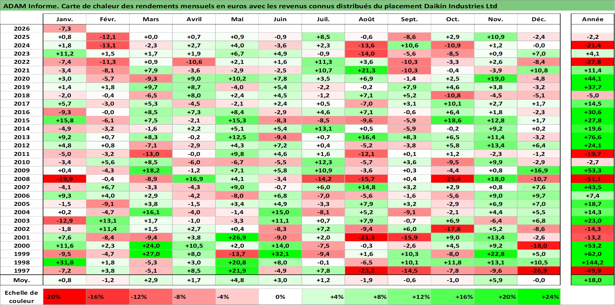 Site dédié aux investisseursPage dédiée sur site financeAnalyse des valorisations hebdomadaires de l'action Daikin Industries Ltd. Cet actif est cote en JPY. Les valorisations sont en contrevaleur EURO et couvrent les semaines 1997W01 a 2026W05. Les revenus de cet actif financier sont pris en compte depuis la semaine 1997W13. La note globale ESG de cet actif est estimee a 9.0 (apres rebasage entre 0 et 20).