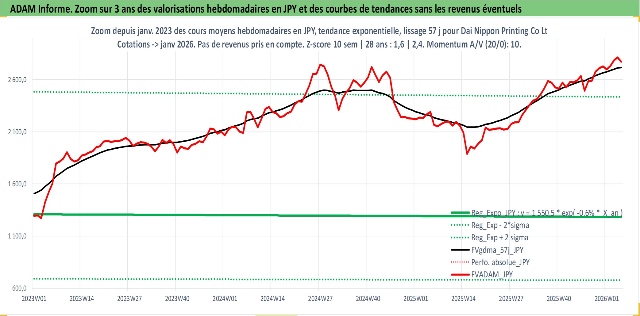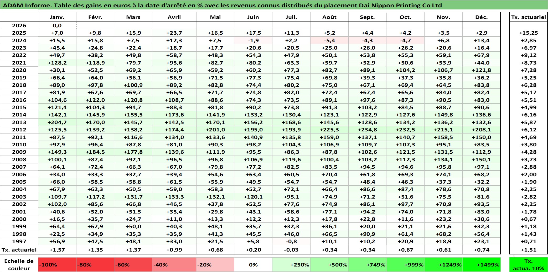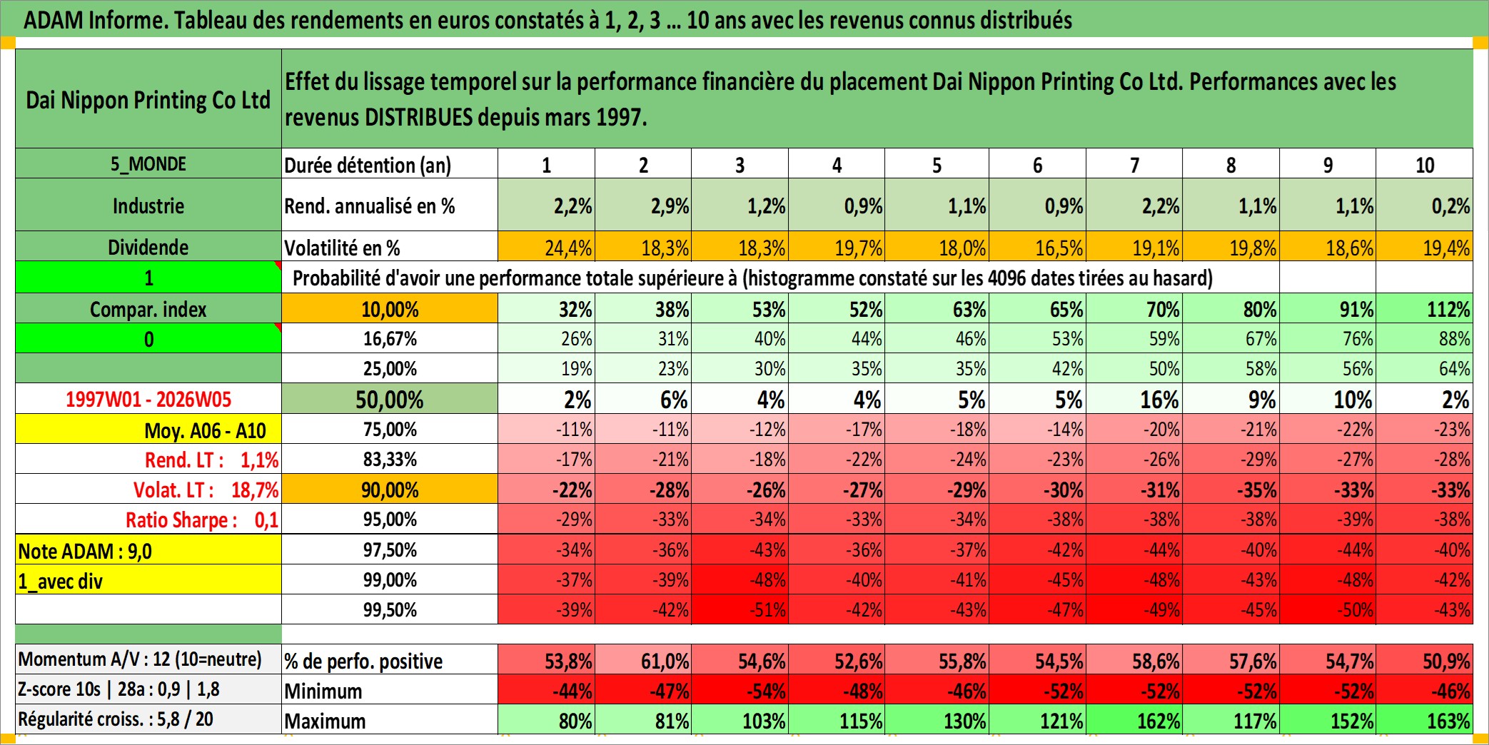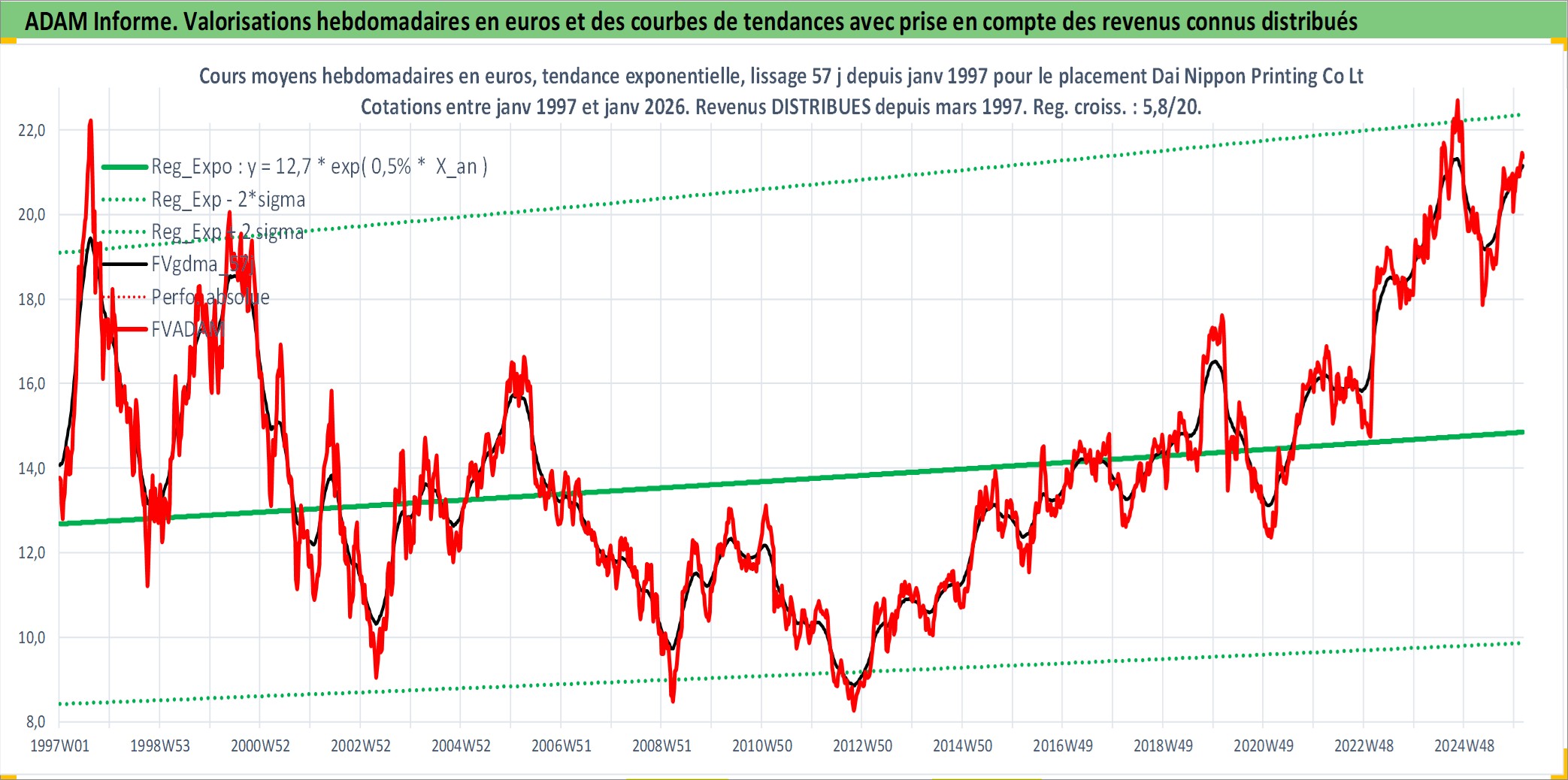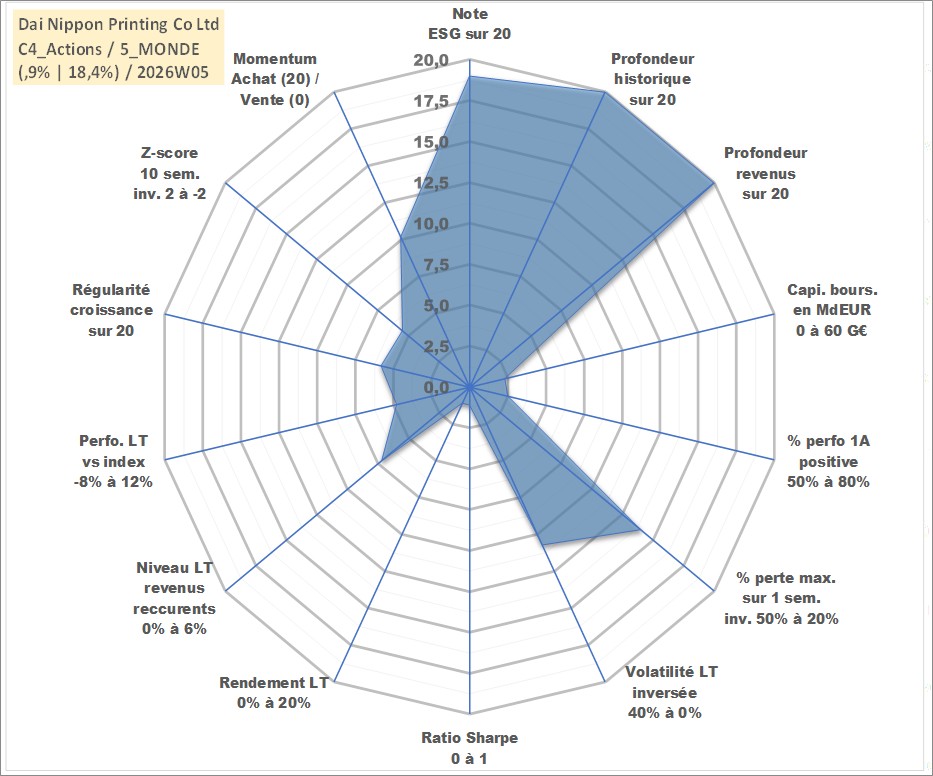 Site dédié aux investisseursPage dédiée sur site financeAnalyse des valorisations hebdomadaires de l'action Dai Nippon Printing Co Ltd. Cet actif est cote en JPY. Les valorisations sont en contrevaleur EURO et couvrent les semaines 1997W01 a 2026W05. Les revenus de cet actif financier sont pris en compte depuis la semaine 1997W13. La note globale ESG de cet actif est estimee a 19.0 (apres rebasage entre 0 et 20).