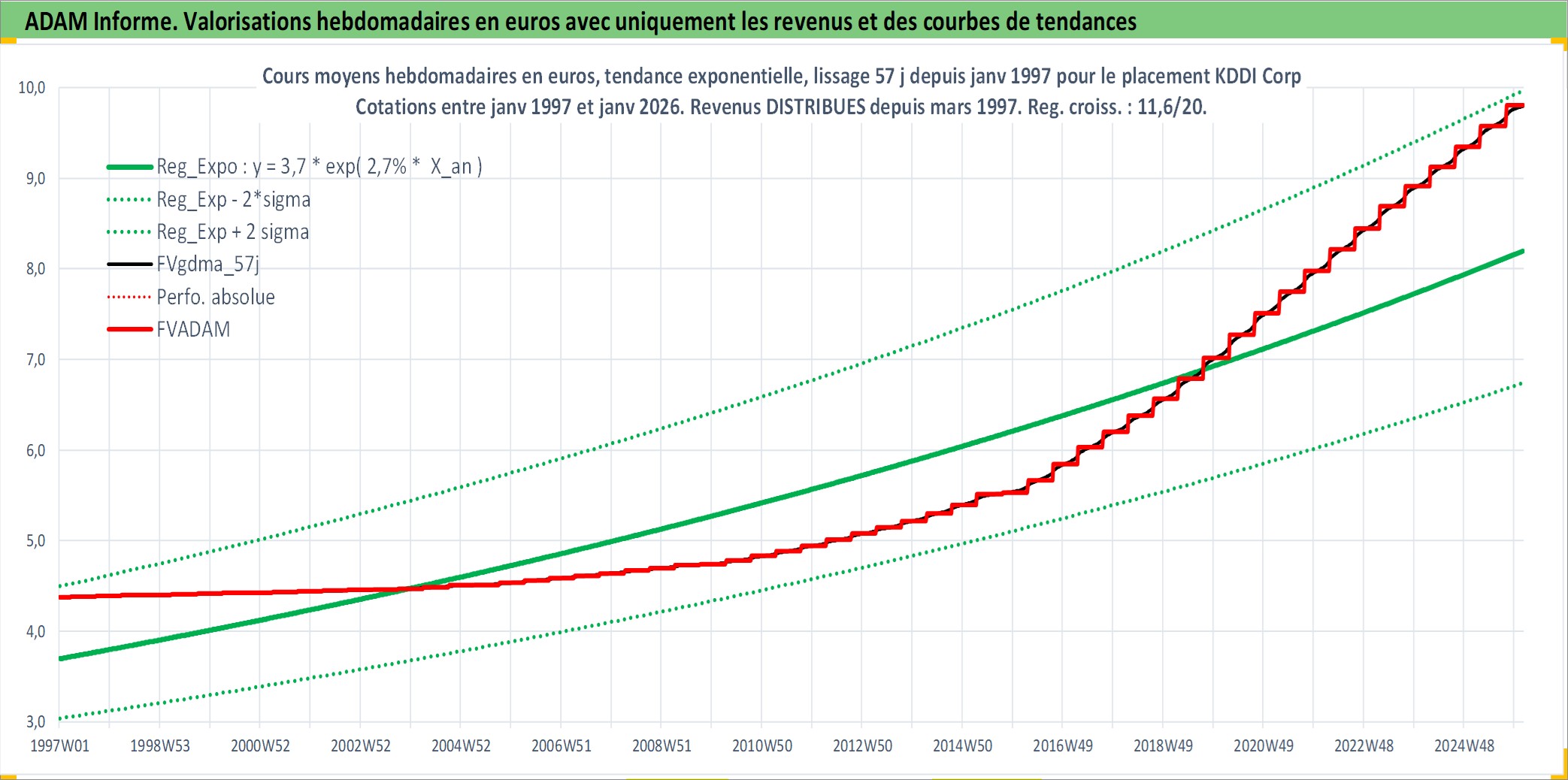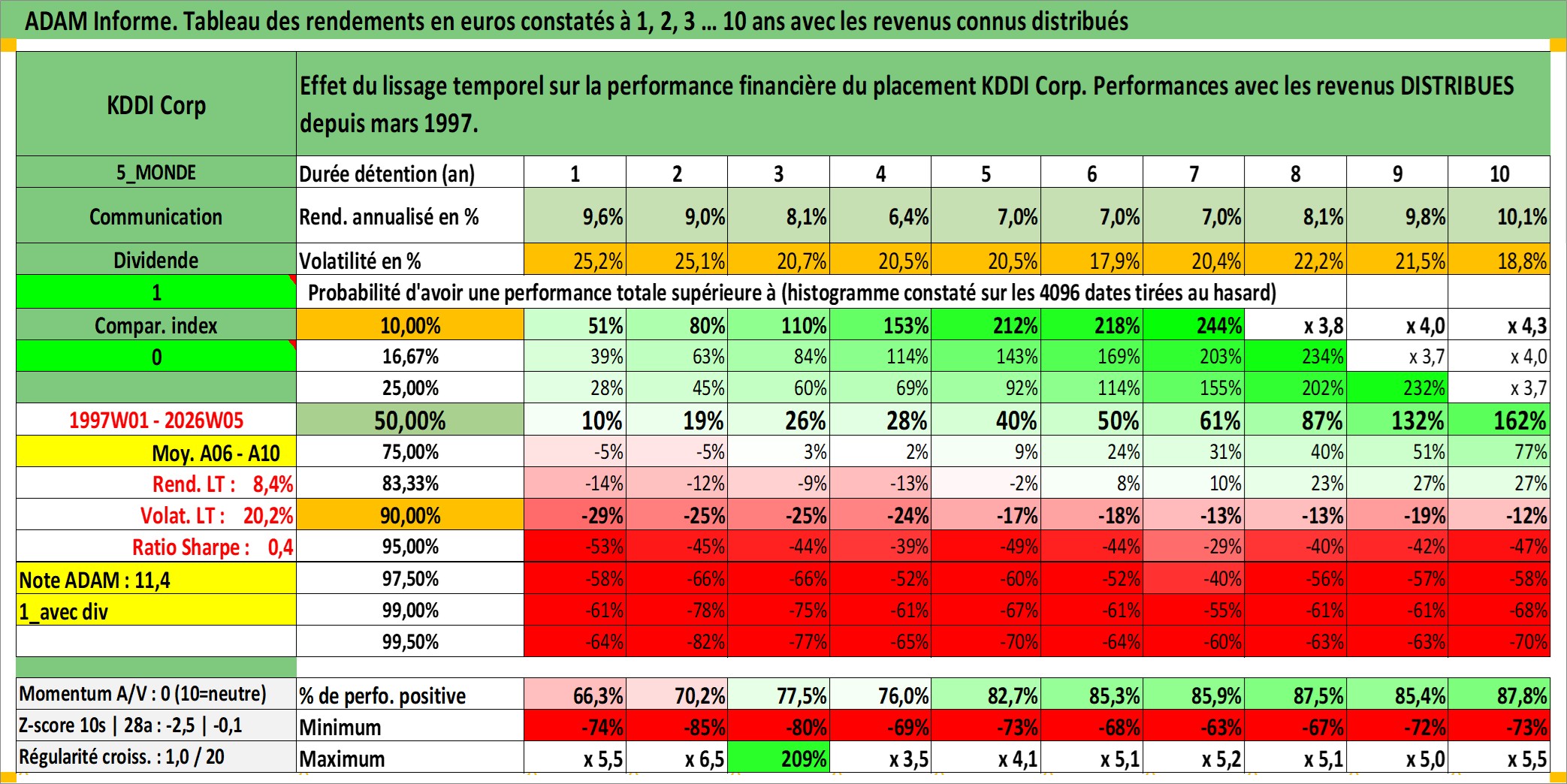 Site dédié aux investisseursPage dédiée sur site financeAnalyse des valorisations hebdomadaires de l'action KDDI Corp. Cet actif est cote en JPY. Les valorisations sont en contrevaleur EURO et couvrent les semaines 1997W01 a 2026W05. Les revenus de cet actif financier sont pris en compte depuis la semaine 1997W13. La note globale ESG de cet actif est estimee a 10.0 (apres rebasage entre 0 et 20).