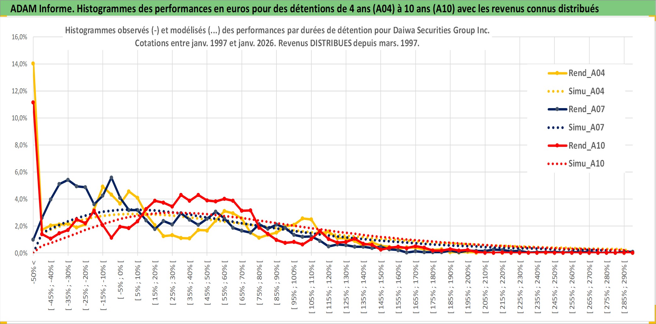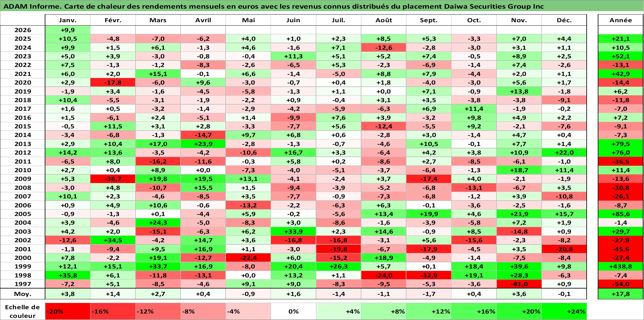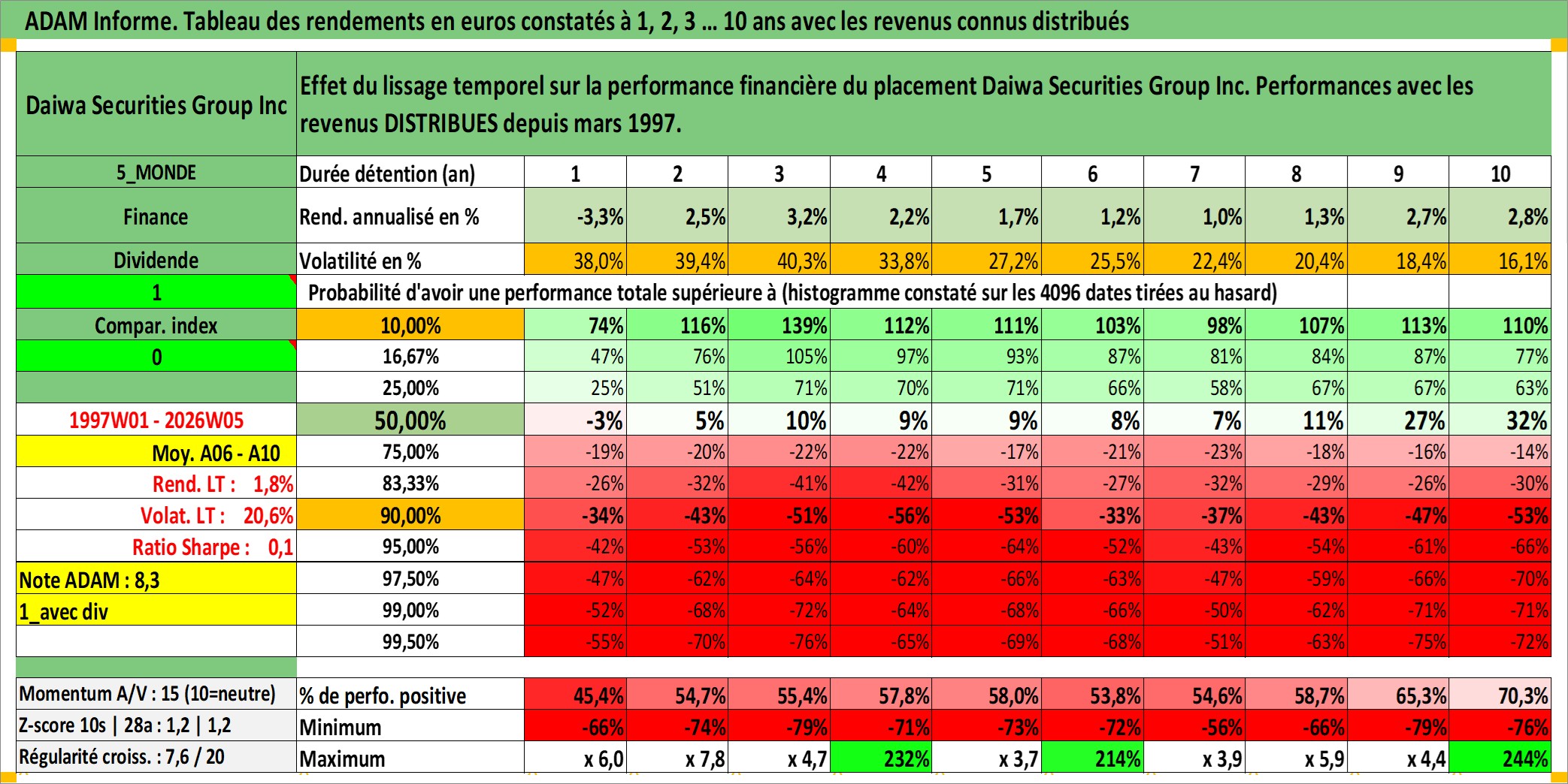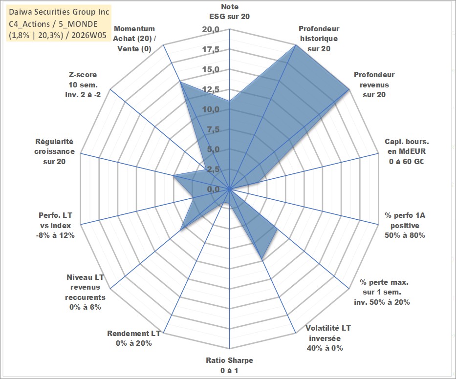 Site dédié aux investisseursPage dédiée sur site financeAnalyse des valorisations hebdomadaires de l'action Daiwa Securities Group Inc. Cet actif est cote en JPY. Les valorisations sont en contrevaleur EURO et couvrent les semaines 1997W01 a 2026W05. Les revenus de cet actif financier sont pris en compte depuis la semaine 1997W13. La note globale ESG de cet actif est estimee a 11.0 (apres rebasage entre 0 et 20).