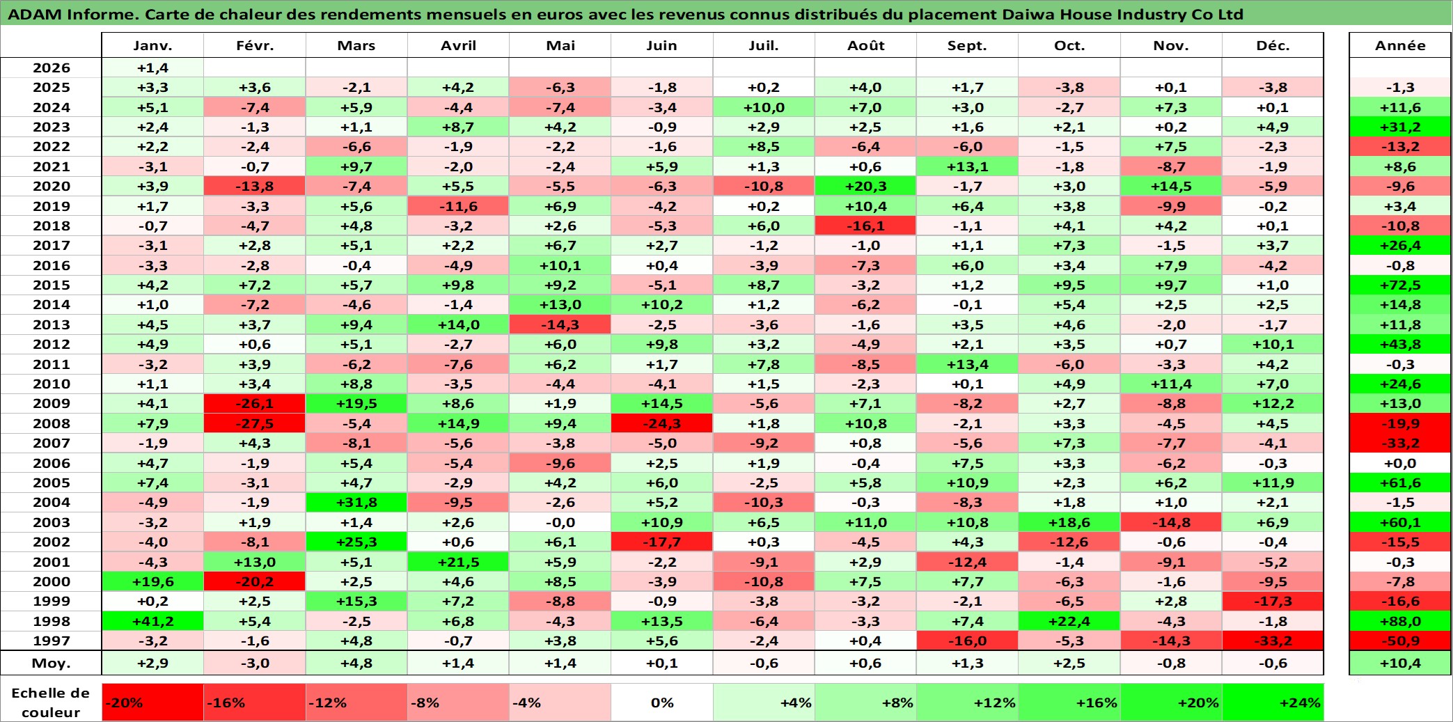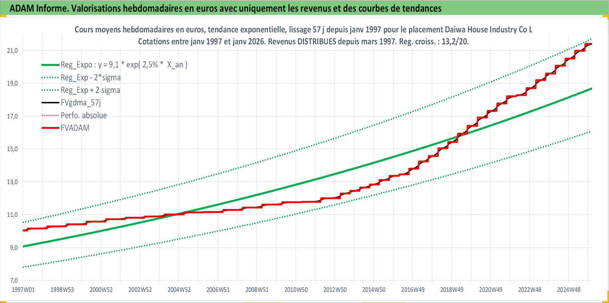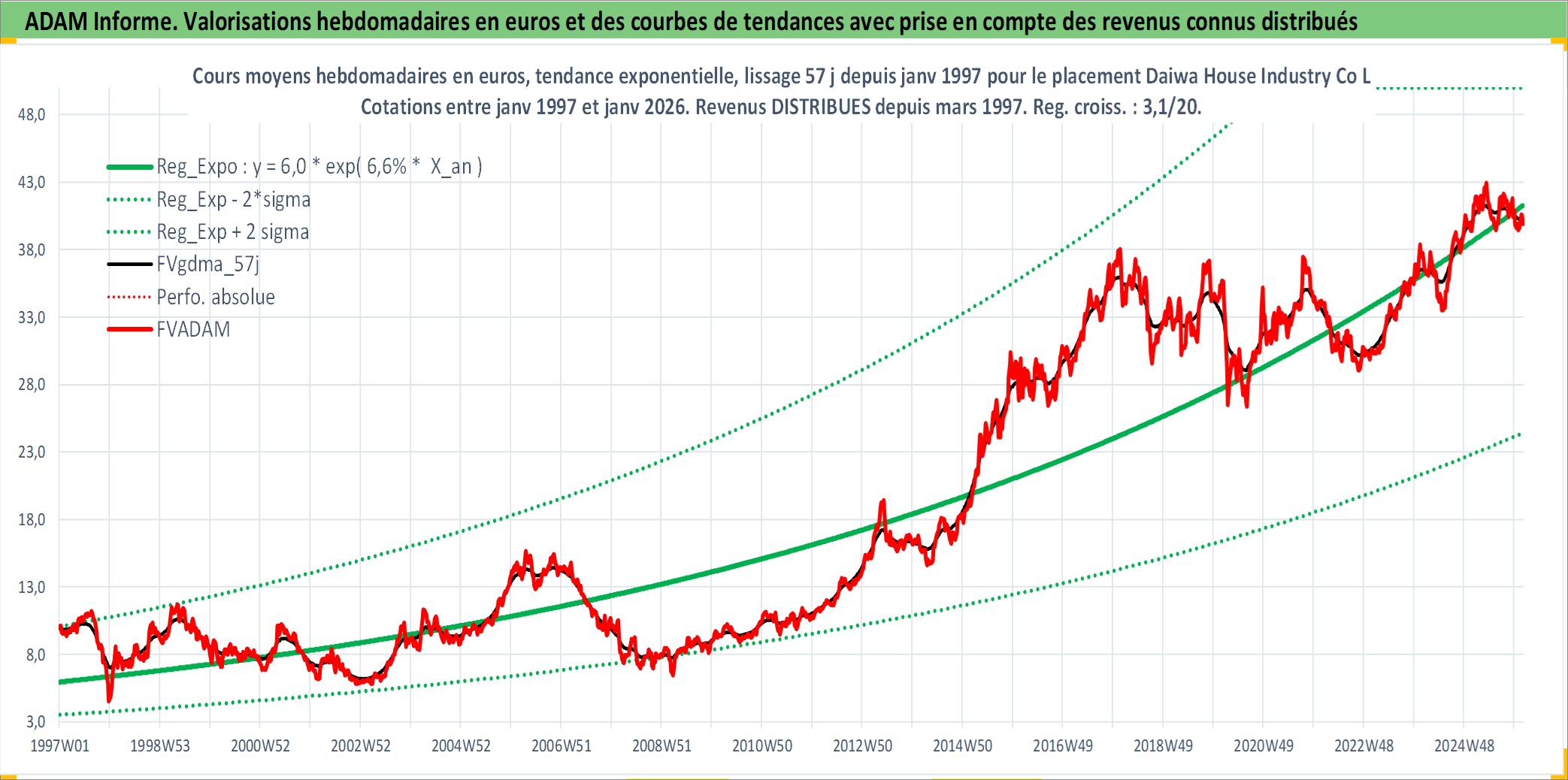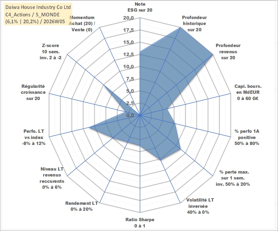 Site dédié aux investisseursPage dédiée sur site financeAnalyse des valorisations hebdomadaires de l'action Daiwa House Industry Co Ltd. Cet actif est cote en JPY. Les valorisations sont en contrevaleur EURO et couvrent les semaines 1997W01 a 2026W05. Les revenus de cet actif financier sont pris en compte depuis la semaine 1997W13. La note globale ESG de cet actif est estimee a 13.0 (apres rebasage entre 0 et 20).