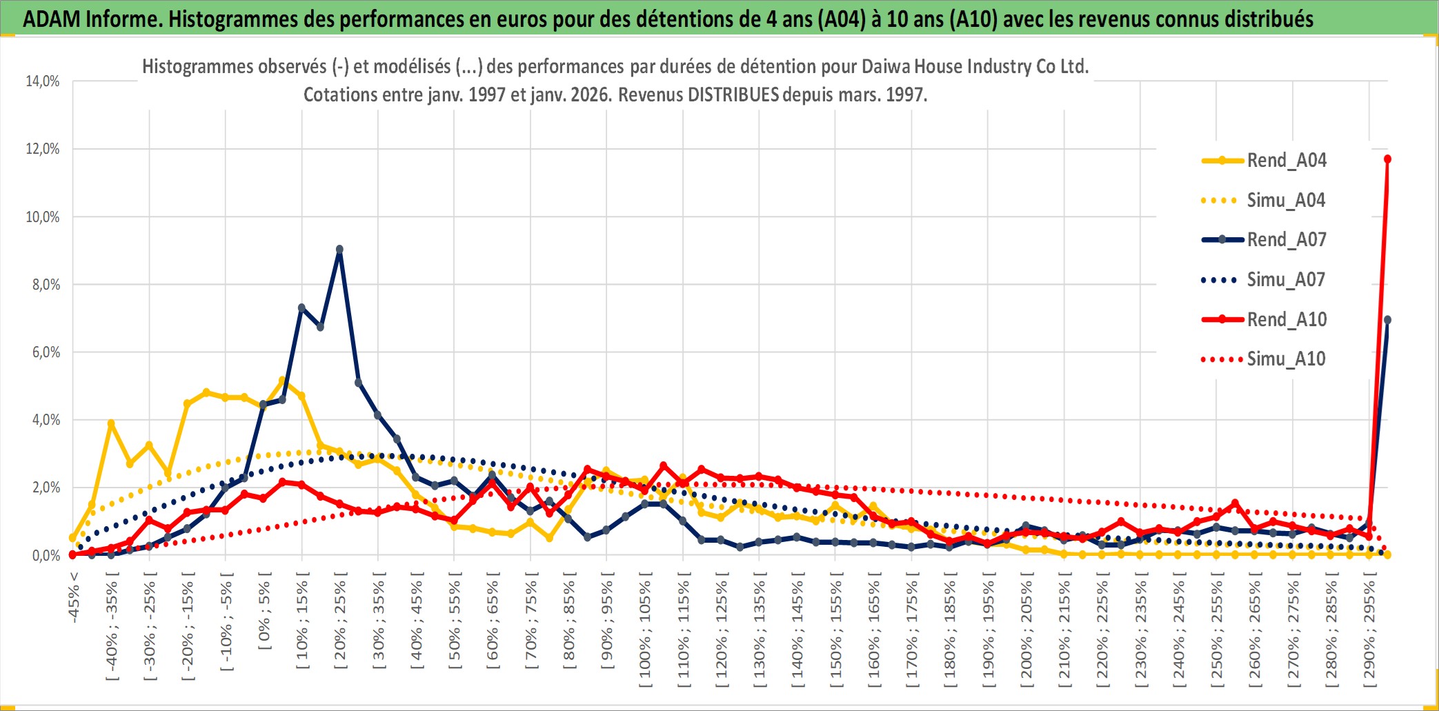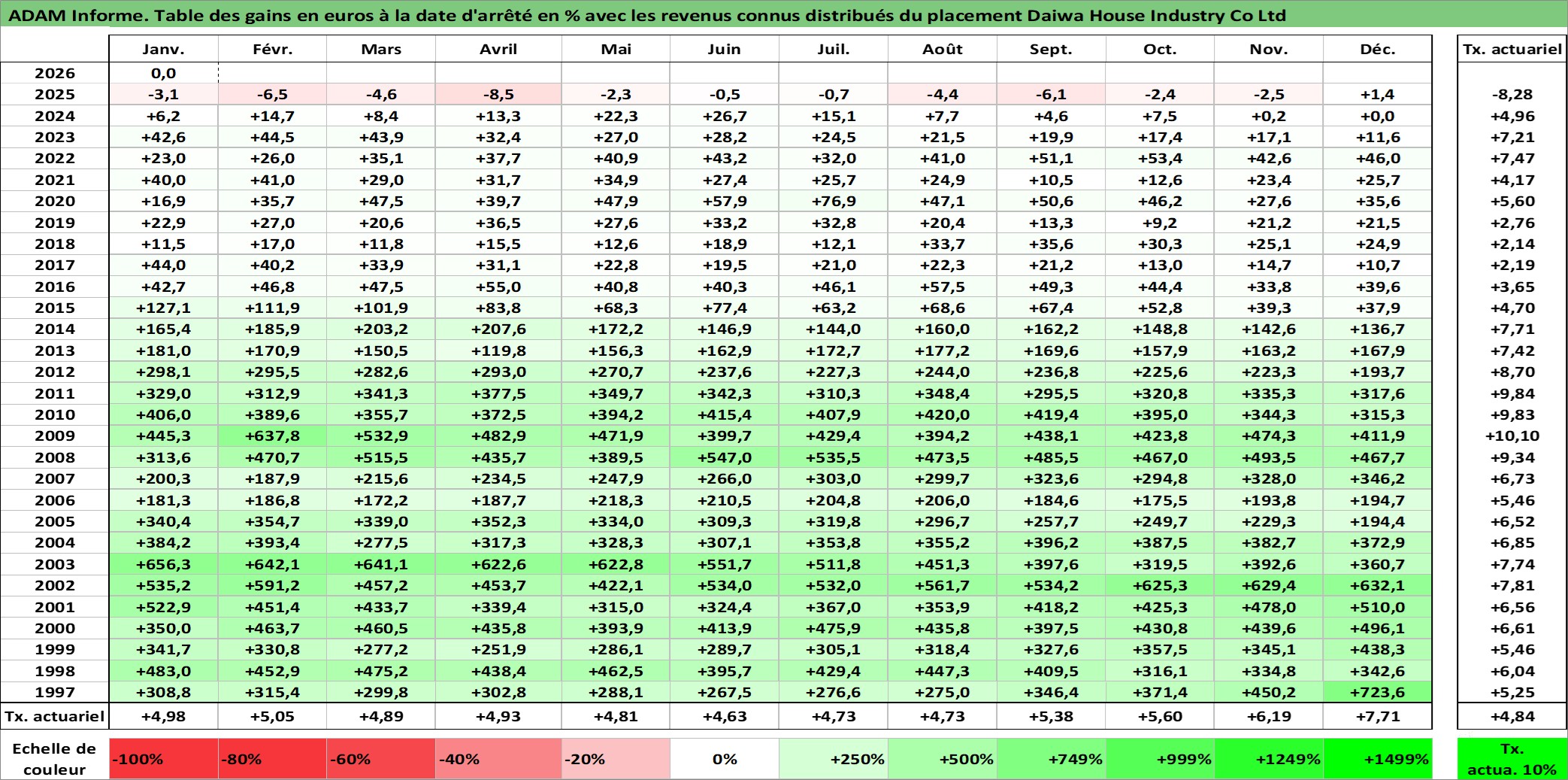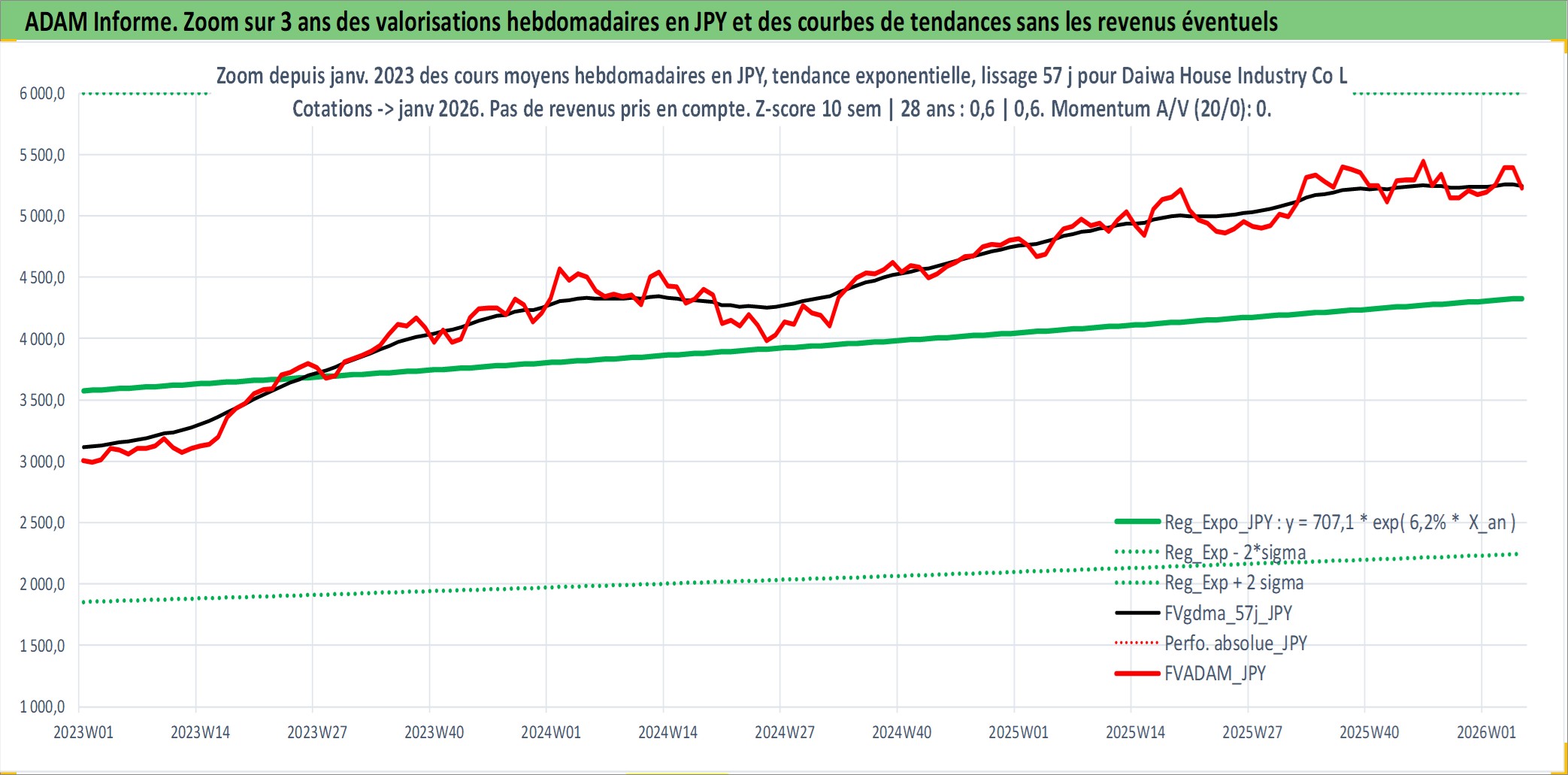 Site dédié aux investisseursPage dédiée sur site financeAnalyse des valorisations hebdomadaires de l'action Daiwa House Industry Co Ltd. Cet actif est cote en JPY. Les valorisations sont en contrevaleur EURO et couvrent les semaines 1997W01 a 2026W05. Les revenus de cet actif financier sont pris en compte depuis la semaine 1997W13. La note globale ESG de cet actif est estimee a 13.0 (apres rebasage entre 0 et 20).