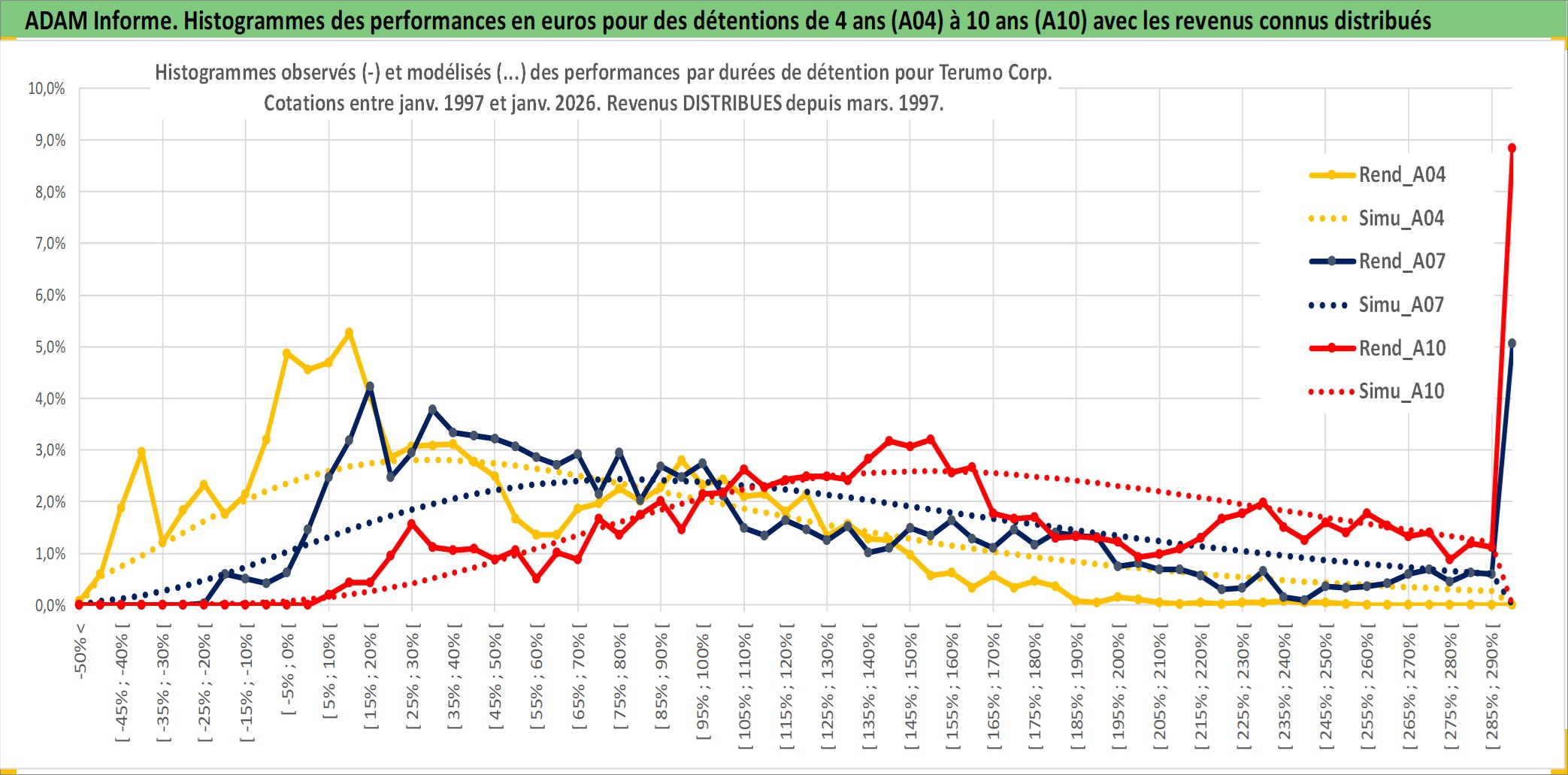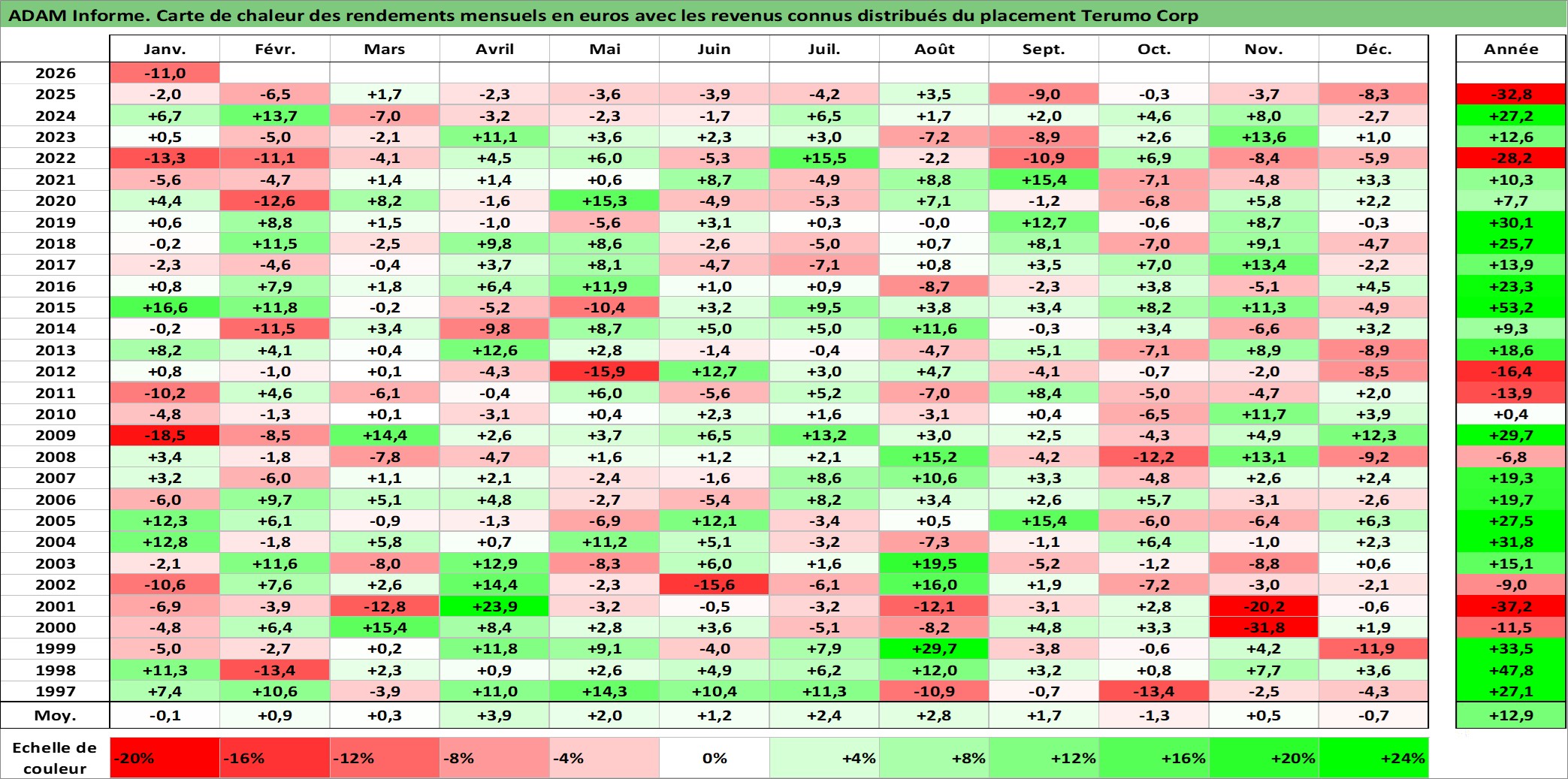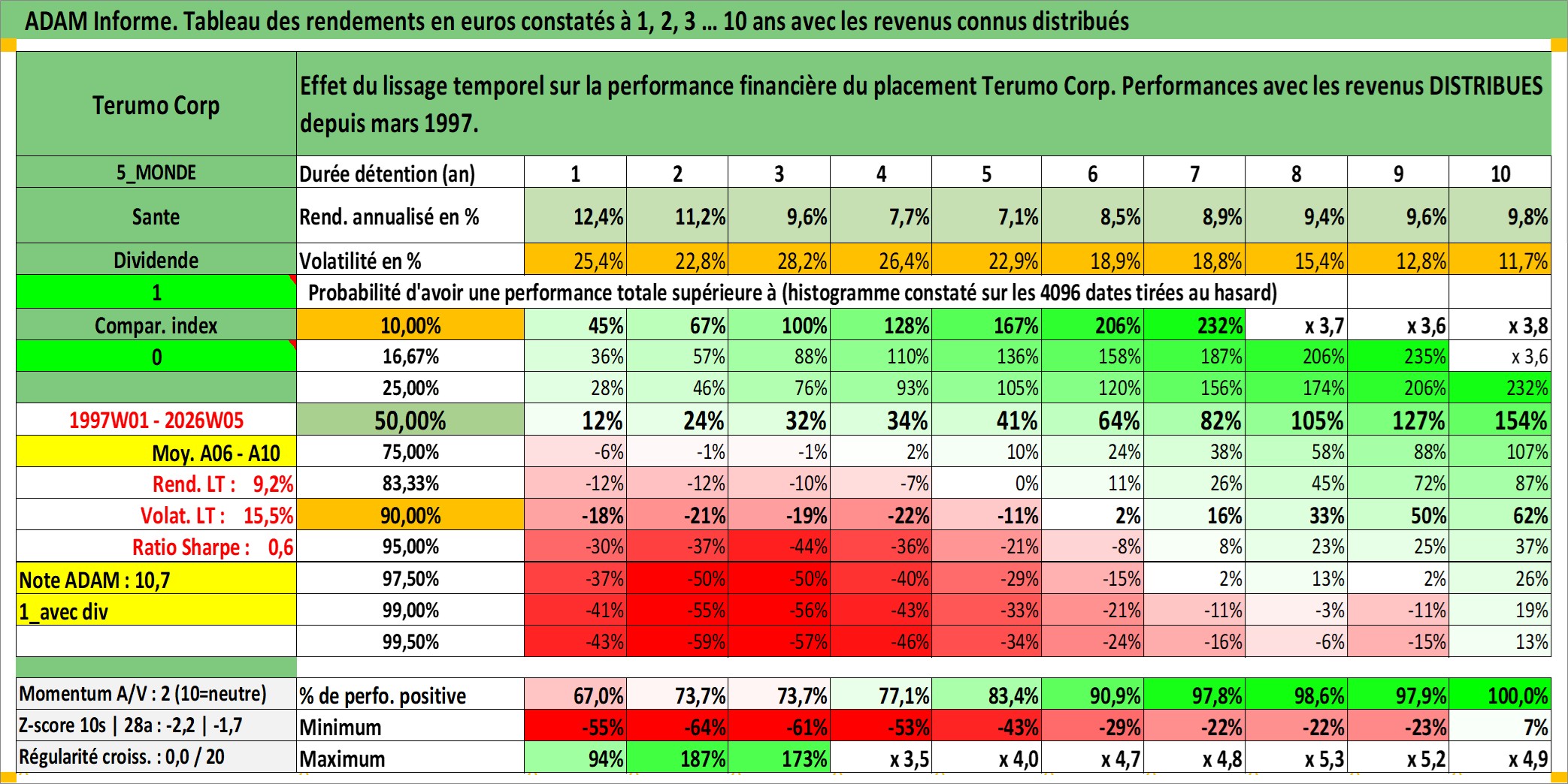 Site dédié aux investisseursPage dédiée sur site financeAnalyse des valorisations hebdomadaires de l'action Terumo Corp. Cet actif est cote en JPY. Les valorisations sont en contrevaleur EURO et couvrent les semaines 1997W01 a 2026W05. Les revenus de cet actif financier sont pris en compte depuis la semaine 1997W13. La note globale ESG de cet actif est estimee a 7.0 (apres rebasage entre 0 et 20).