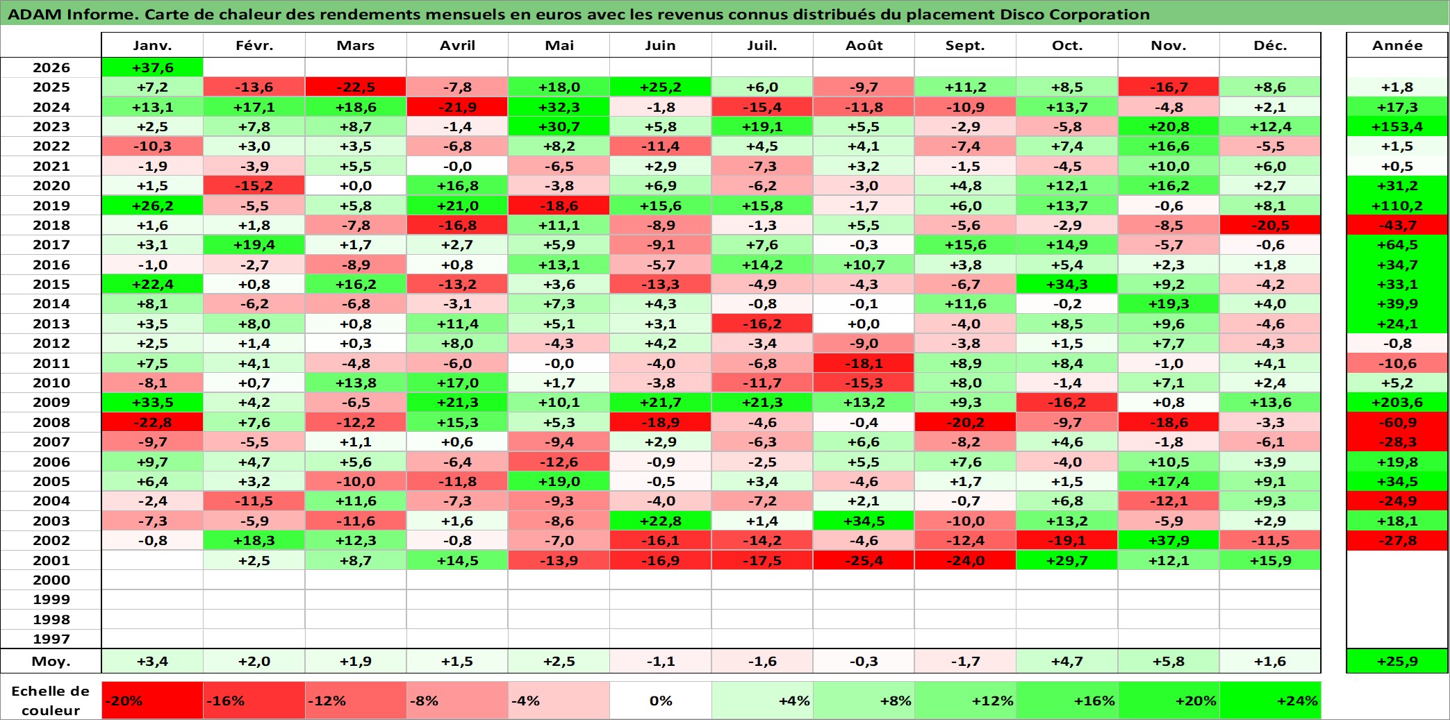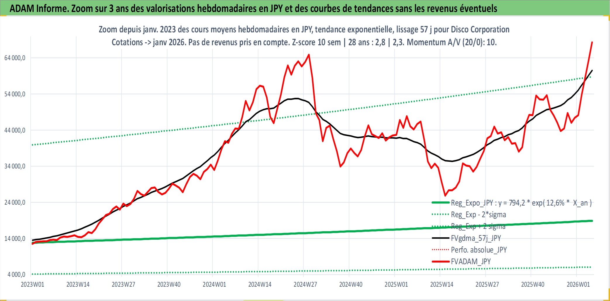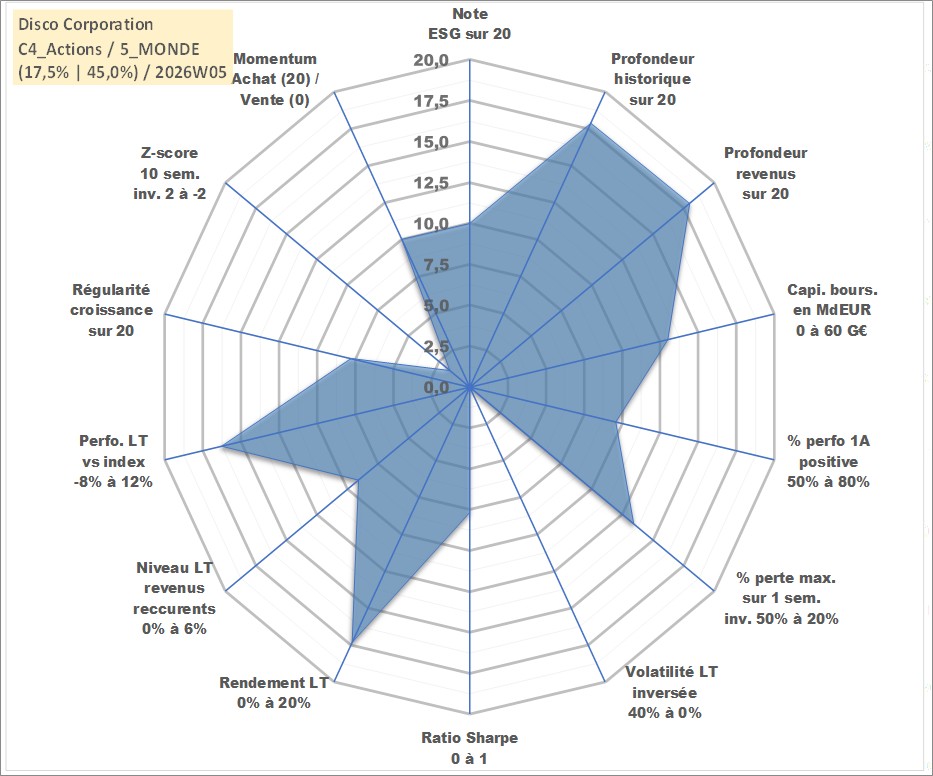 Site dédié aux investisseursPage dédiée sur site financeAnalyse des valorisations hebdomadaires de l'action Disco Corporation. Cet actif est cote en JPY. Les valorisations sont en contrevaleur EURO et couvrent les semaines 2001W02 a 2026W05. Les revenus de cet actif financier sont pris en compte depuis la semaine 2001W13. La note globale ESG de cet actif est estimee a 10.0 (apres rebasage entre 0 et 20).