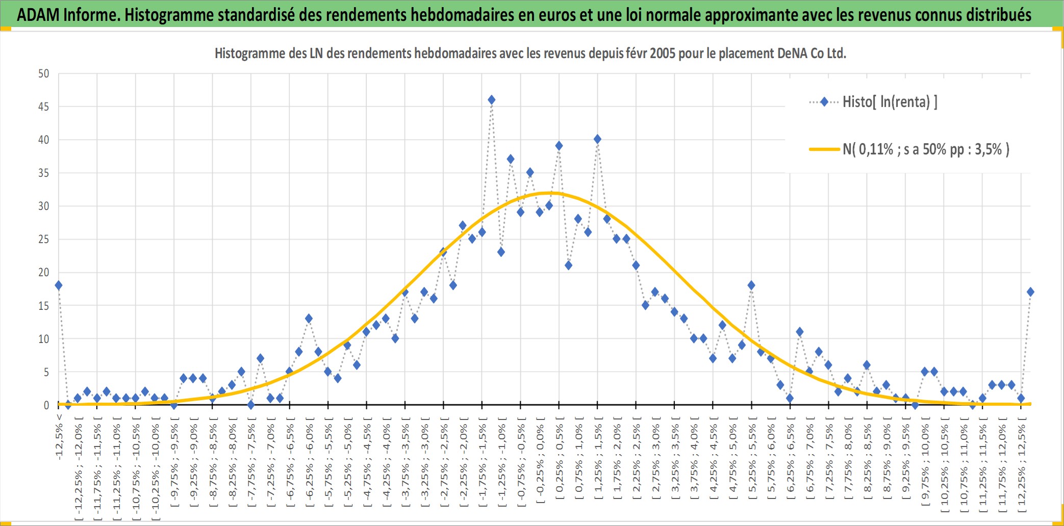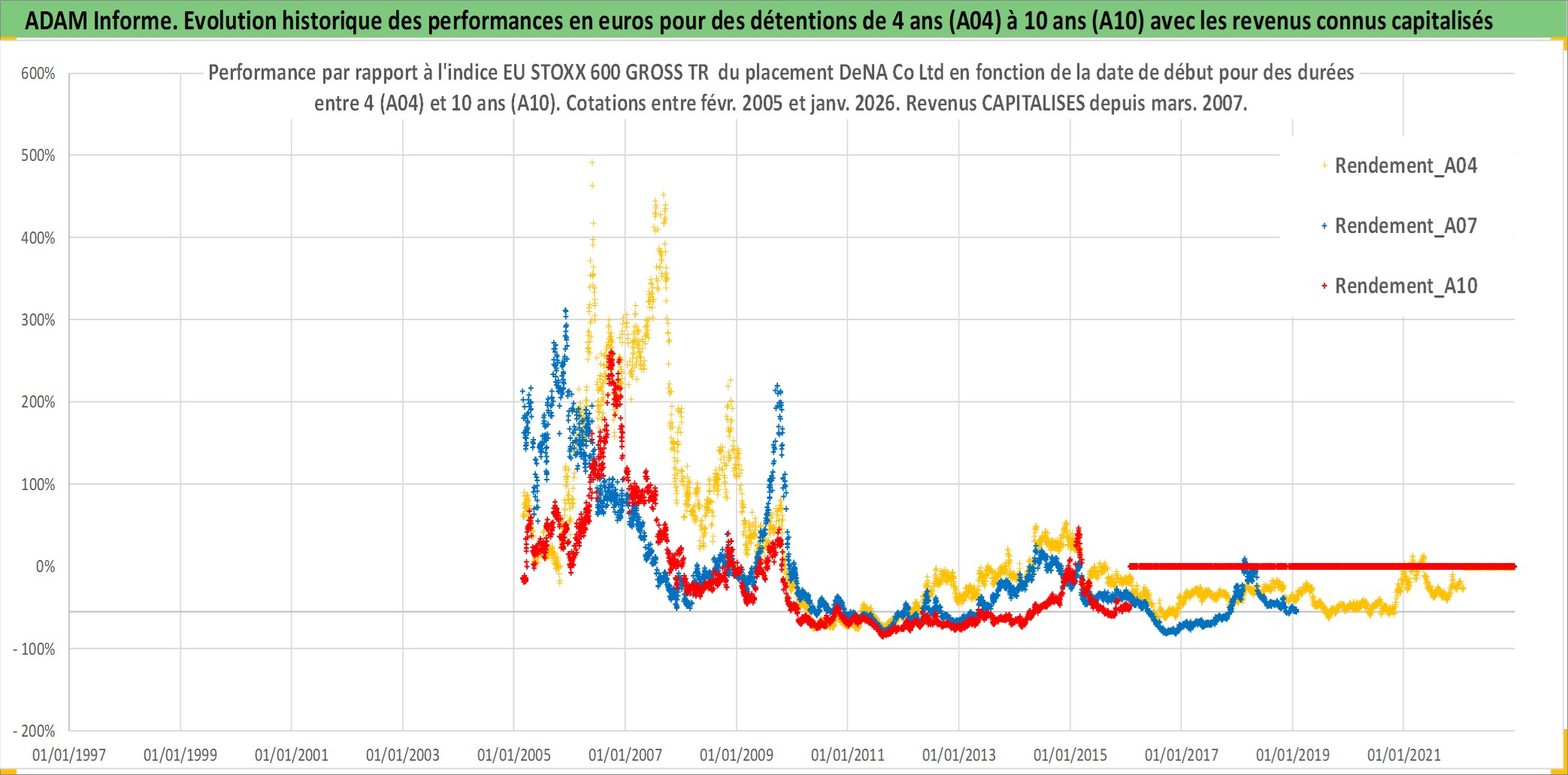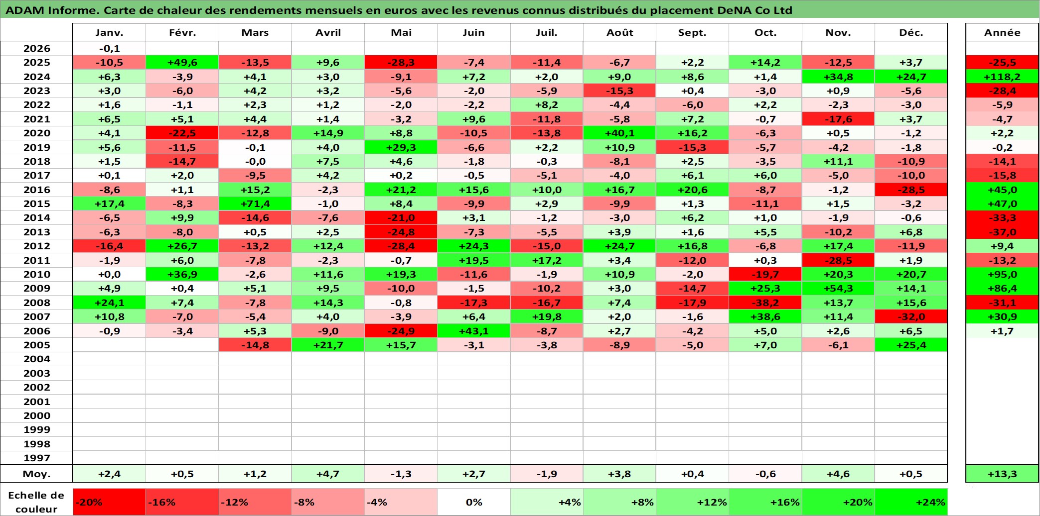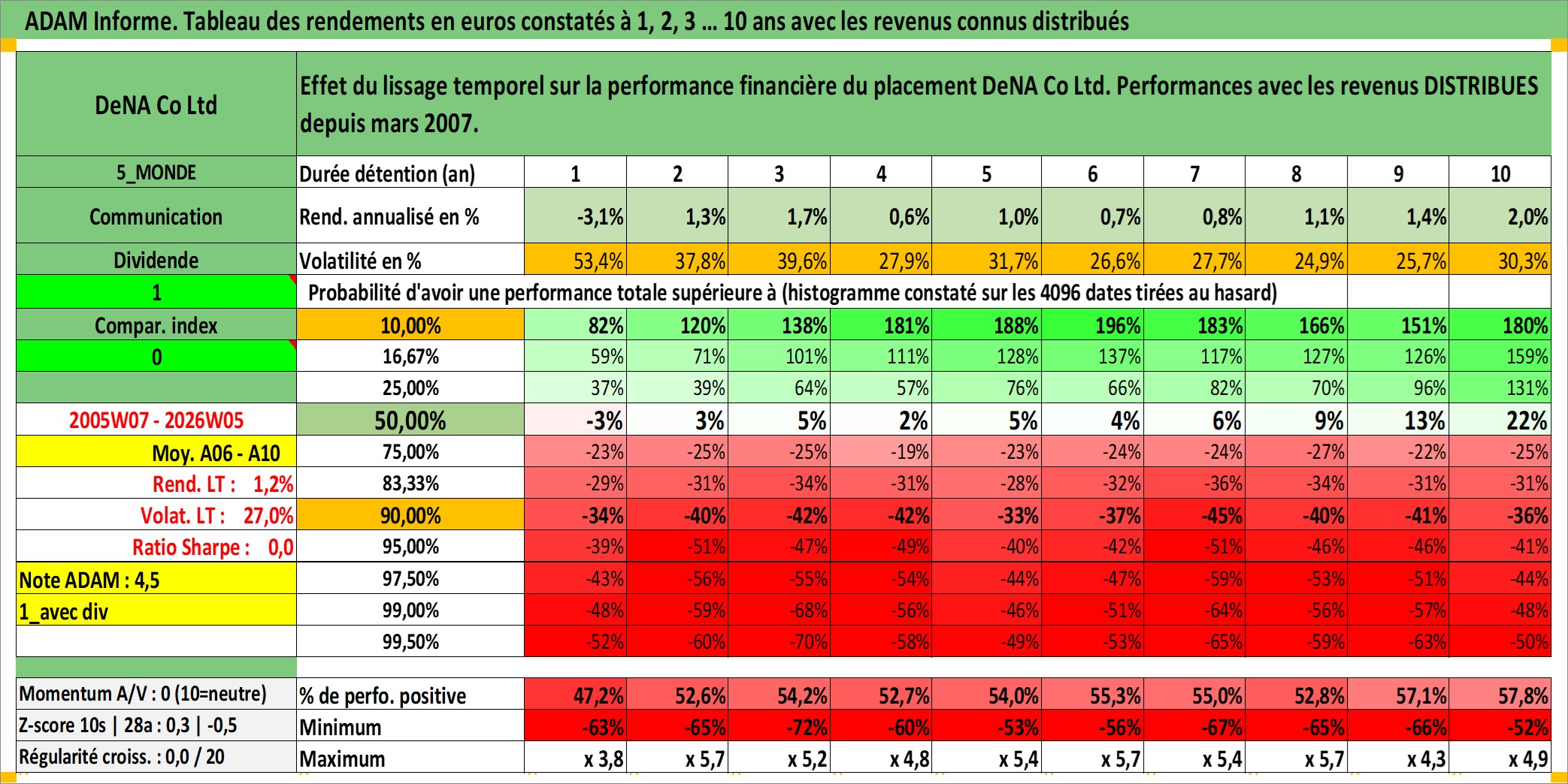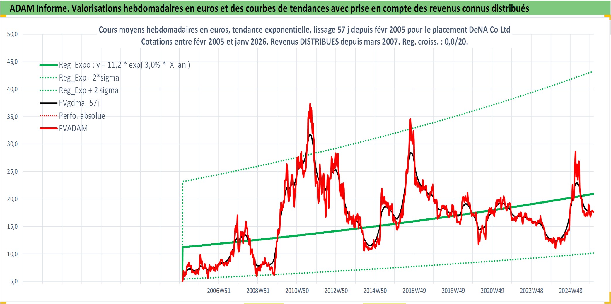 Site dédié aux investisseursPage dédiée sur site financeAnalyse des valorisations hebdomadaires de l'action DeNA Co Ltd. Cet actif est cote en JPY. Les valorisations sont en contrevaleur EURO et couvrent les semaines 2005W07 a 2026W05. Les revenus de cet actif financier sont pris en compte depuis la semaine 2007W13. La note ESG de cet actif n'est pas connue.
