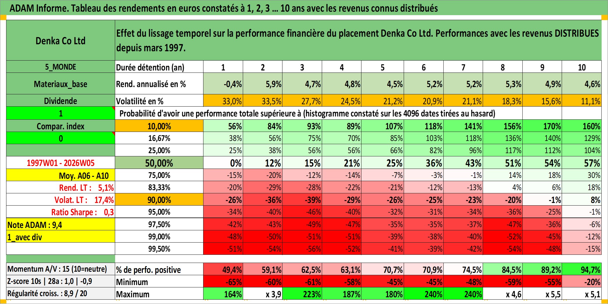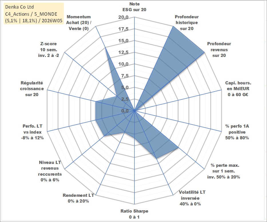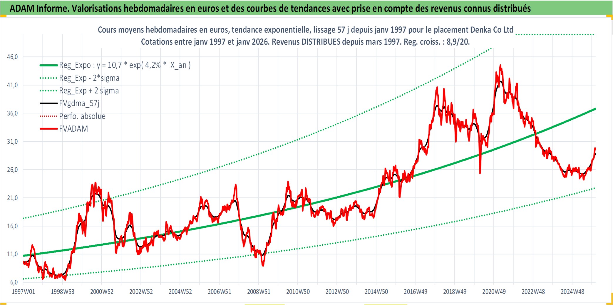 Site dédié aux investisseursPage dédiée sur site financeAnalyse des valorisations hebdomadaires de l'action Denka Co Ltd. Cet actif est cote en JPY. Les valorisations sont en contrevaleur EURO et couvrent les semaines 1997W01 a 2026W05. Les revenus de cet actif financier sont pris en compte depuis la semaine 1997W13. La note ESG de cet actif n'est pas connue.