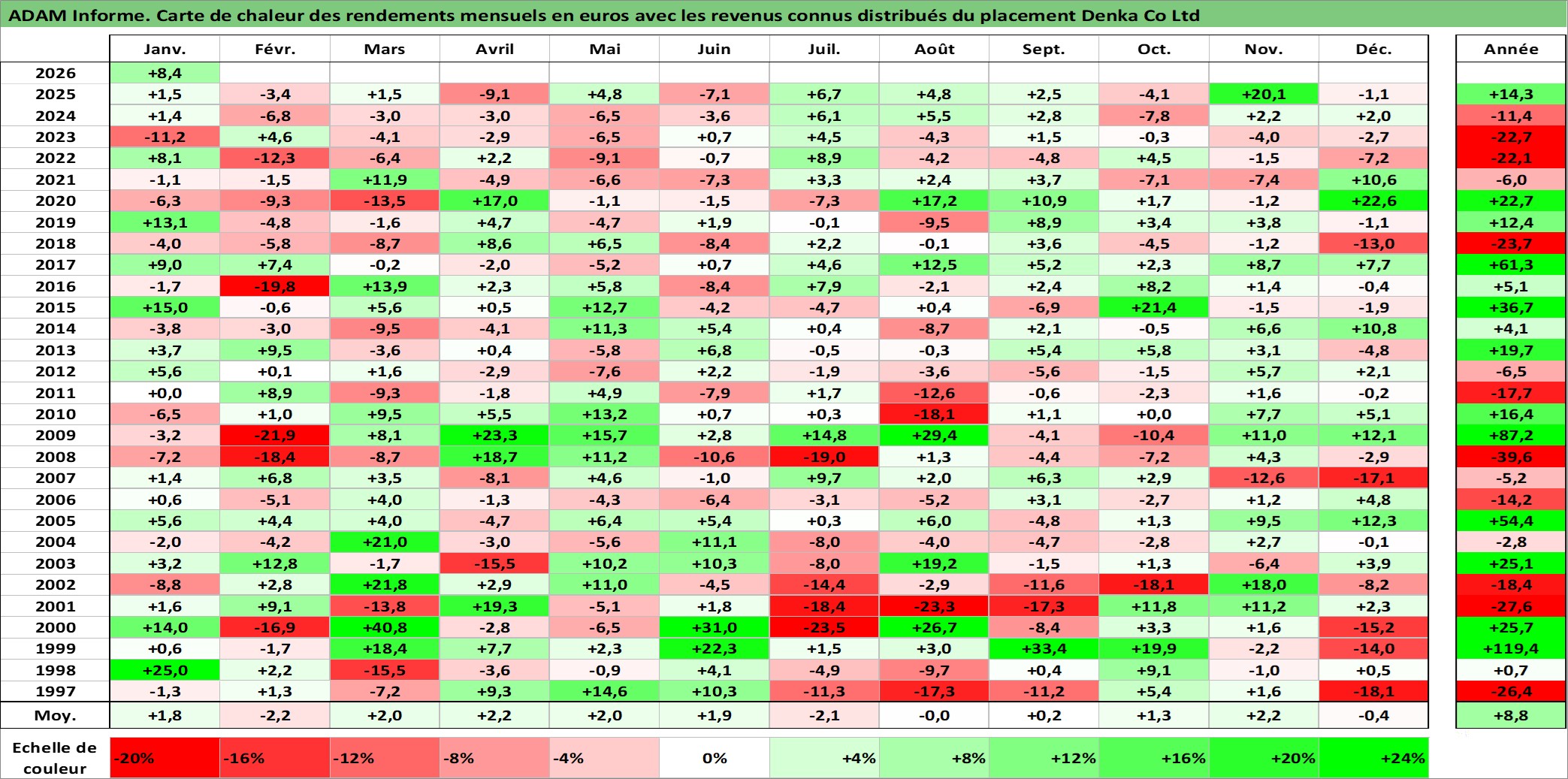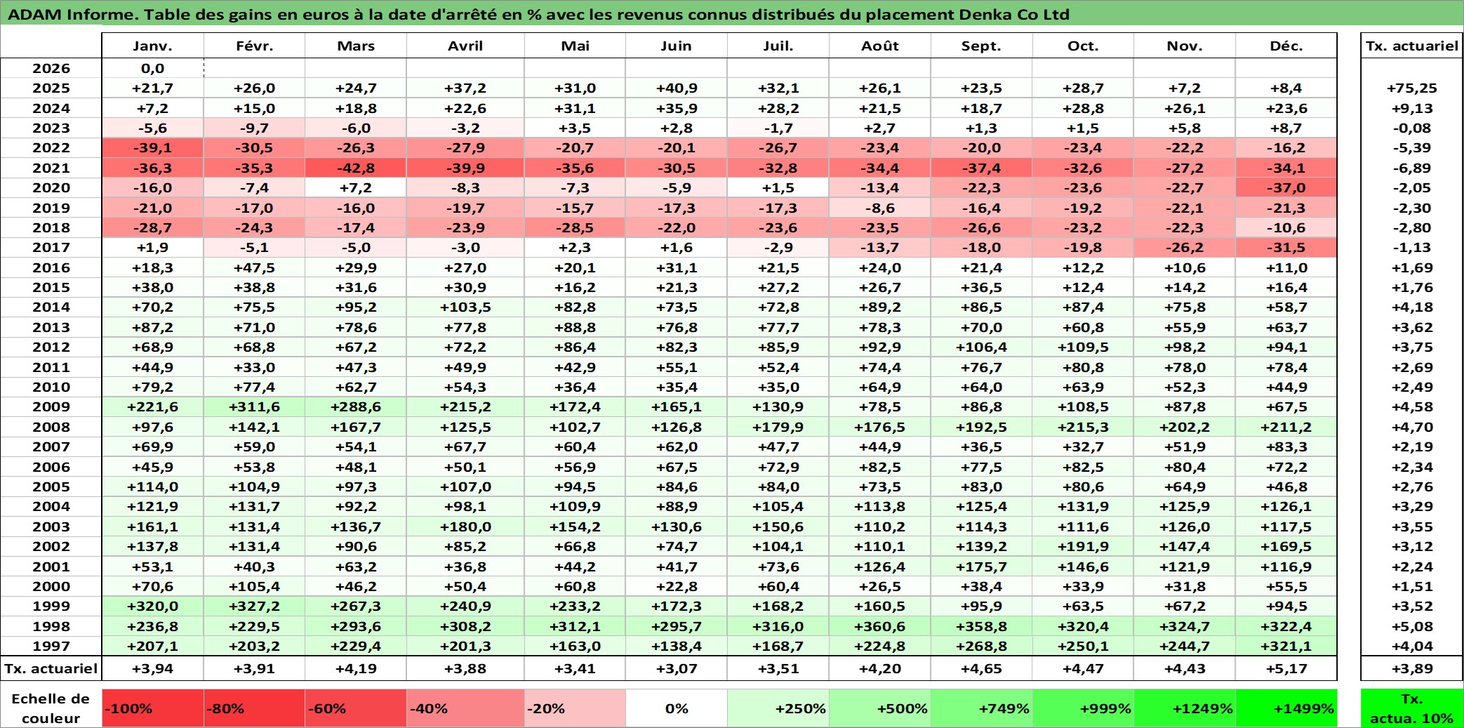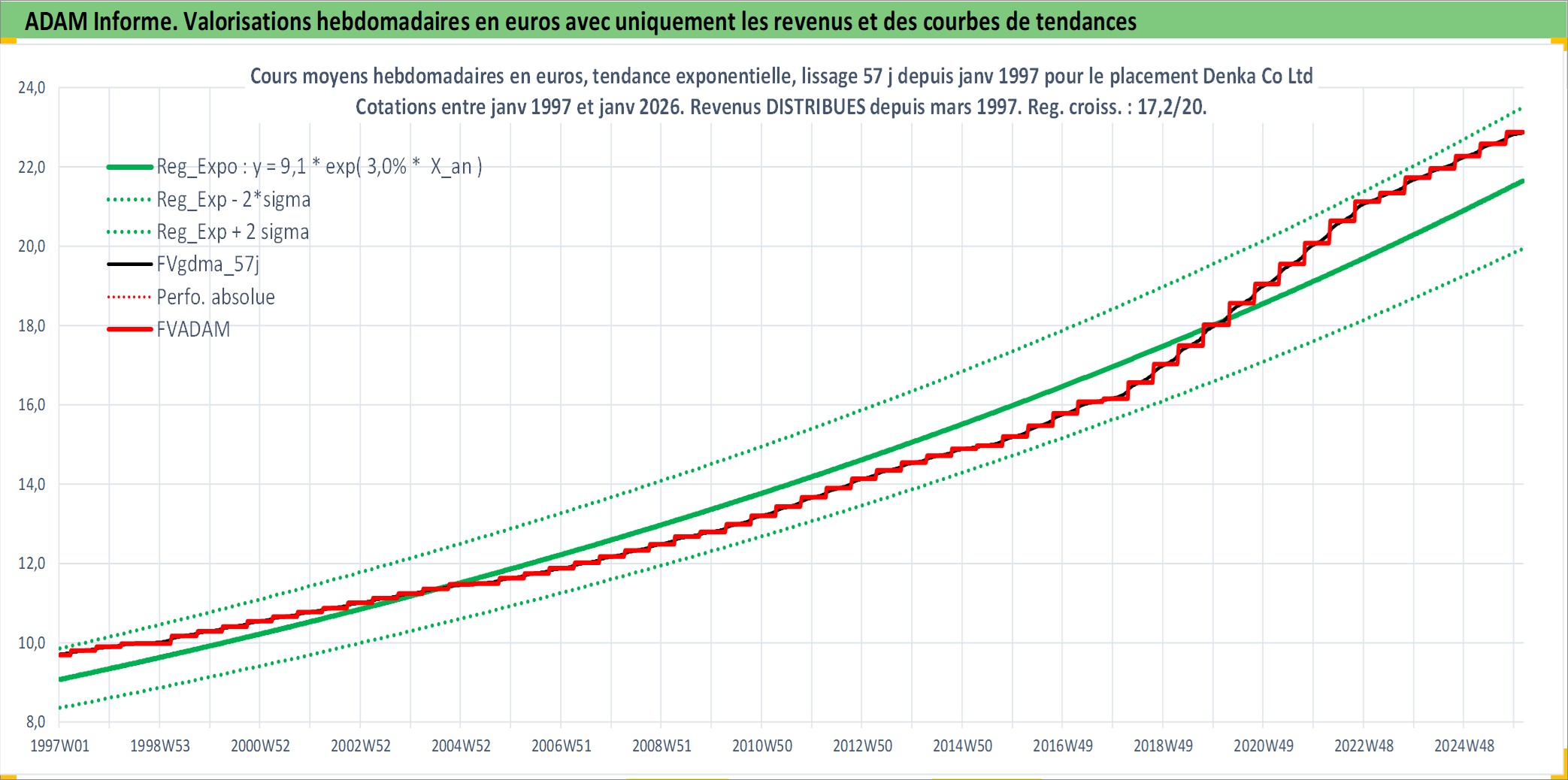 Site dédié aux investisseursPage dédiée sur site financeAnalyse des valorisations hebdomadaires de l'action Denka Co Ltd. Cet actif est cote en JPY. Les valorisations sont en contrevaleur EURO et couvrent les semaines 1997W01 a 2026W05. Les revenus de cet actif financier sont pris en compte depuis la semaine 1997W13. La note ESG de cet actif n'est pas connue.