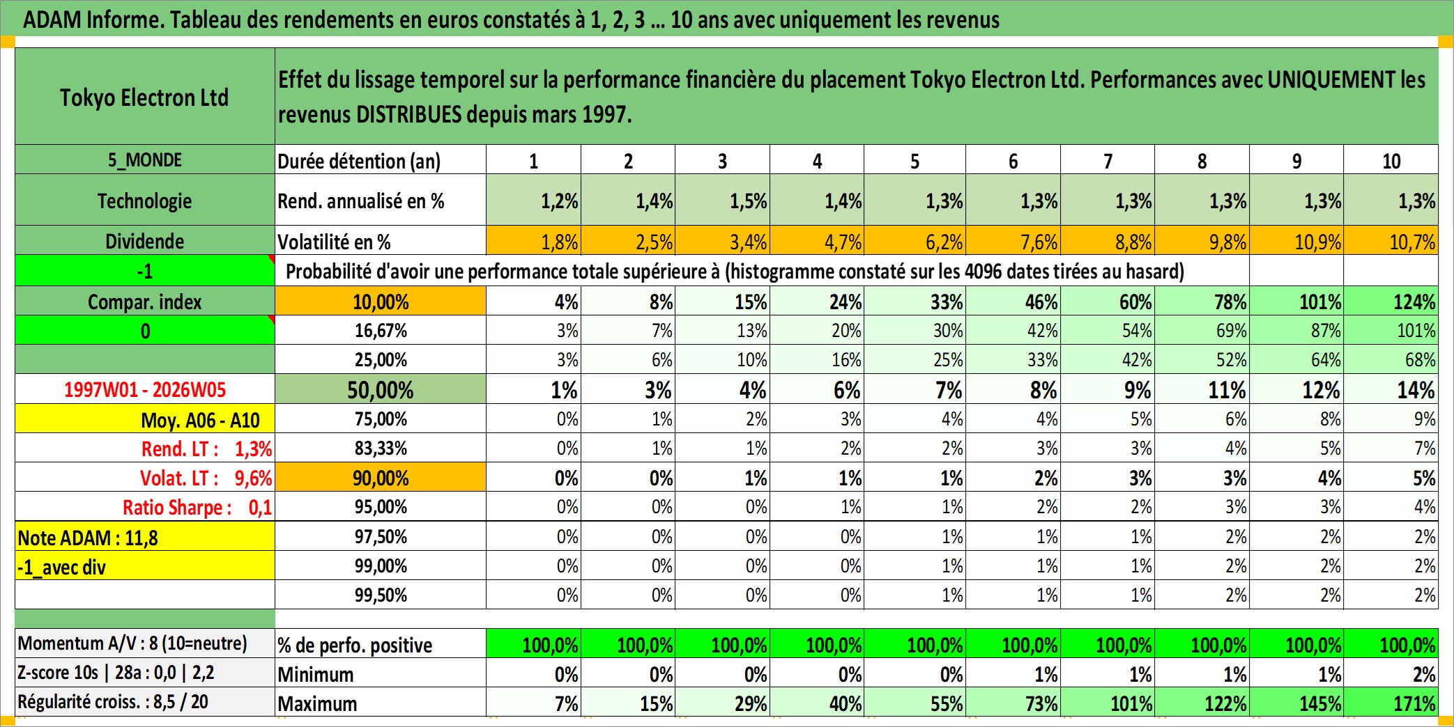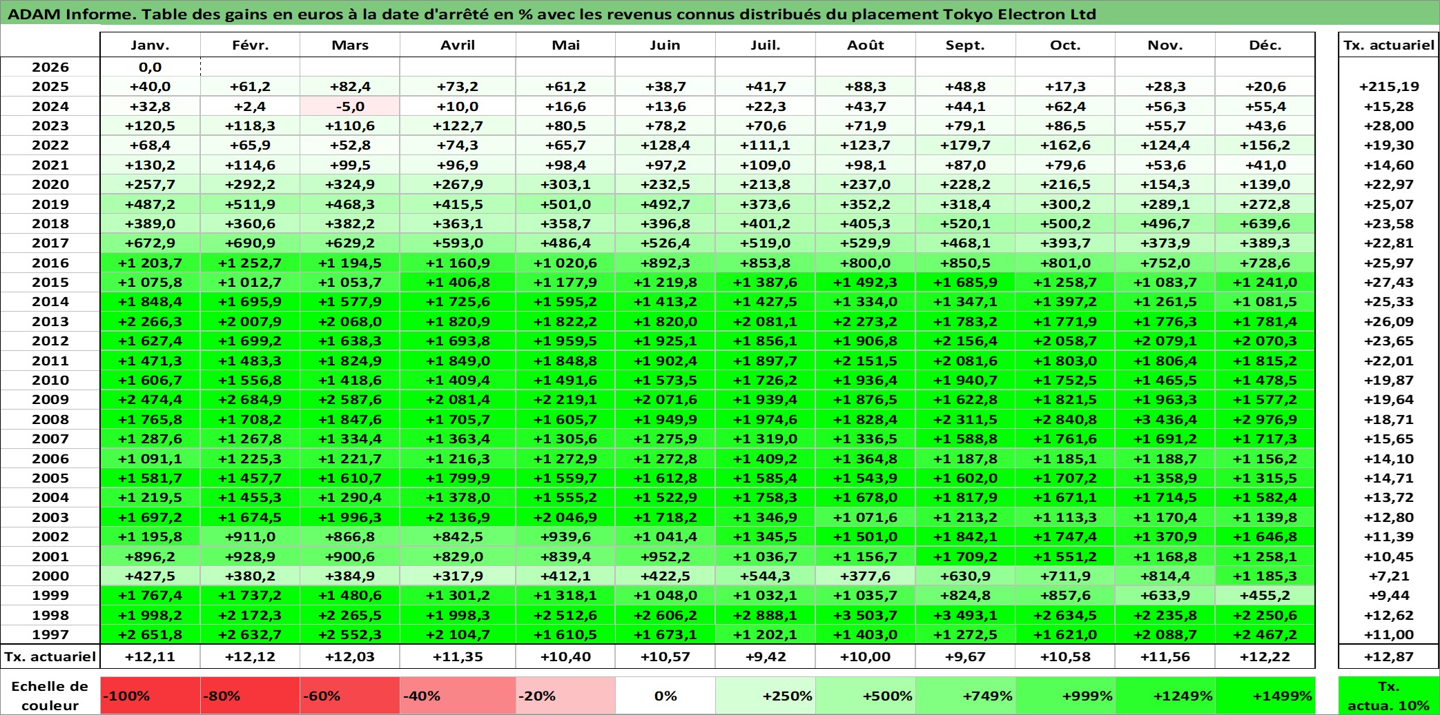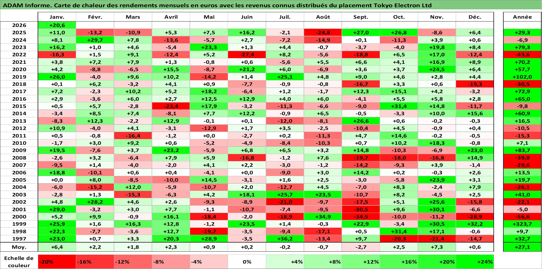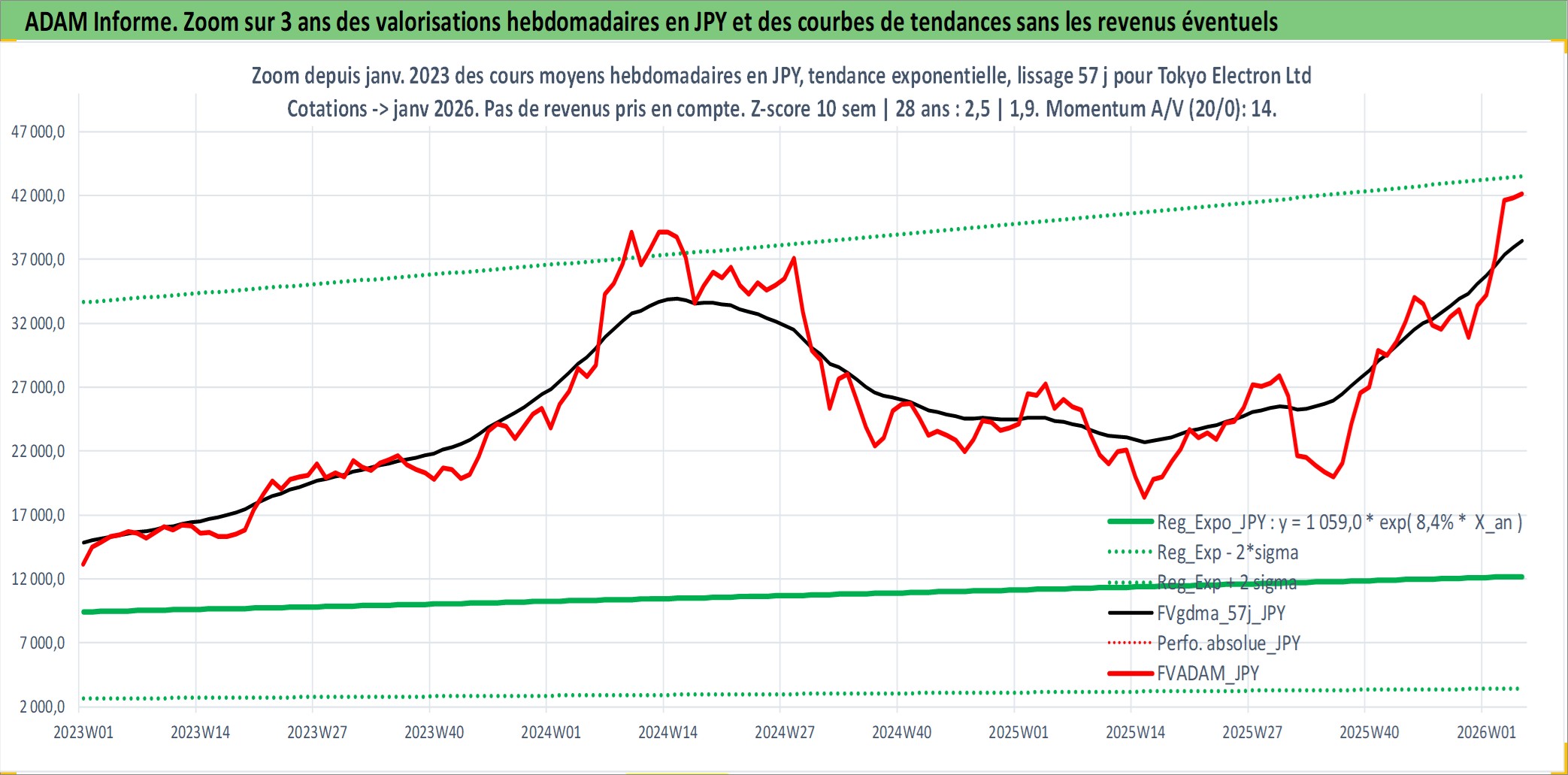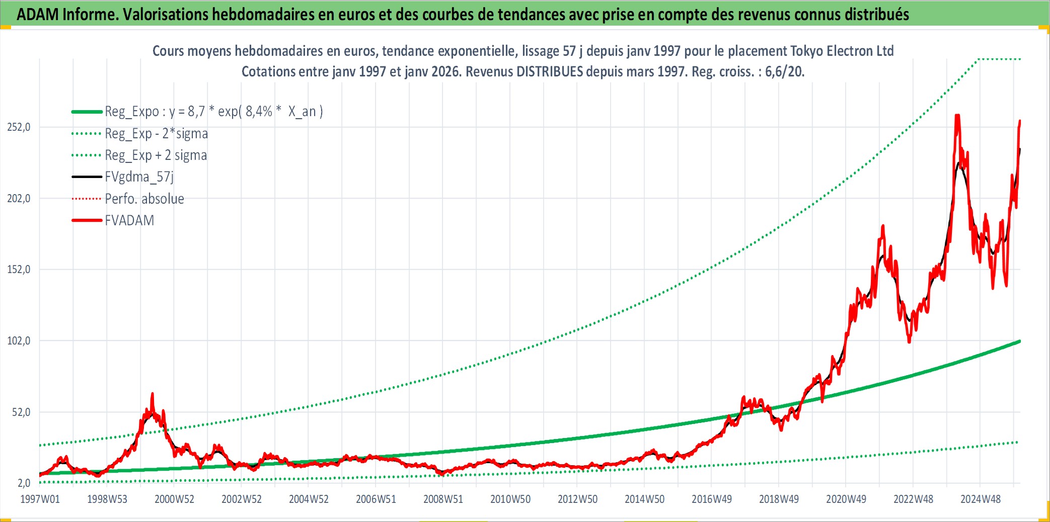 Site dédié aux investisseursPage dédiée sur site financeAnalyse des valorisations hebdomadaires de l'action Tokyo Electron Ltd. Cet actif est cote en JPY. Les valorisations sont en contrevaleur EURO et couvrent les semaines 1997W01 a 2026W05. Les revenus de cet actif financier sont pris en compte depuis la semaine 1997W13. La note globale ESG de cet actif est estimee a 13.0 (apres rebasage entre 0 et 20).