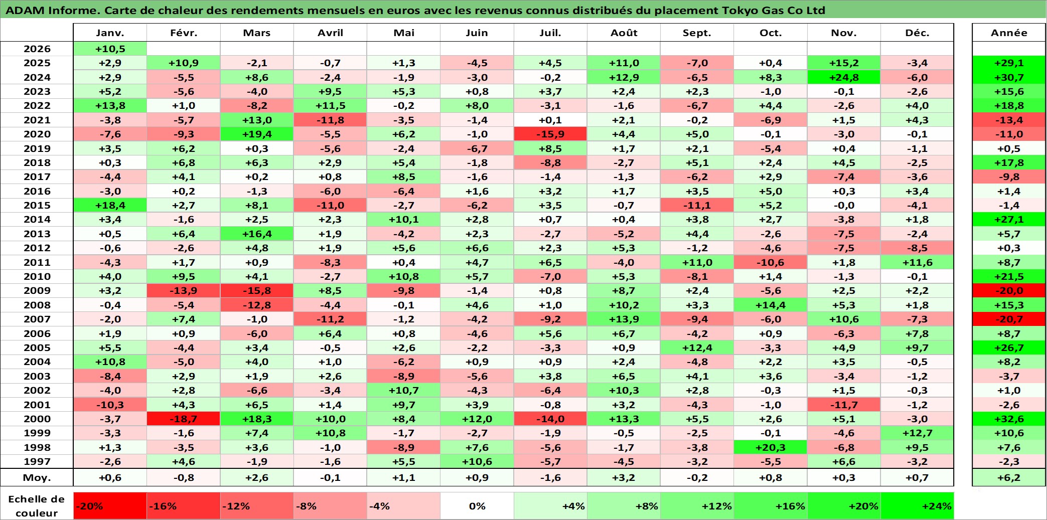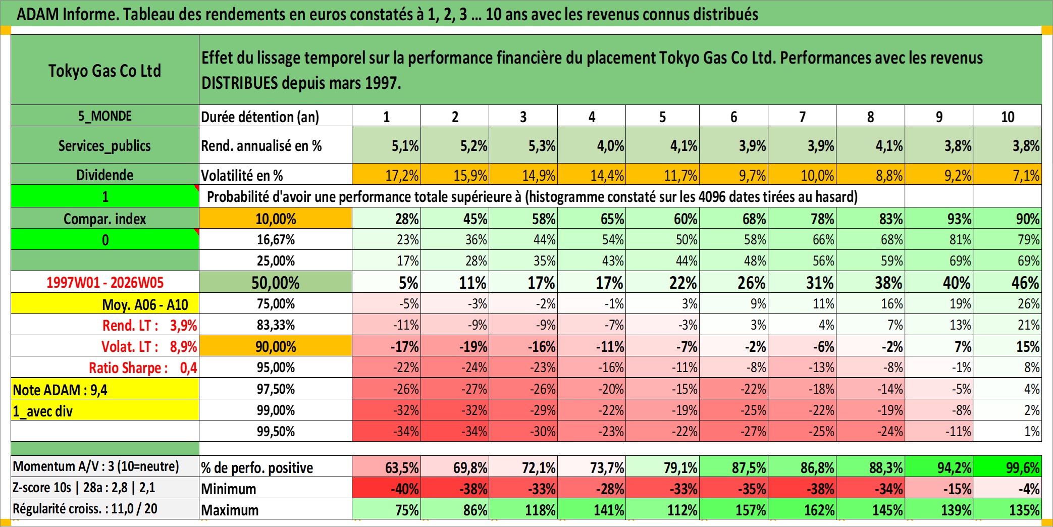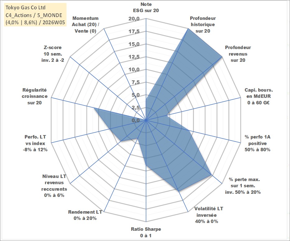 Site dédié aux investisseursPage dédiée sur site financeAnalyse des valorisations hebdomadaires de l'action Tokyo Gas Co Ltd. Cet actif est cote en JPY. Les valorisations sont en contrevaleur EURO et couvrent les semaines 1997W01 a 2026W05. Les revenus de cet actif financier sont pris en compte depuis la semaine 1997W13. La note globale ESG de cet actif est estimee a 4.0 (apres rebasage entre 0 et 20).
