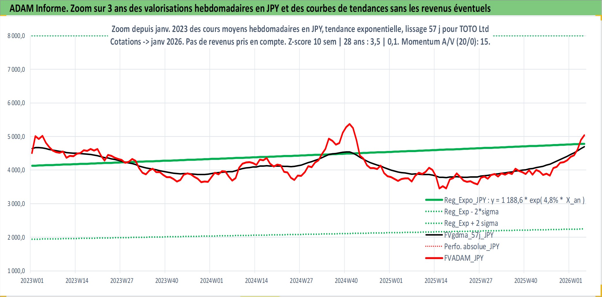 Site dédié aux investisseursPage dédiée sur site financeAnalyse des valorisations hebdomadaires de l'action TOTO Ltd. Cet actif est cote en JPY. Les valorisations sont en contrevaleur EURO et couvrent les semaines 1997W01 a 2026W05. Les revenus de cet actif financier sont pris en compte depuis la semaine 1997W13. La note globale ESG de cet actif est estimee a 11.0 (apres rebasage entre 0 et 20).