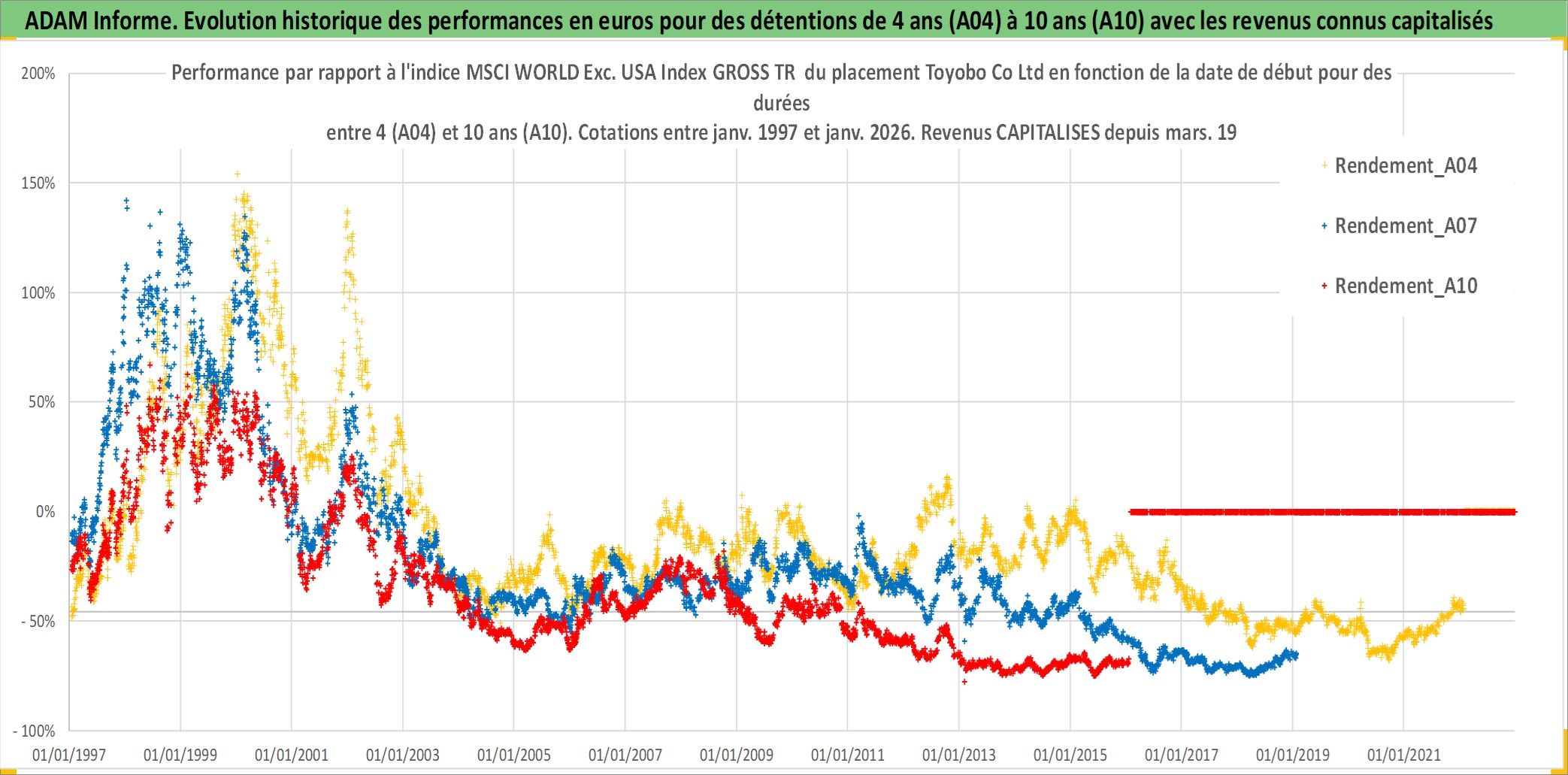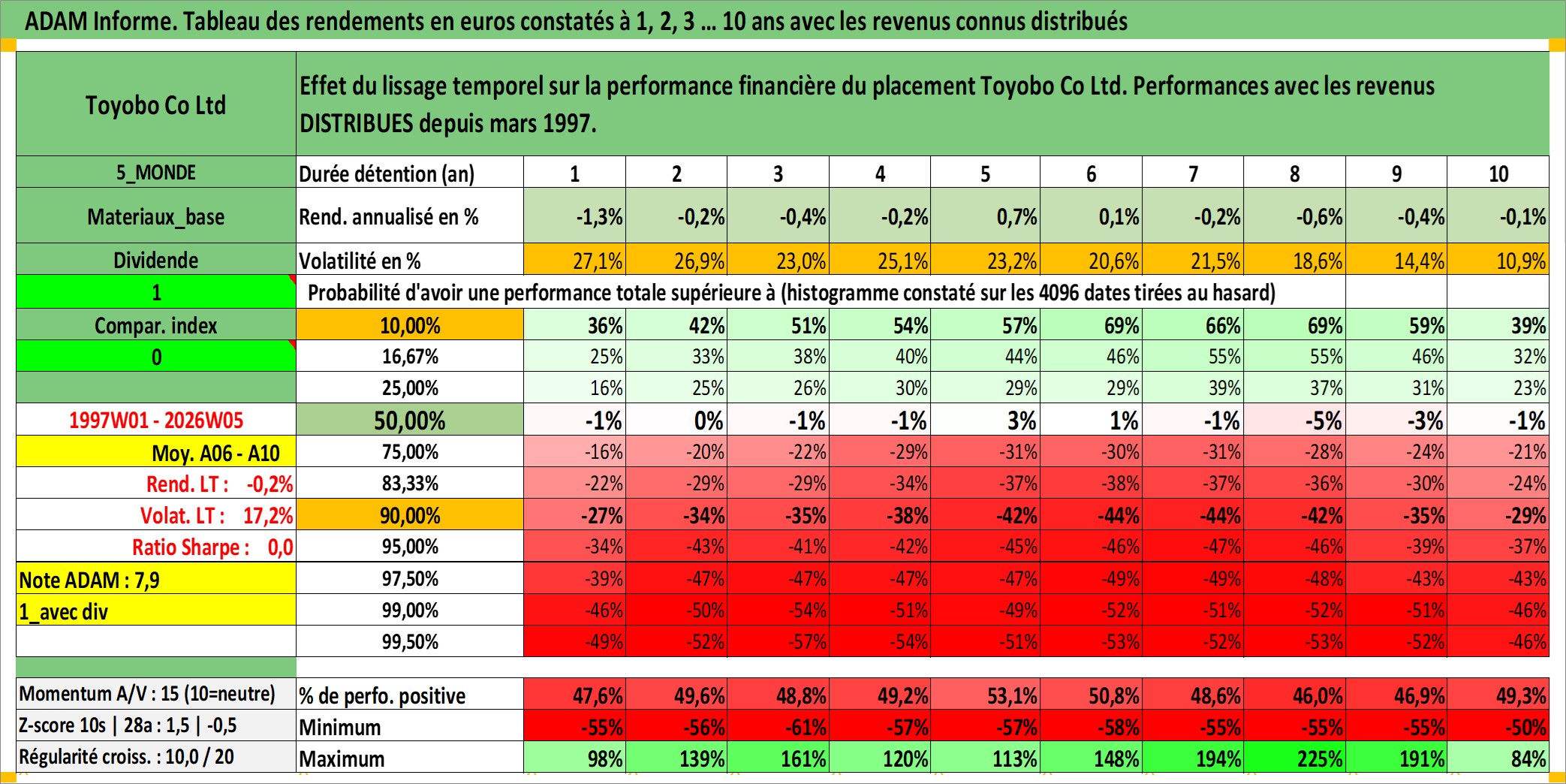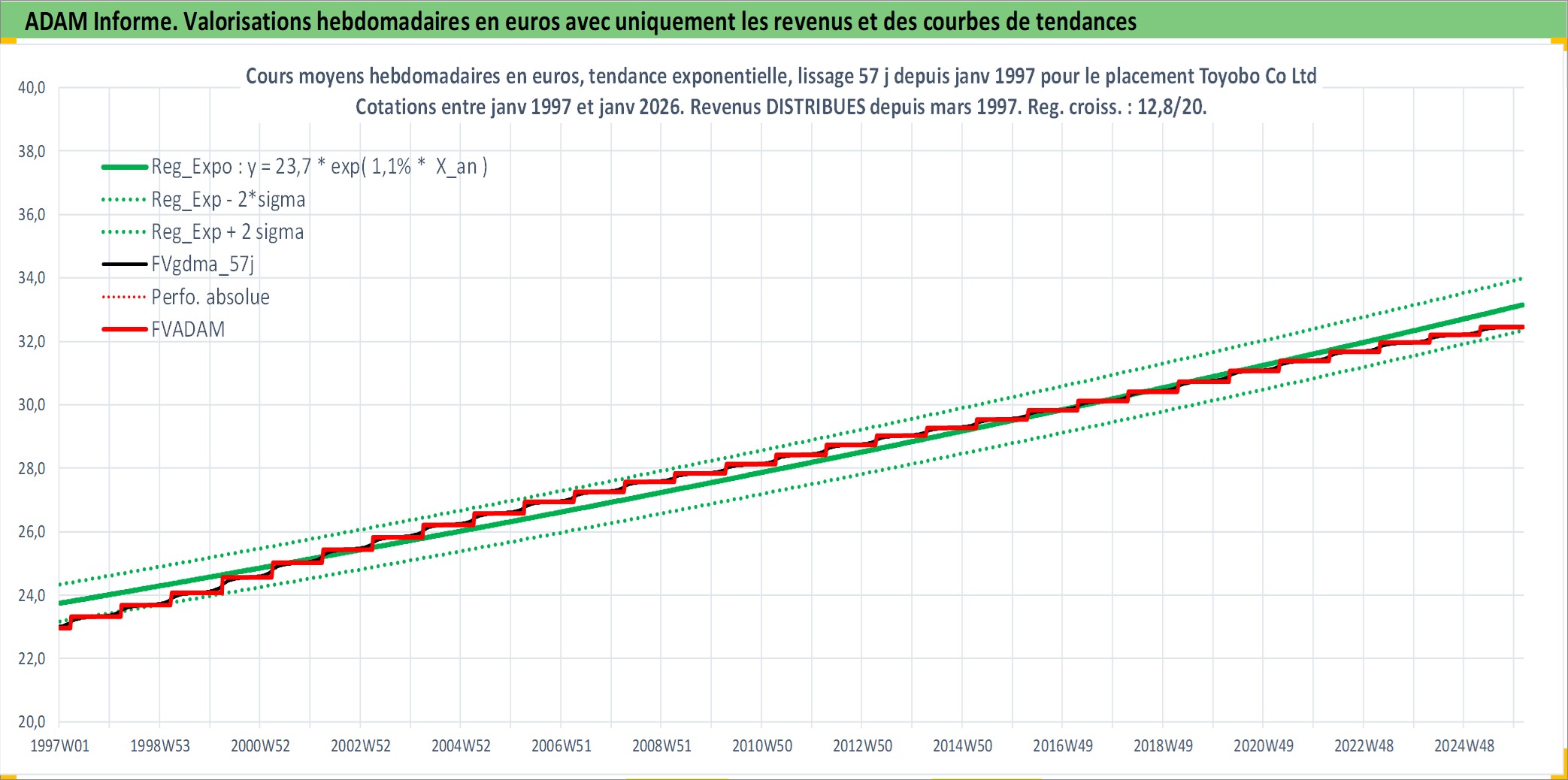 Site dédié aux investisseursPage dédiée sur site financeAnalyse des valorisations hebdomadaires de l'action Toyobo Co Ltd. Cet actif est cote en JPY. Les valorisations sont en contrevaleur EURO et couvrent les semaines 1997W01 a 2026W05. Les revenus de cet actif financier sont pris en compte depuis la semaine 1997W13. La note ESG de cet actif n'est pas connue.