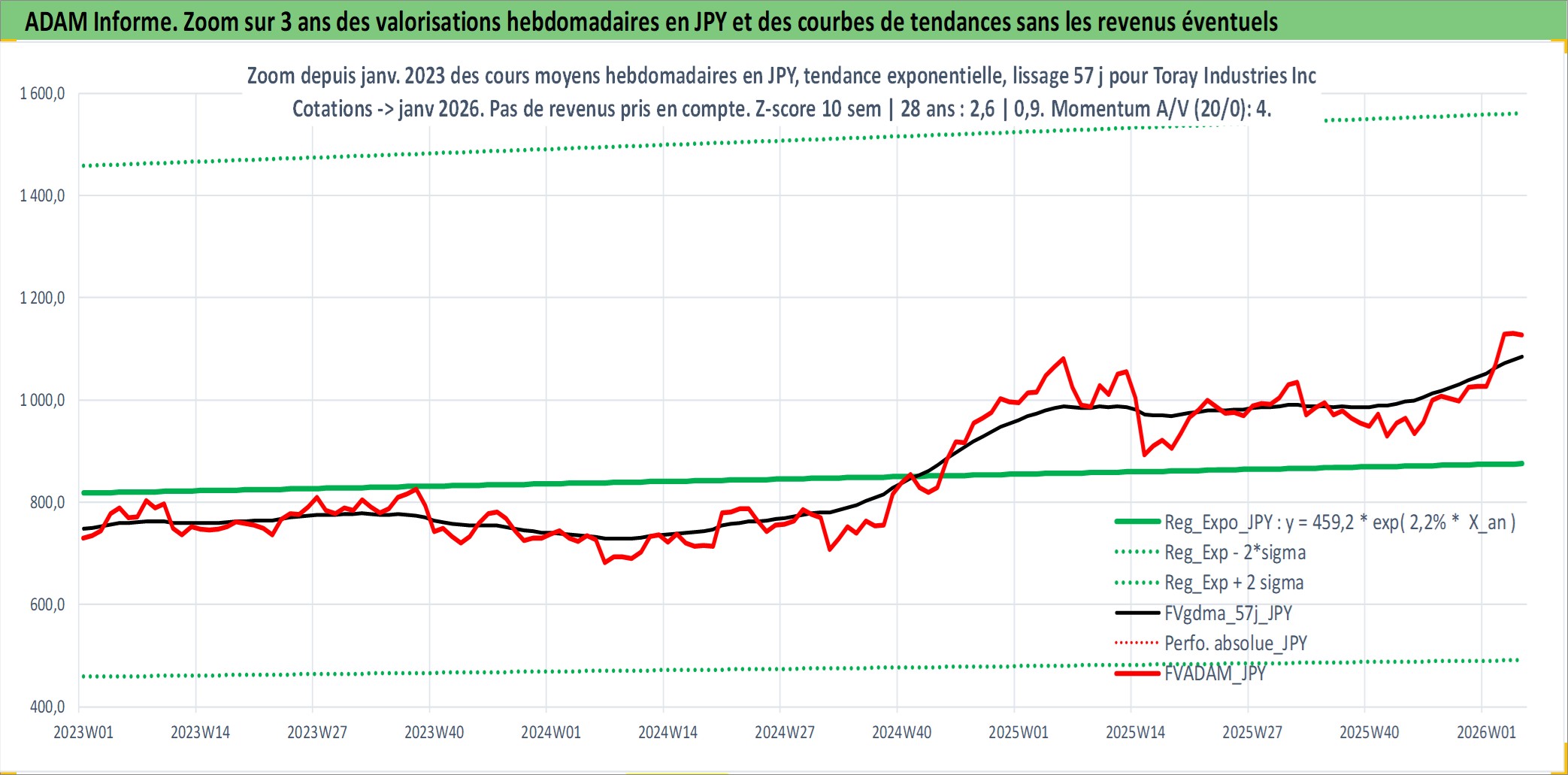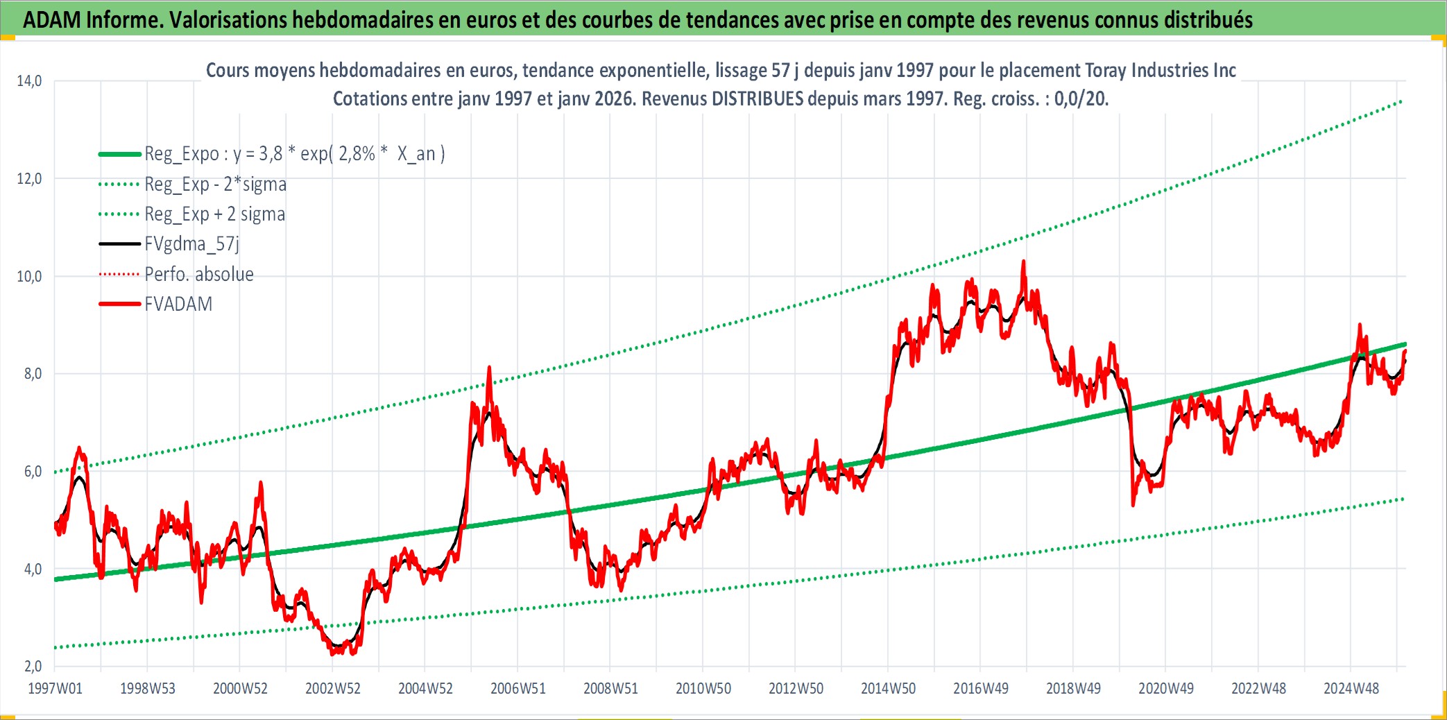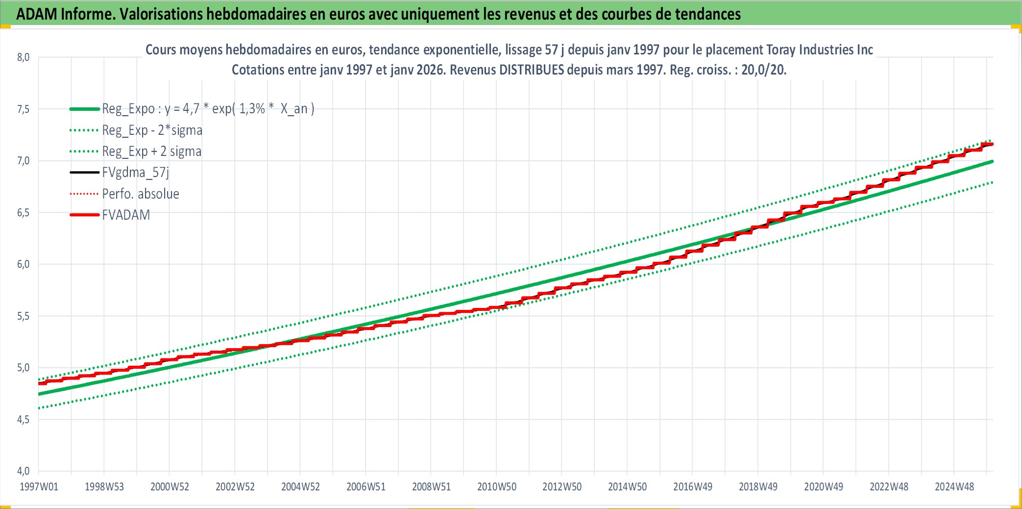 Site dédié aux investisseursPage dédiée sur site financeAnalyse des valorisations hebdomadaires de l'action Toray Industries Inc. Cet actif est cote en JPY. Les valorisations sont en contrevaleur EURO et couvrent les semaines 1997W01 a 2026W05. Les revenus de cet actif financier sont pris en compte depuis la semaine 1997W13. La note globale ESG de cet actif est estimee a 9.0 (apres rebasage entre 0 et 20).