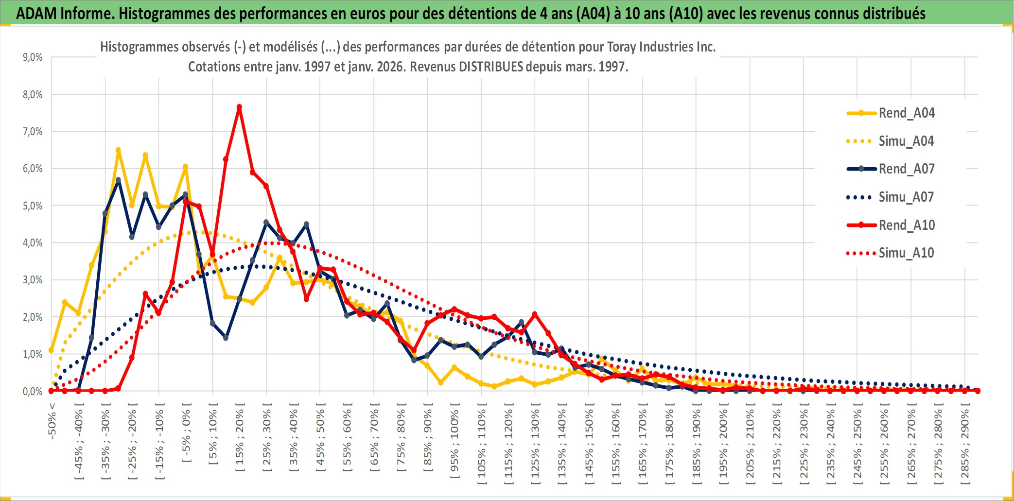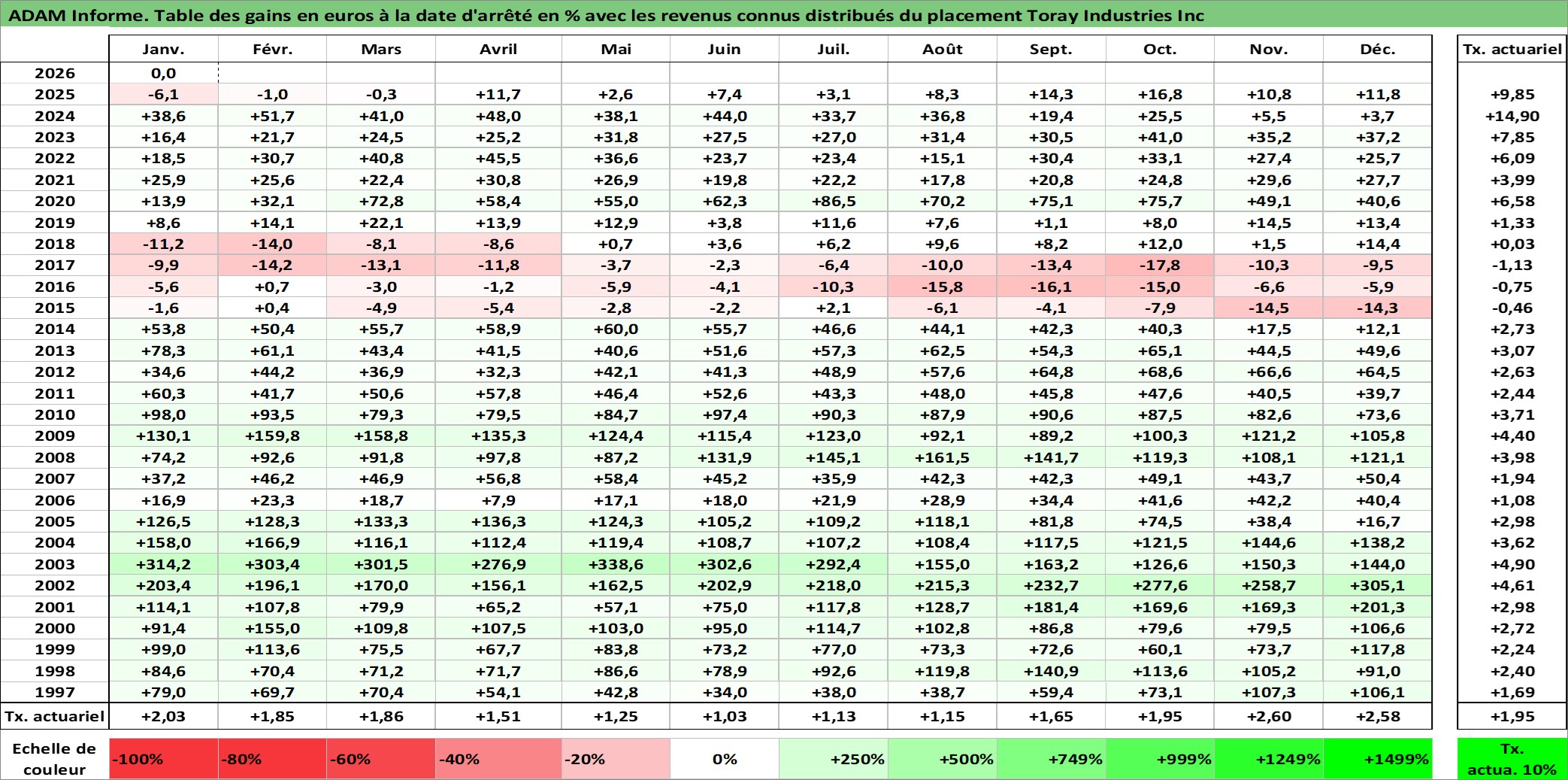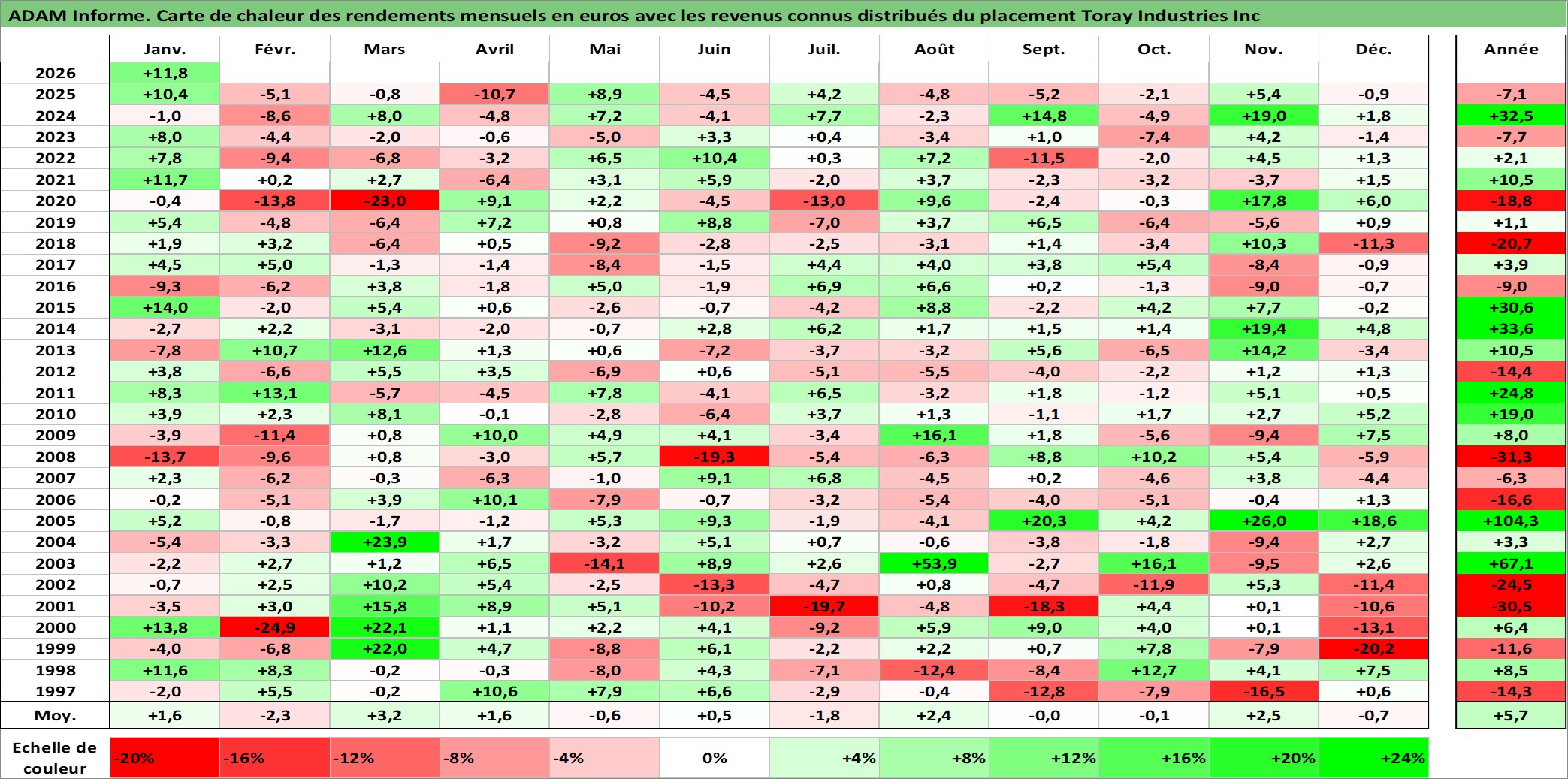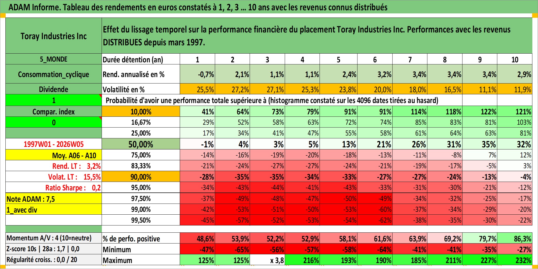 Site dédié aux investisseursPage dédiée sur site financeAnalyse des valorisations hebdomadaires de l'action Toray Industries Inc. Cet actif est cote en JPY. Les valorisations sont en contrevaleur EURO et couvrent les semaines 1997W01 a 2026W05. Les revenus de cet actif financier sont pris en compte depuis la semaine 1997W13. La note globale ESG de cet actif est estimee a 9.0 (apres rebasage entre 0 et 20).