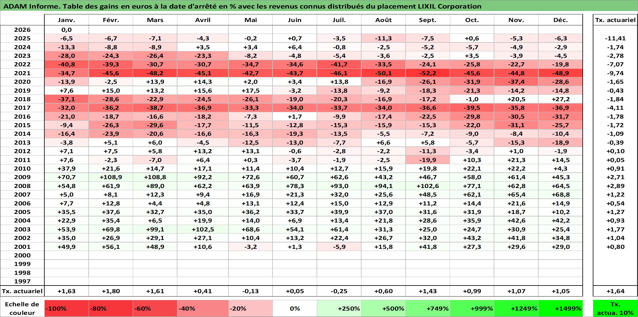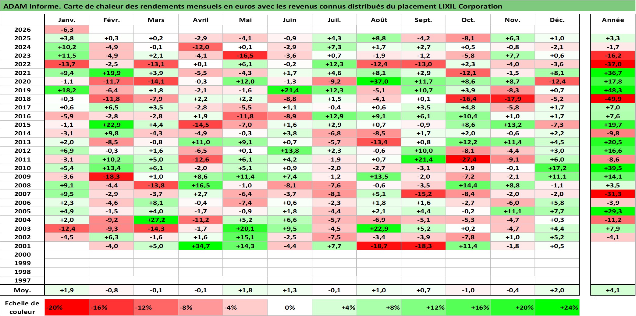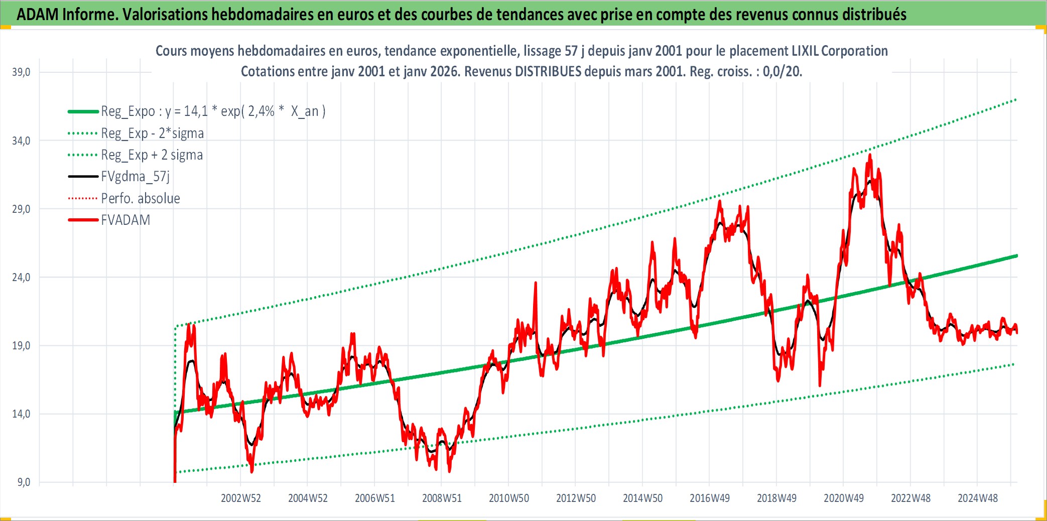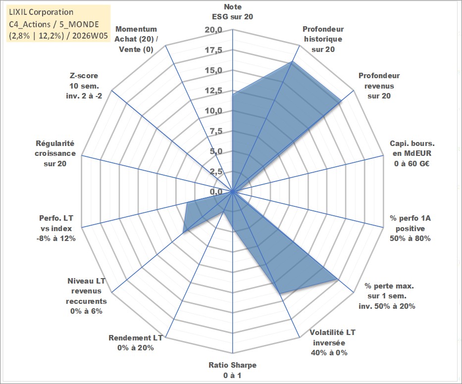 Site dédié aux investisseursPage dédiée sur site financeAnalyse des valorisations hebdomadaires de l'action LIXIL Corporation. Cet actif est cote en JPY. Les valorisations sont en contrevaleur EURO et couvrent les semaines 2001W02 a 2026W05. Les revenus de cet actif financier sont pris en compte depuis la semaine 2001W13. La note globale ESG de cet actif est estimee a 12.0 (apres rebasage entre 0 et 20).