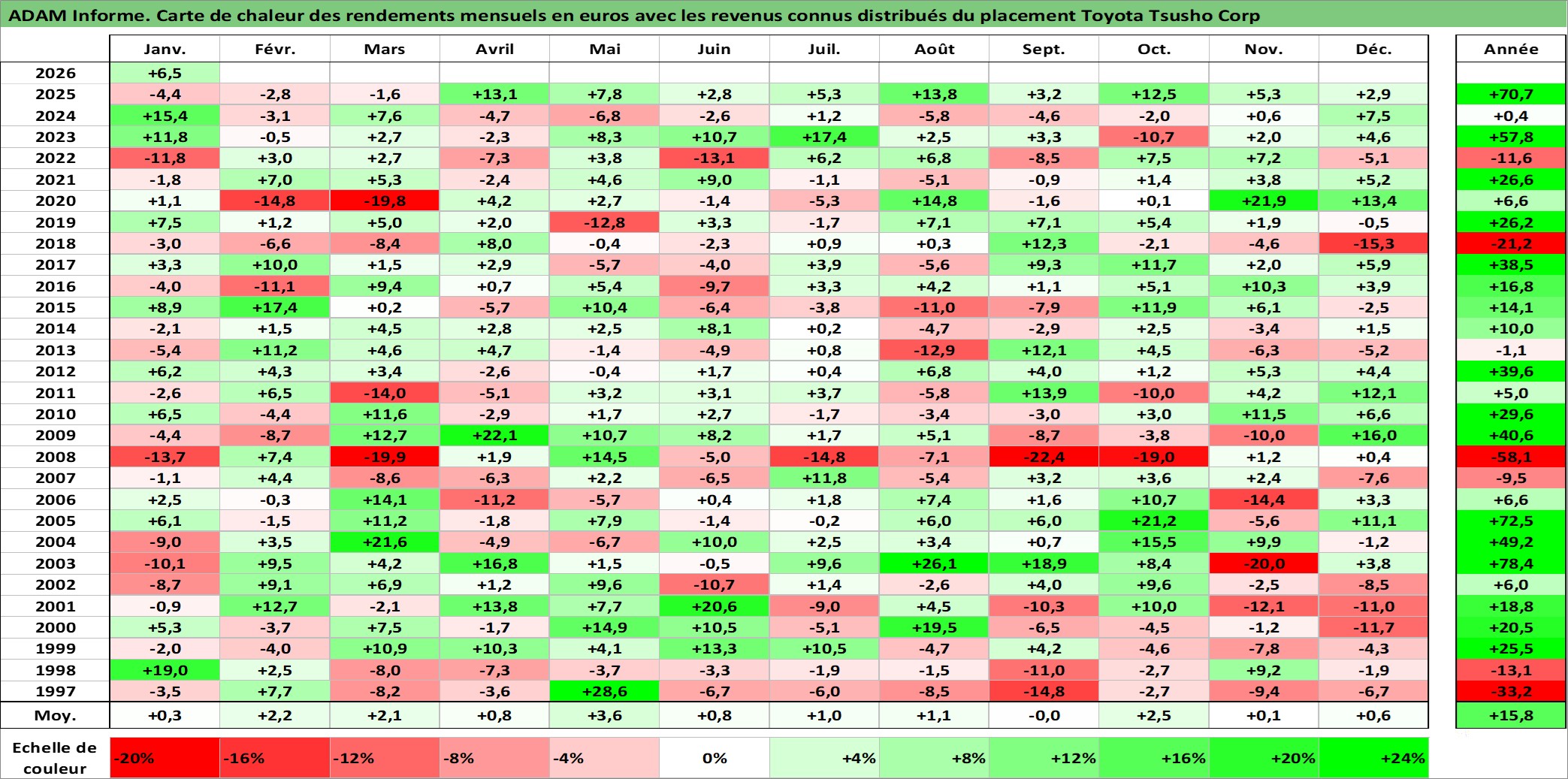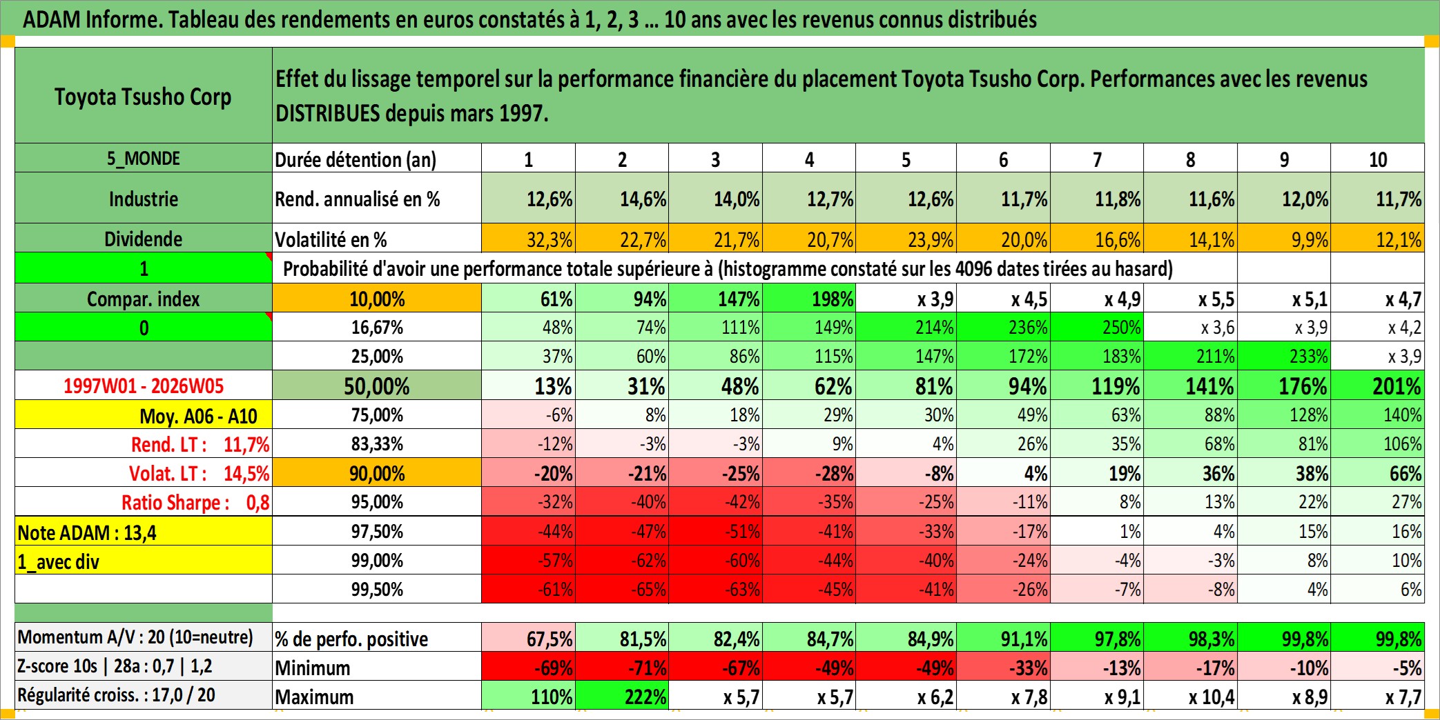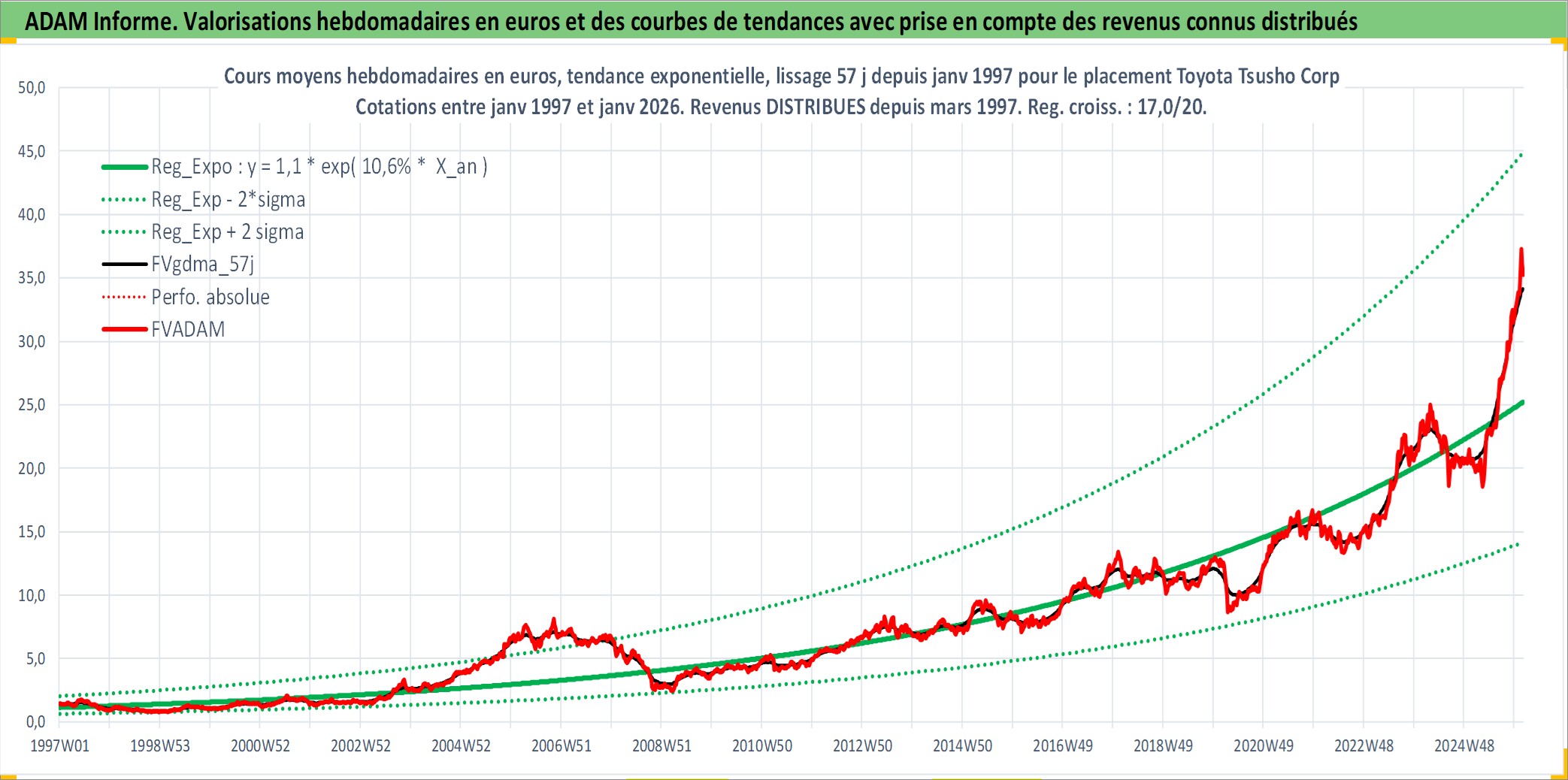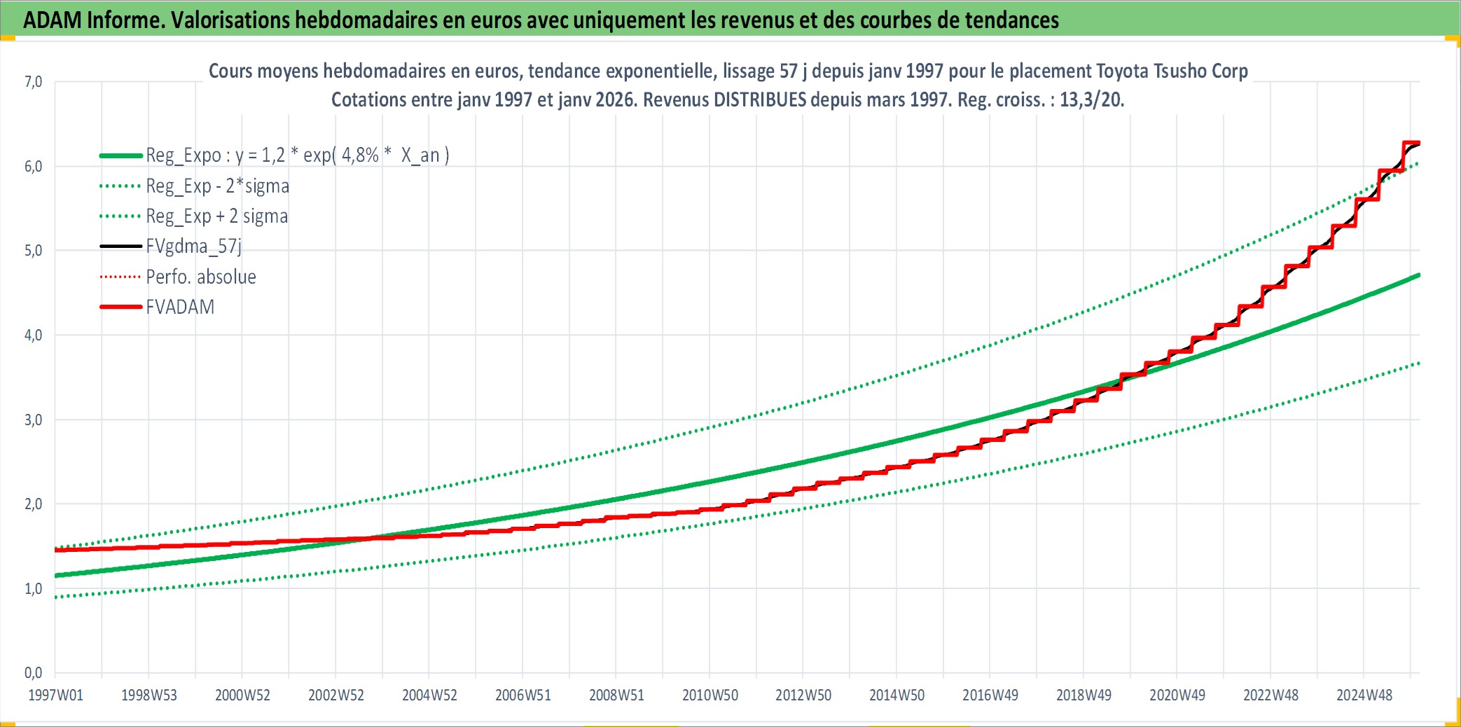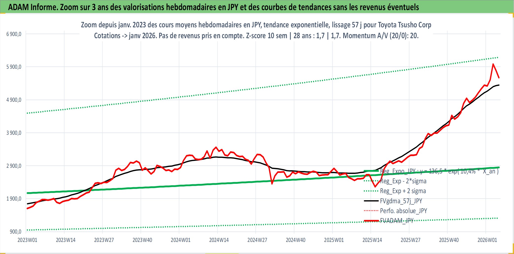 Site dédié aux investisseursPage dédiée sur site financeAnalyse des valorisations hebdomadaires de l'action Toyota Tsusho Corp. Cet actif est cote en JPY. Les valorisations sont en contrevaleur EURO et couvrent les semaines 1997W01 a 2026W05. Les revenus de cet actif financier sont pris en compte depuis la semaine 1997W13. La note globale ESG de cet actif est estimee a 8.0 (apres rebasage entre 0 et 20).