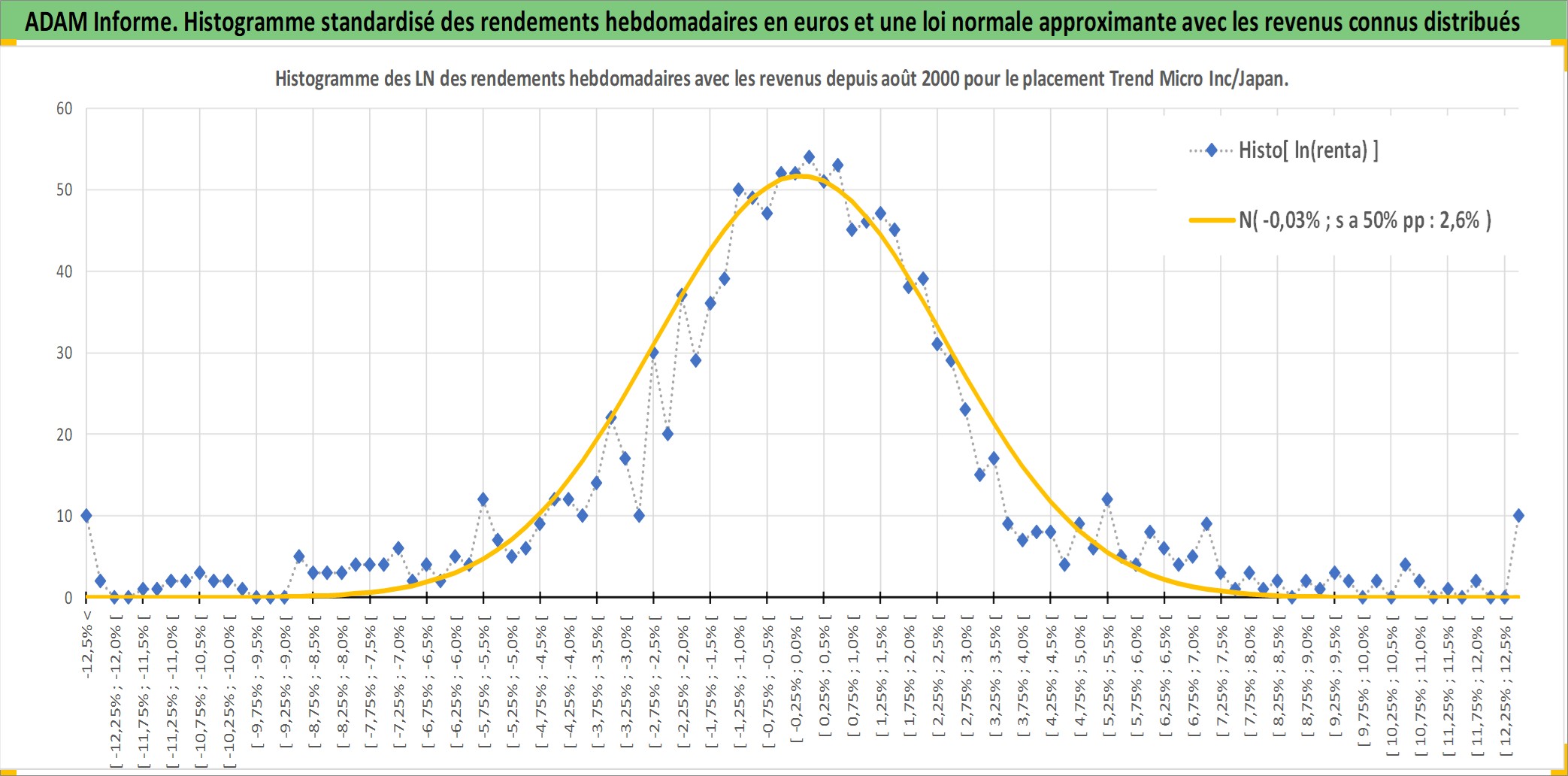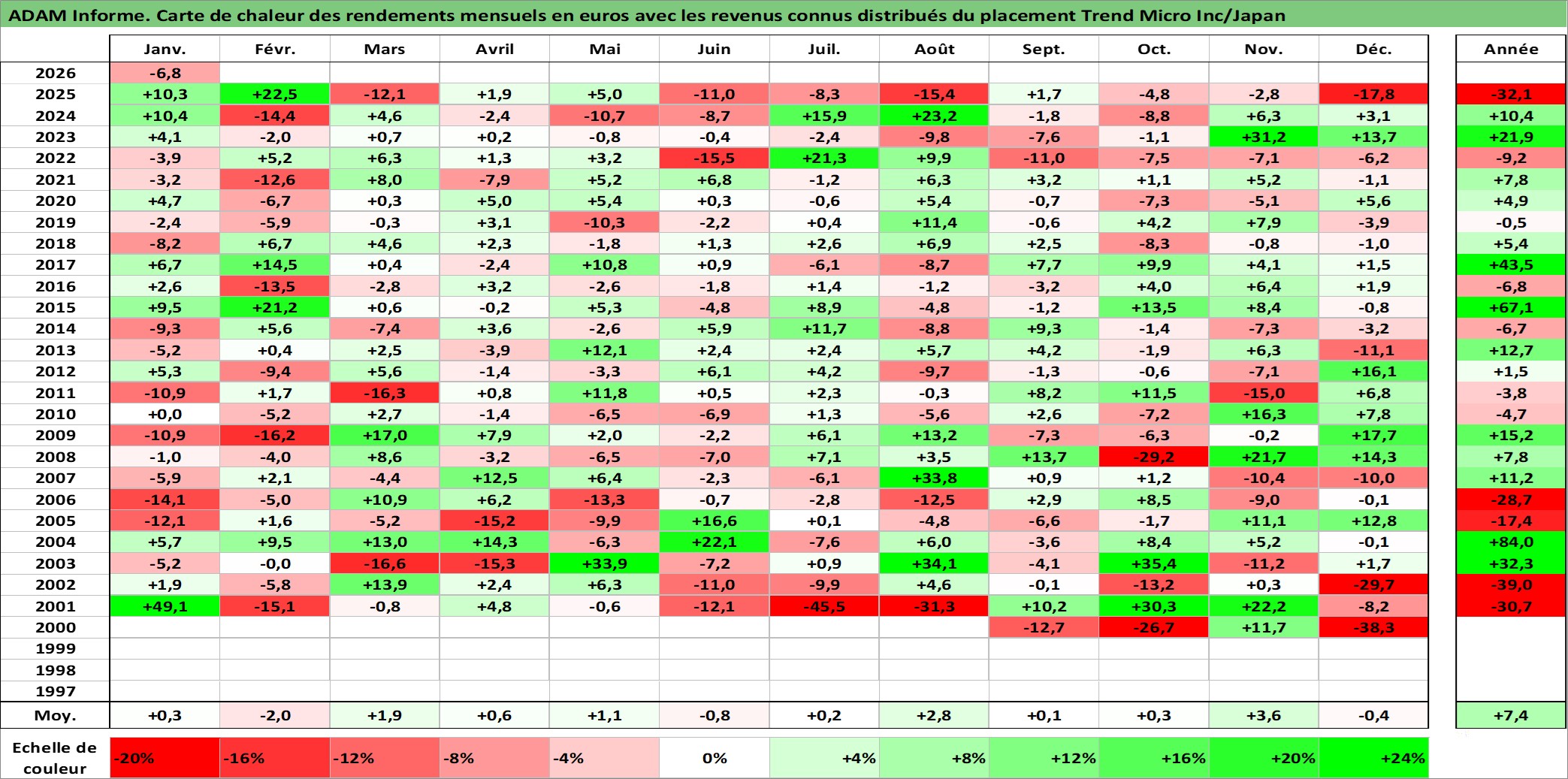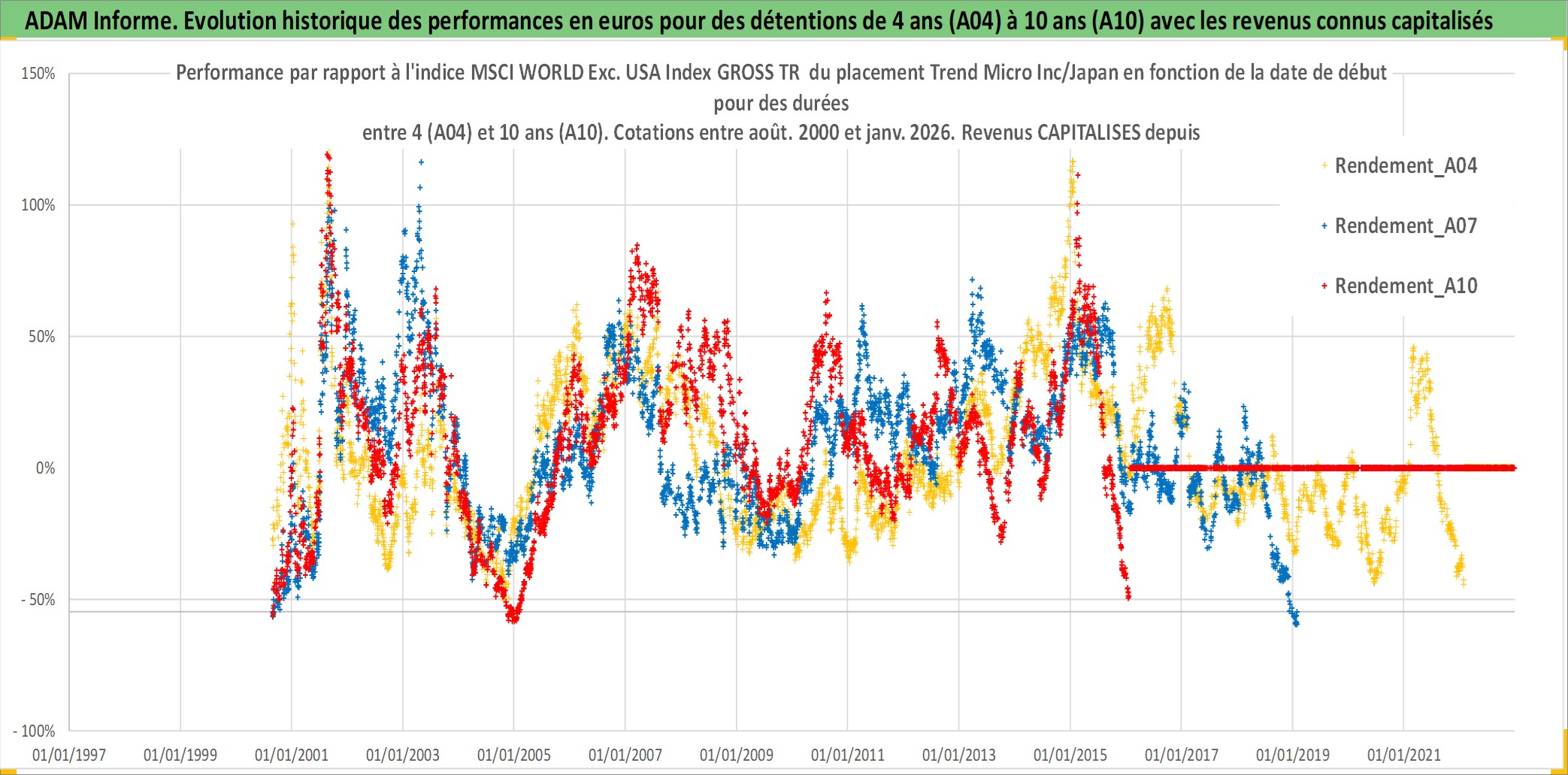 Site dédié aux investisseursPage dédiée sur site financeAnalyse des valorisations hebdomadaires de l'action Trend Micro Inc/Japan. Cet actif est cote en JPY. Les valorisations sont en contrevaleur EURO et couvrent les semaines 2000W33 a 2026W05. Les revenus de cet actif financier sont pris en compte depuis la semaine 2003W52. La note globale ESG de cet actif est estimee a 9.0 (apres rebasage entre 0 et 20).