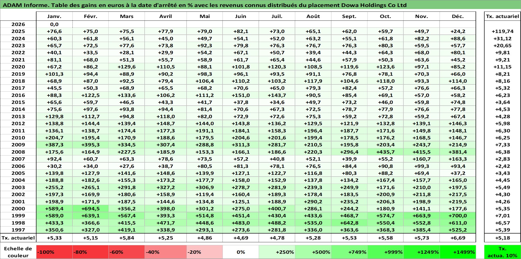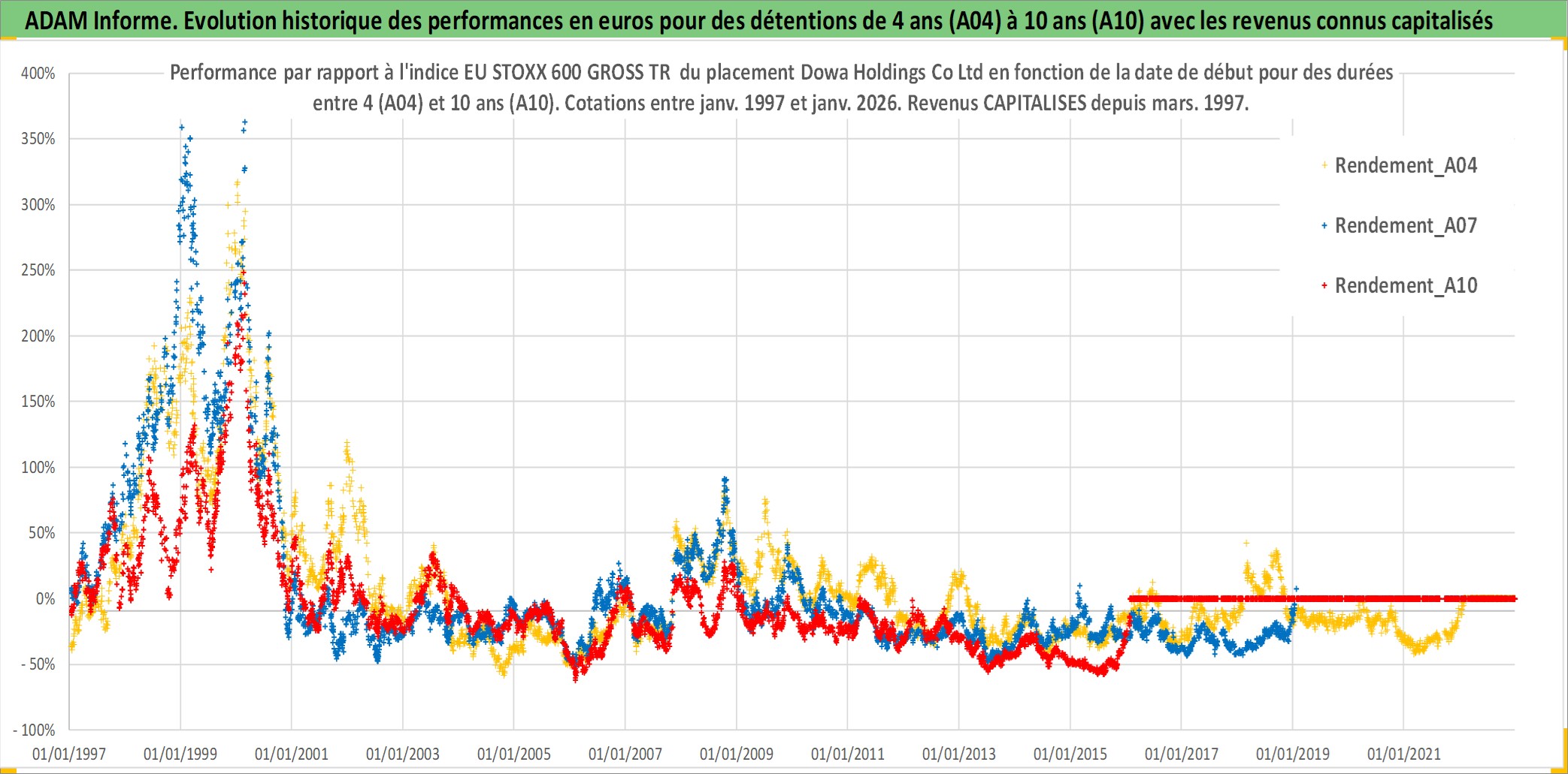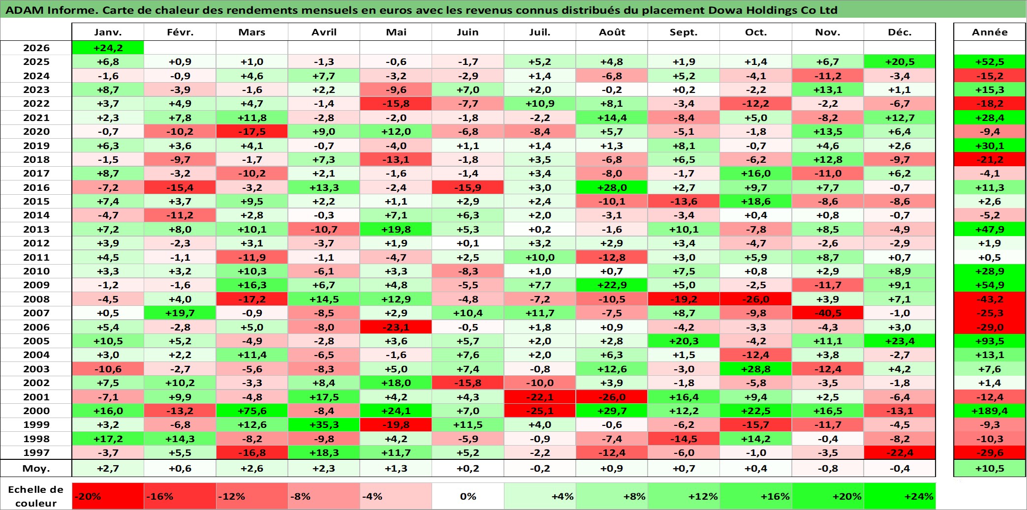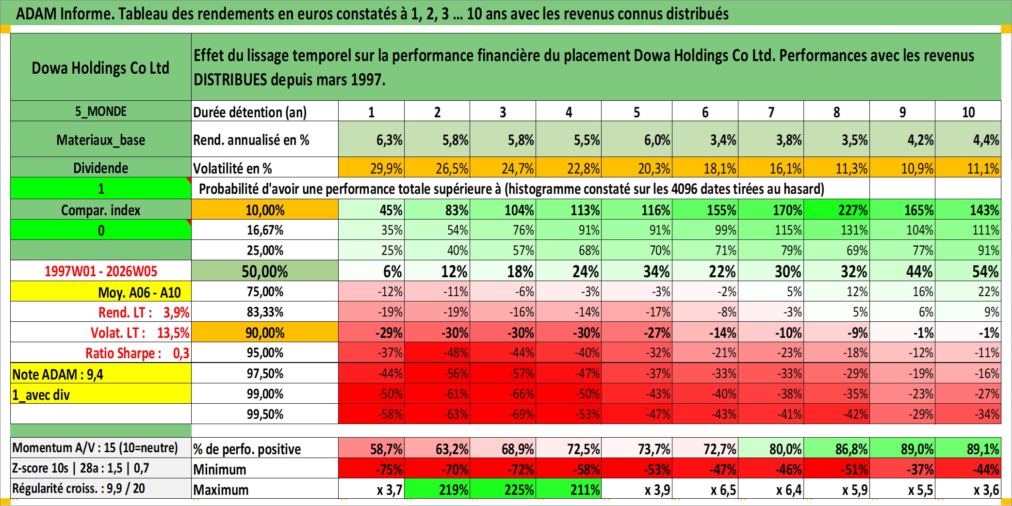 Site dédié aux investisseursPage dédiée sur site financeAnalyse des valorisations hebdomadaires de l'action Dowa Holdings Co Ltd. Cet actif est cote en JPY. Les valorisations sont en contrevaleur EURO et couvrent les semaines 1997W01 a 2026W05. Les revenus de cet actif financier sont pris en compte depuis la semaine 1997W13. La note ESG de cet actif n'est pas connue.
