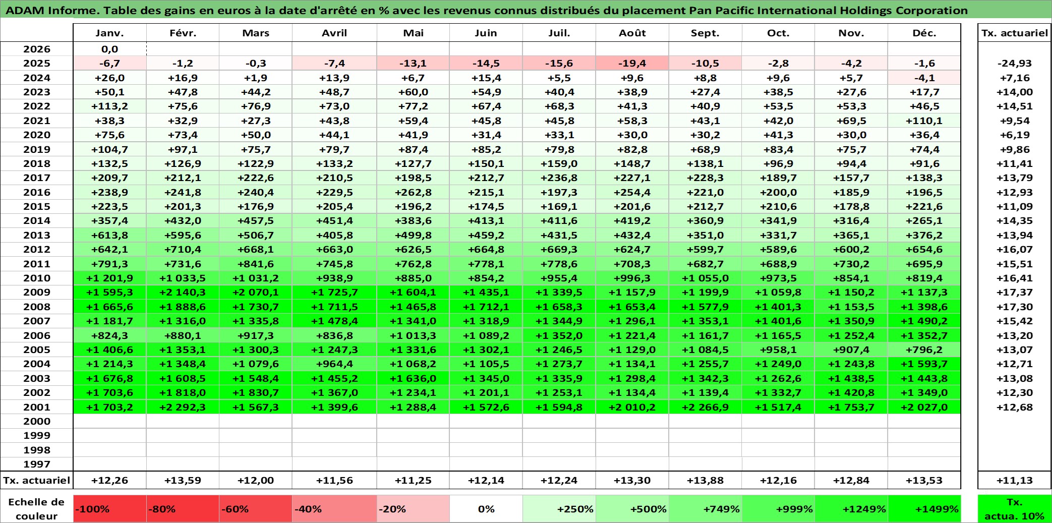 Site dédié aux investisseursPage dédiée sur site financeAnalyse des valorisations hebdomadaires de l'action Pan Pacific International Holdings Corporation. Cet actif est cote en JPY. Les valorisations sont en contrevaleur EURO et couvrent les semaines 2001W02 a 2026W05. Les revenus de cet actif financier sont pris en compte depuis la semaine 2001W26. La note globale ESG de cet actif est estimee a 11.0 (apres rebasage entre 0 et 20).