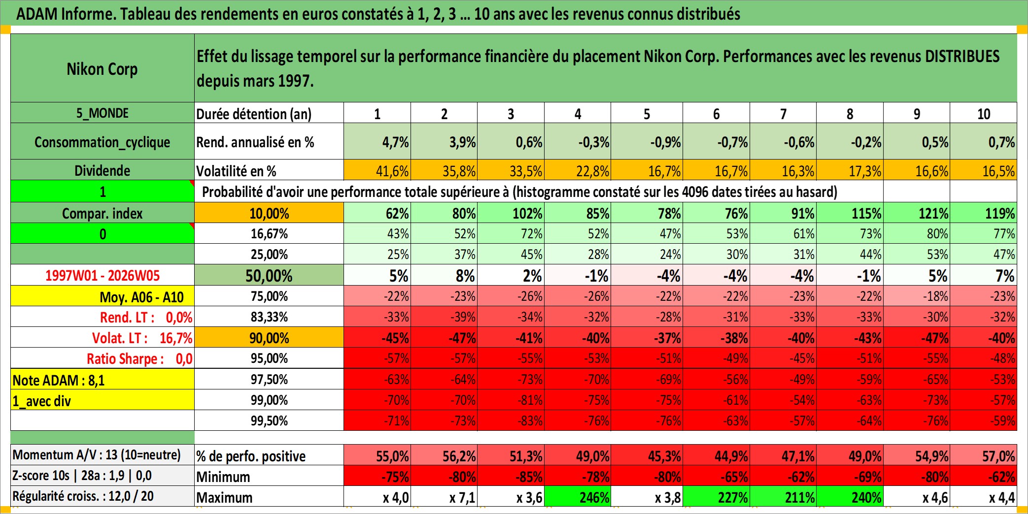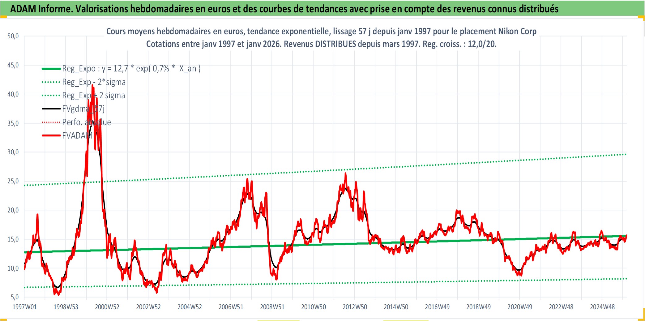 Site dédié aux investisseursPage dédiée sur site financeAnalyse des valorisations hebdomadaires de l'action Nikon Corp. Cet actif est cote en JPY. Les valorisations sont en contrevaleur EURO et couvrent les semaines 1997W01 a 2026W05. Les revenus de cet actif financier sont pris en compte depuis la semaine 1997W13. La note globale ESG de cet actif est estimee a 13.0 (apres rebasage entre 0 et 20).