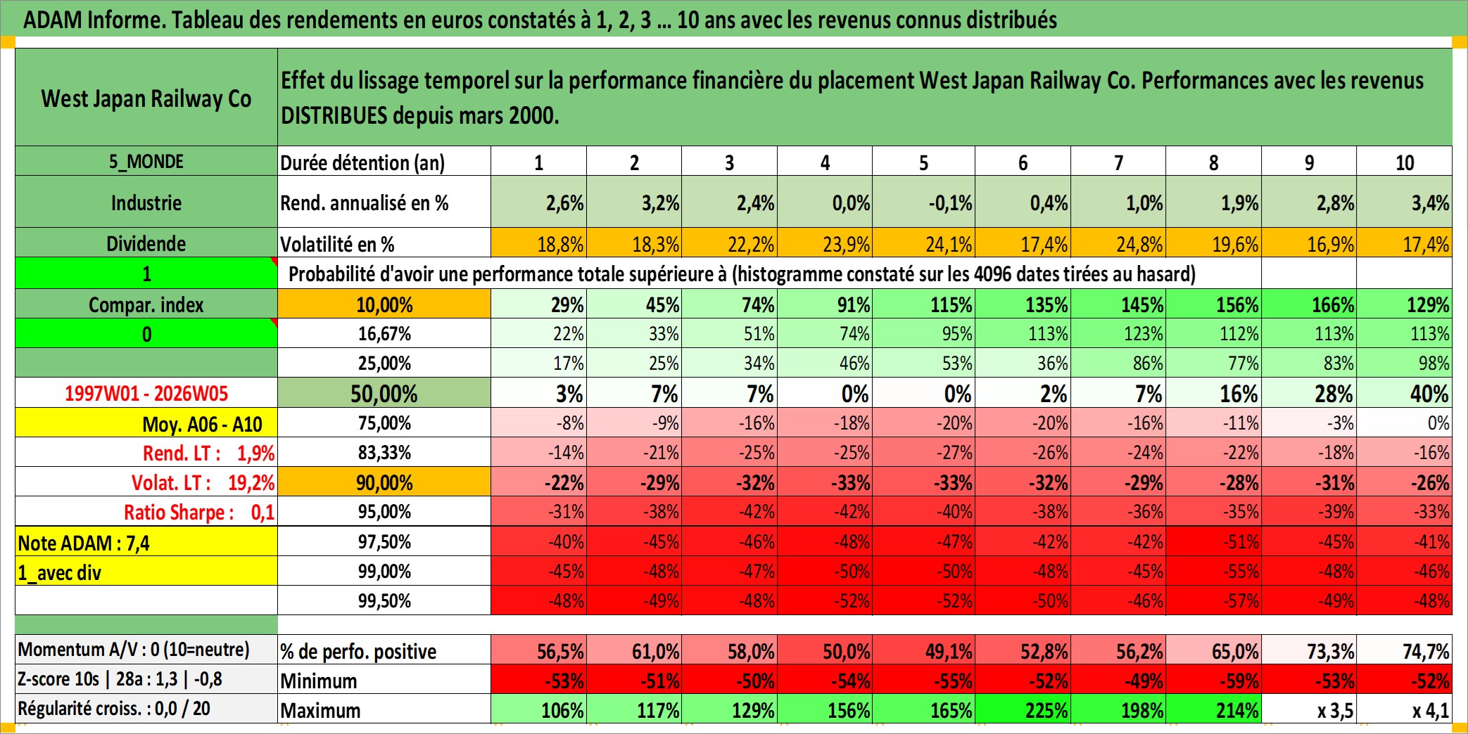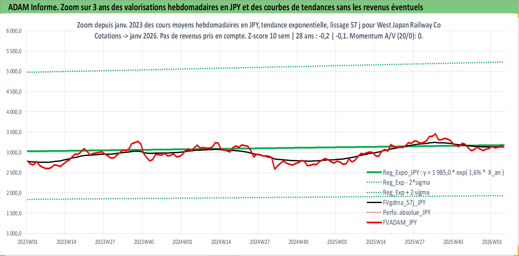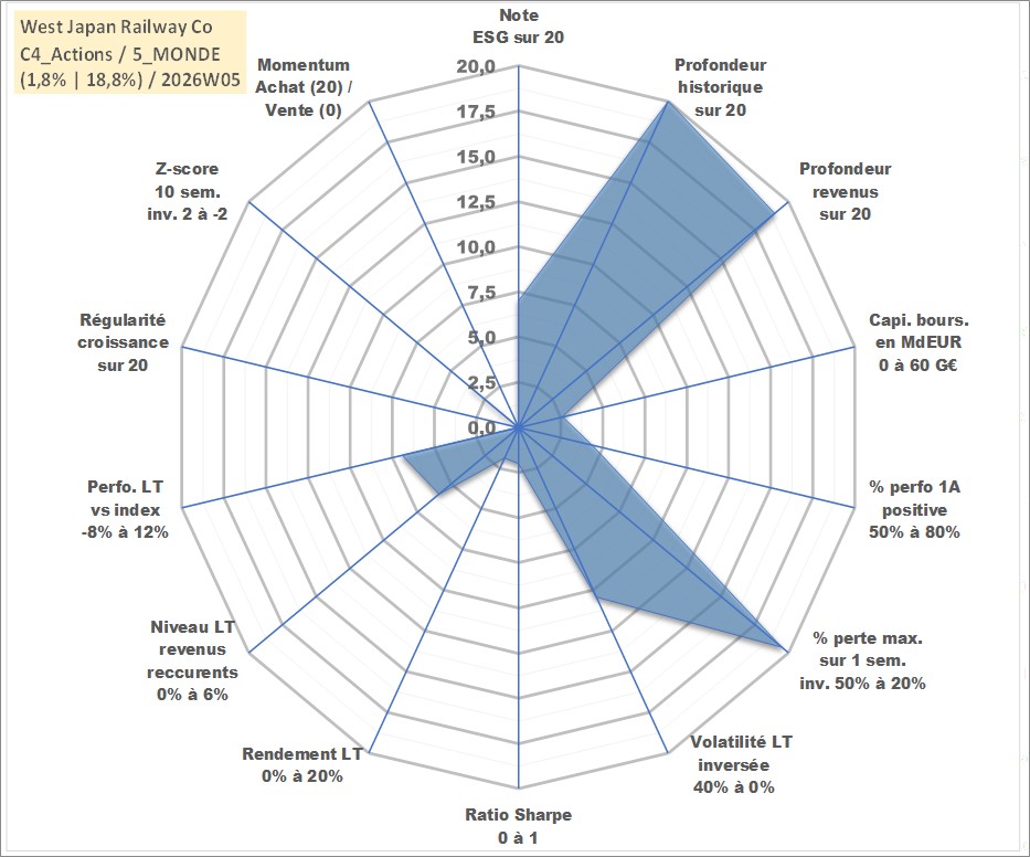 Site dédié aux investisseursPage dédiée sur site financeAnalyse des valorisations hebdomadaires de l'action West Japan Railway Co. Cet actif est cote en JPY. Les valorisations sont en contrevaleur EURO et couvrent les semaines 1997W01 a 2026W05. Les revenus de cet actif financier sont pris en compte depuis la semaine 2000W13. La note globale ESG de cet actif est estimee a 7.0 (apres rebasage entre 0 et 20).