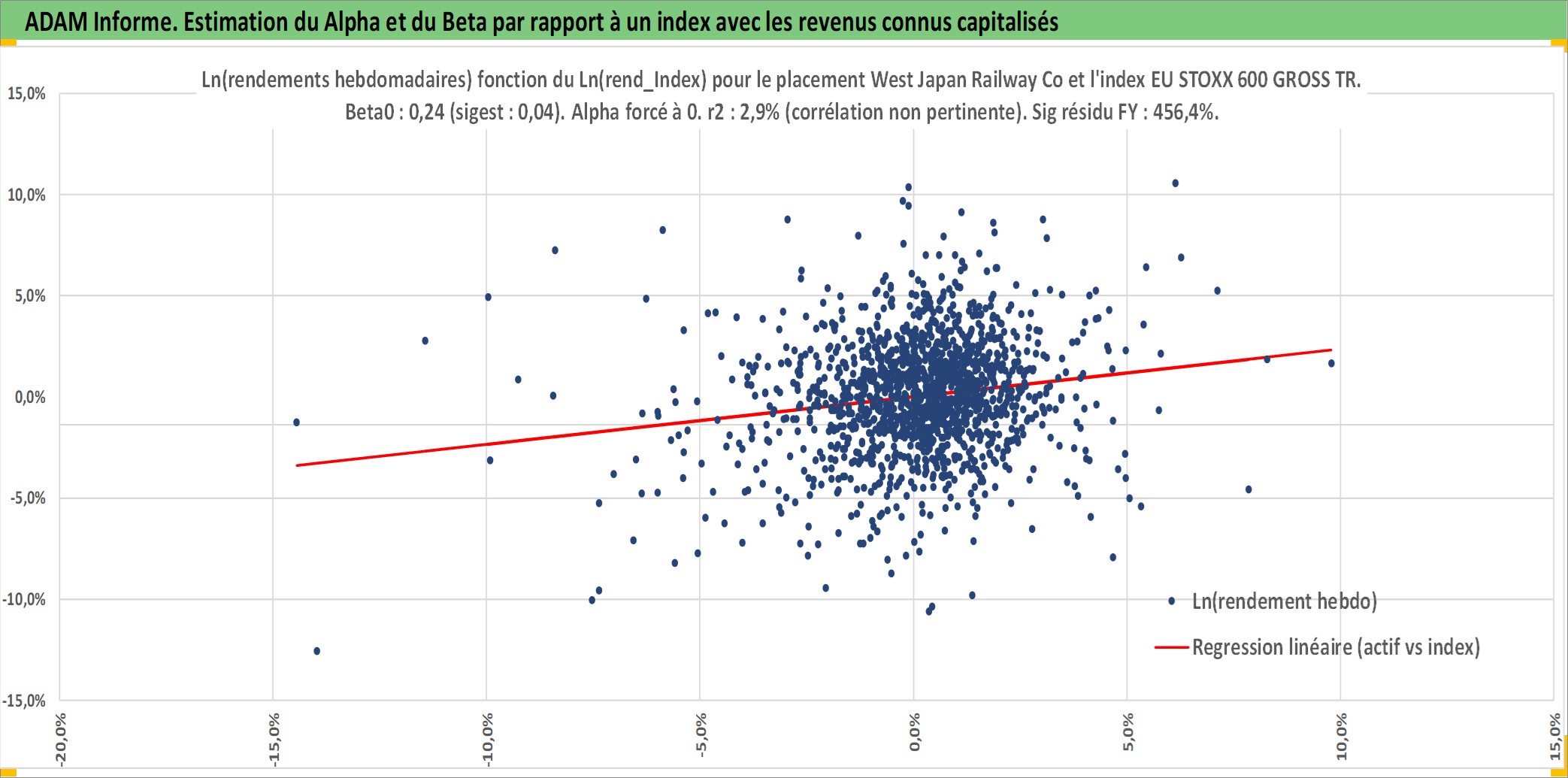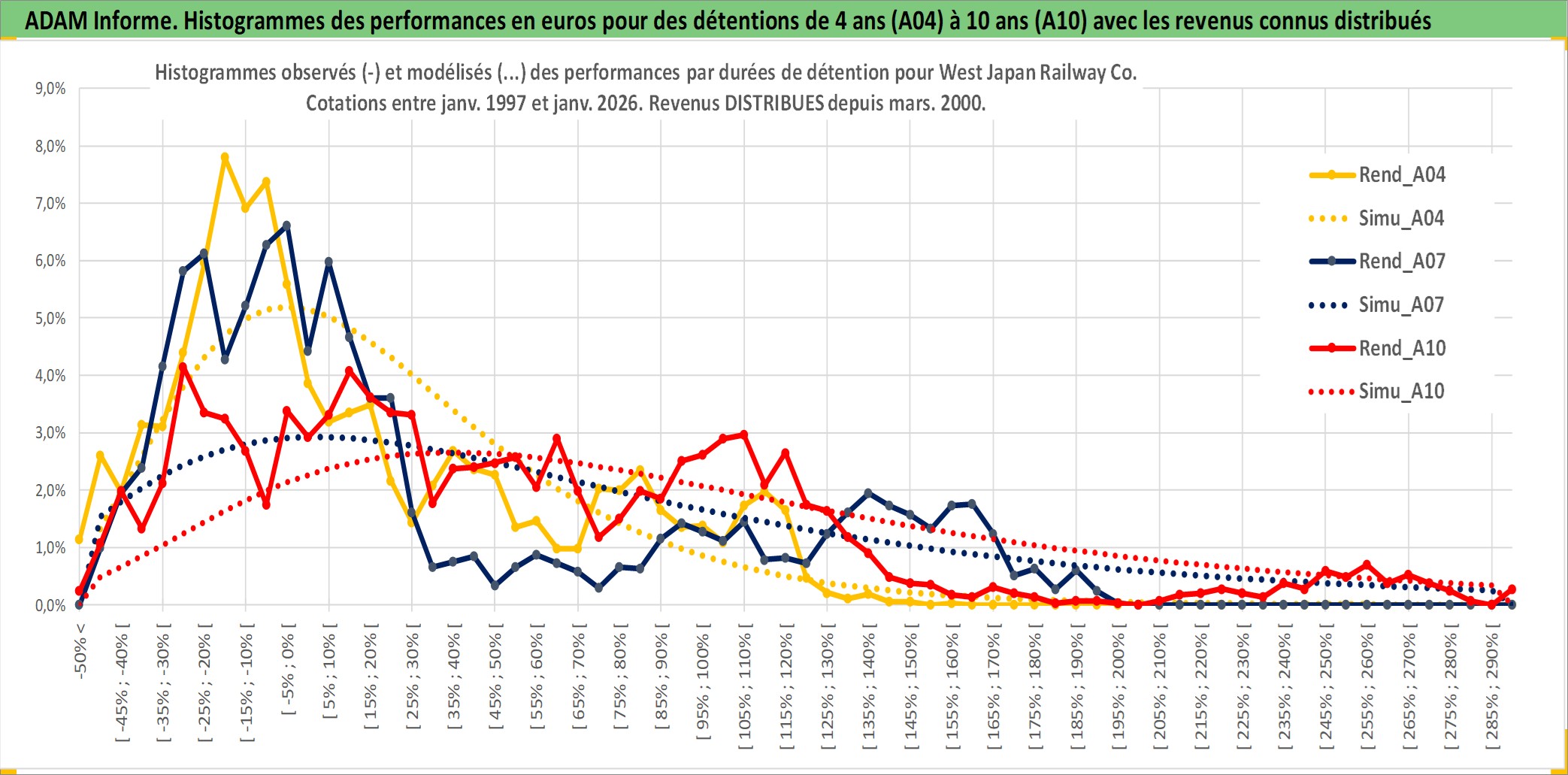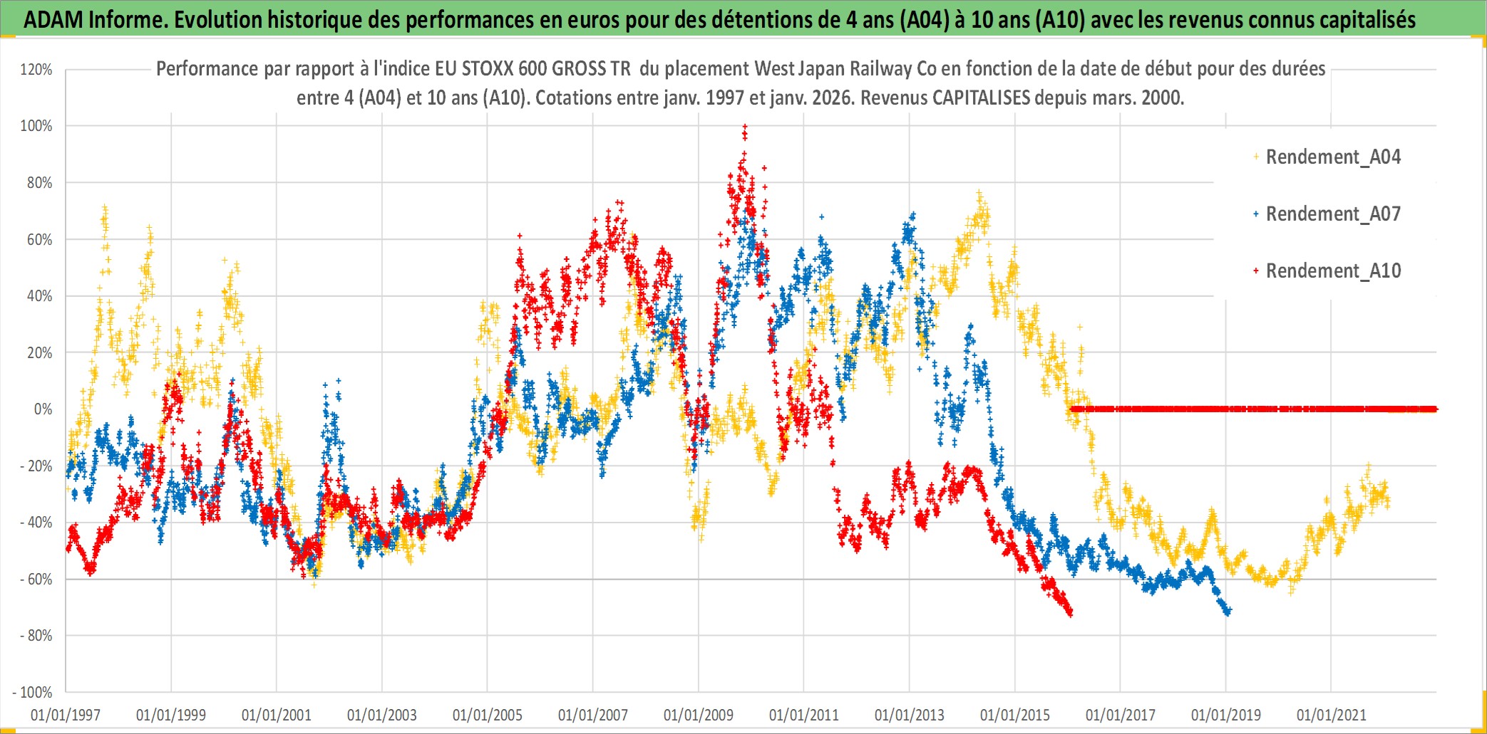 Site dédié aux investisseursPage dédiée sur site financeAnalyse des valorisations hebdomadaires de l'action West Japan Railway Co. Cet actif est cote en JPY. Les valorisations sont en contrevaleur EURO et couvrent les semaines 1997W01 a 2026W05. Les revenus de cet actif financier sont pris en compte depuis la semaine 2000W13. La note globale ESG de cet actif est estimee a 7.0 (apres rebasage entre 0 et 20).