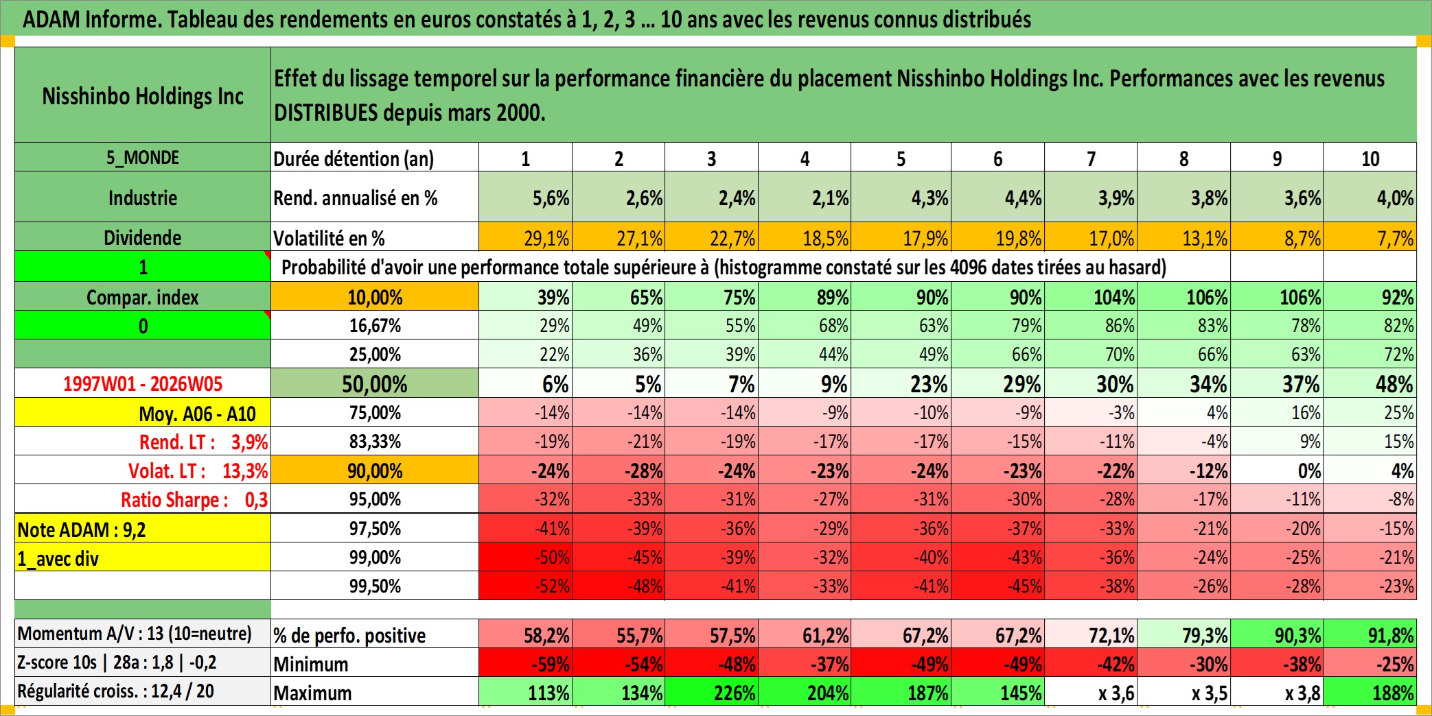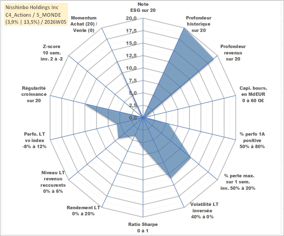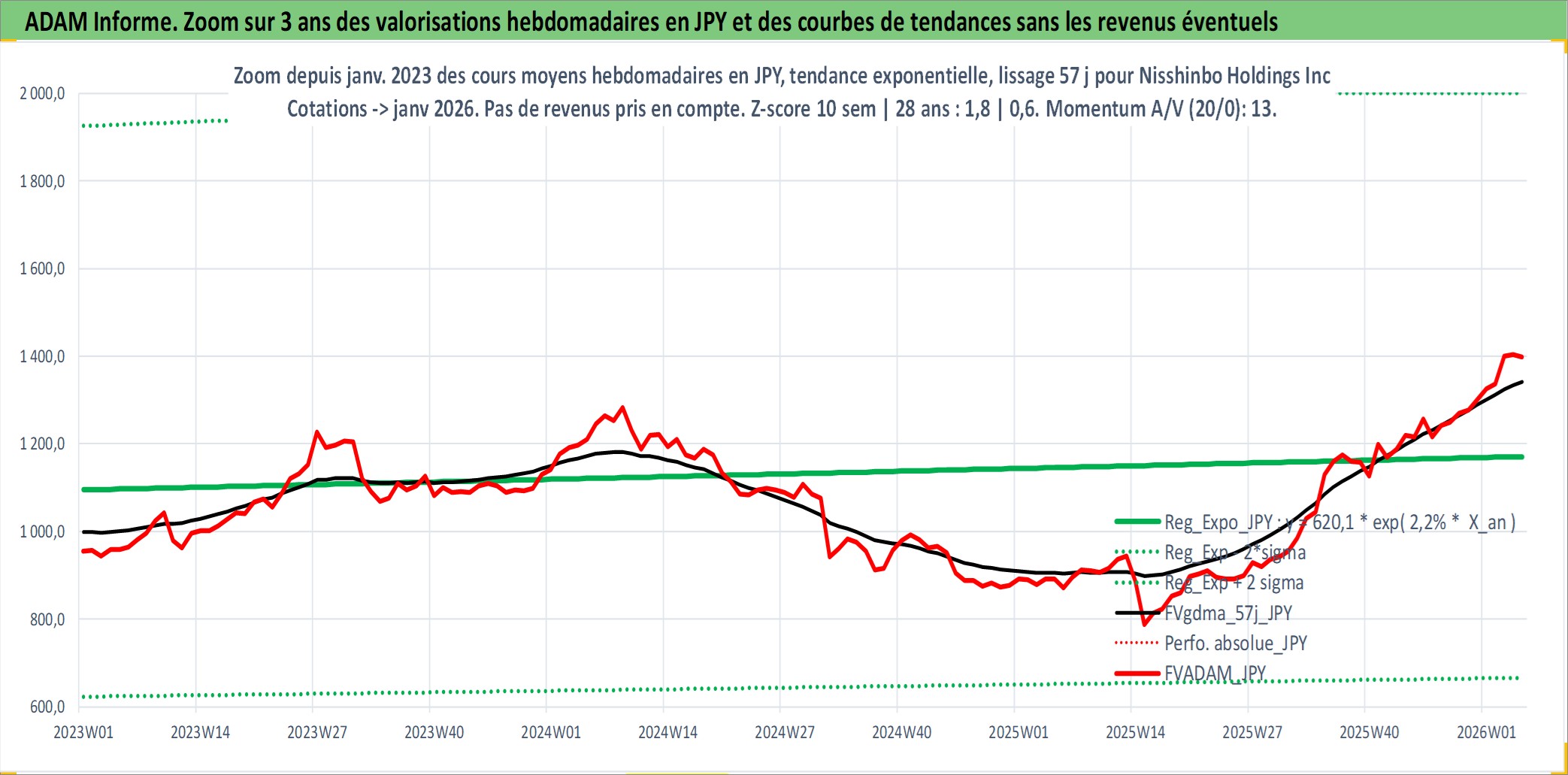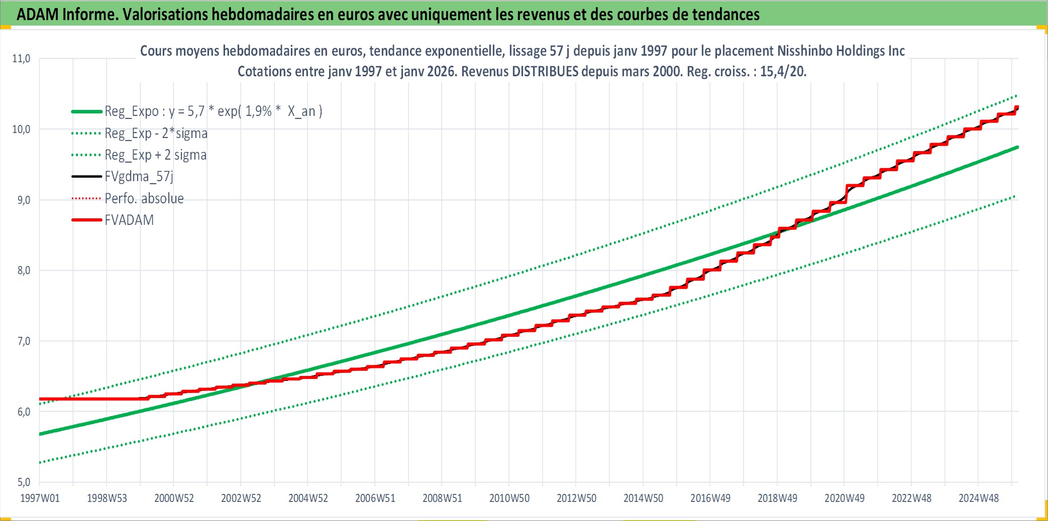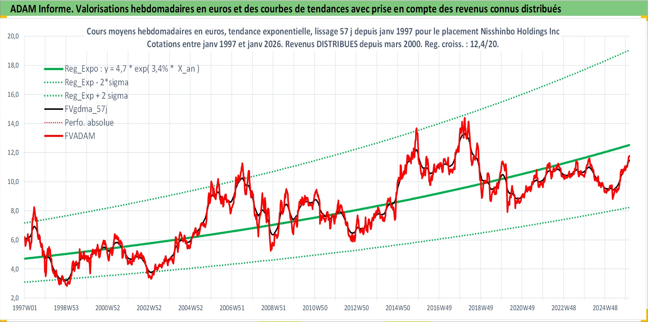 Site dédié aux investisseursPage dédiée sur site financeAnalyse des valorisations hebdomadaires de l'action Nisshinbo Holdings Inc. Cet actif est cote en JPY. Les valorisations sont en contrevaleur EURO et couvrent les semaines 1997W01 a 2026W05. Les revenus de cet actif financier sont pris en compte depuis la semaine 2000W13. La note ESG de cet actif n'est pas connue.