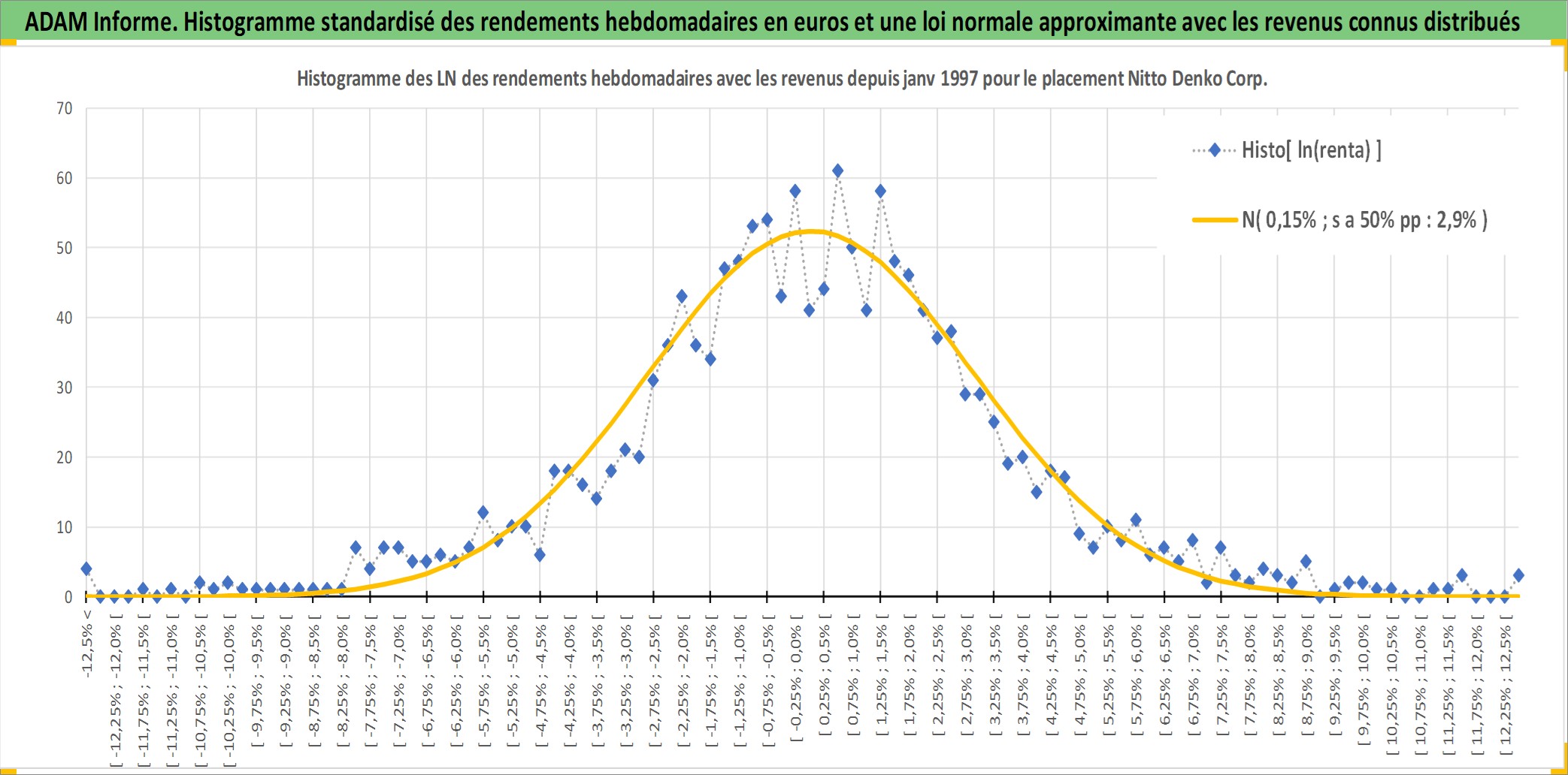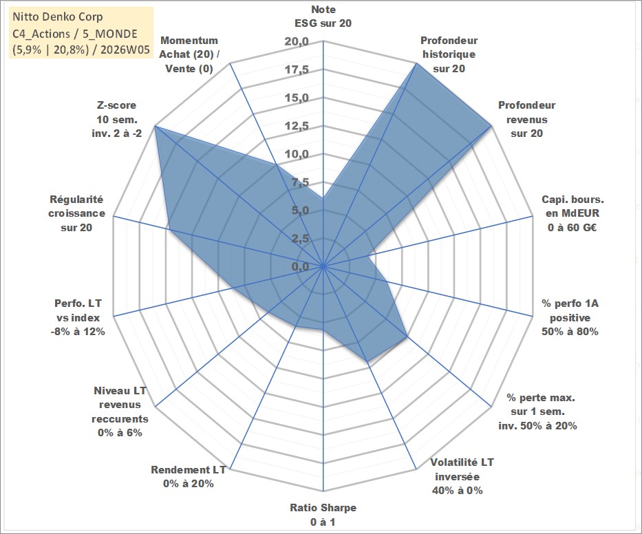 Site dédié aux investisseursPage dédiée sur site financeAnalyse des valorisations hebdomadaires de l'action Nitto Denko Corp. Cet actif est cote en JPY. Les valorisations sont en contrevaleur EURO et couvrent les semaines 1997W01 a 2026W05. Les revenus de cet actif financier sont pris en compte depuis la semaine 1997W13. La note globale ESG de cet actif est estimee a 6.0 (apres rebasage entre 0 et 20).