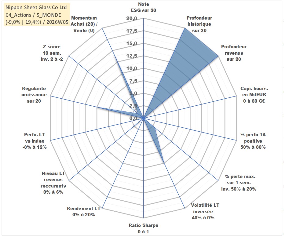 Site dédié aux investisseursPage dédiée sur site financeAnalyse des valorisations hebdomadaires de l'action Nippon Sheet Glass Co Ltd. Cet actif est cote en JPY. Les valorisations sont en contrevaleur EURO et couvrent les semaines 1997W01 a 2026W05. Les revenus de cet actif financier sont pris en compte depuis la semaine 1997W13. La note ESG de cet actif n'est pas connue.