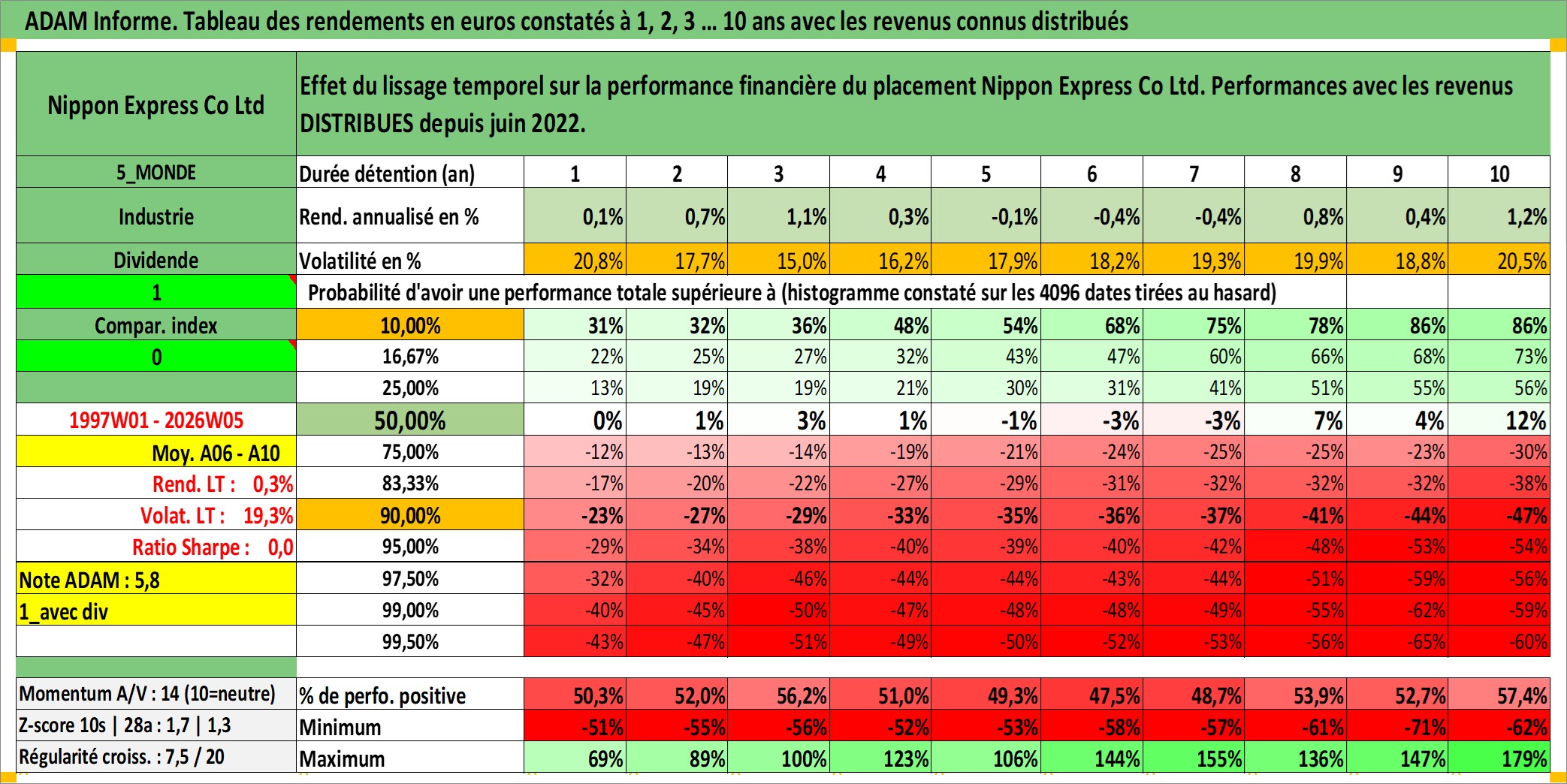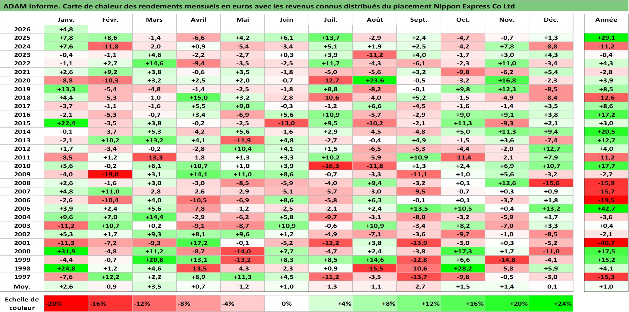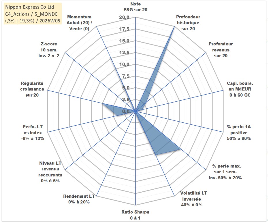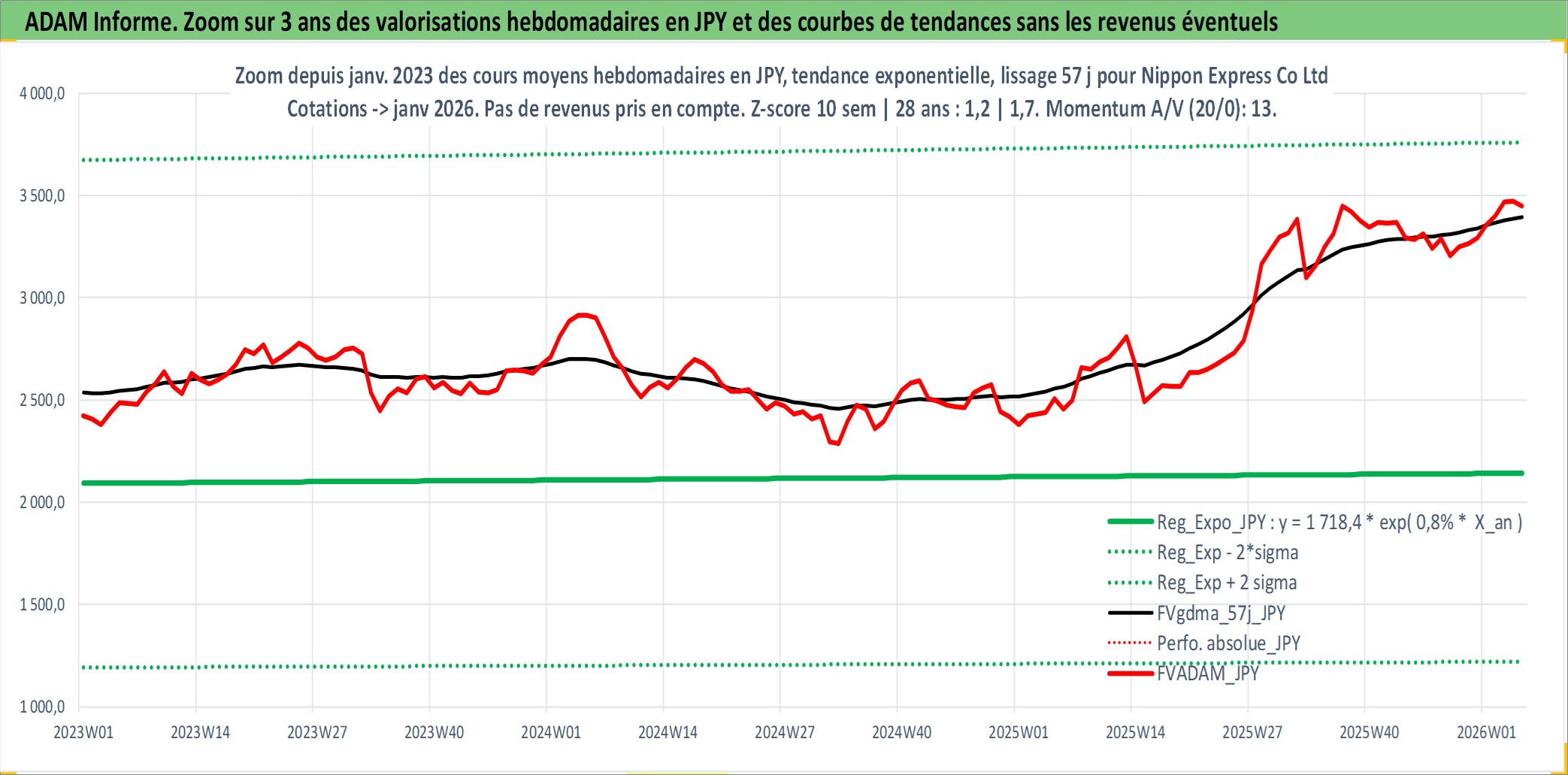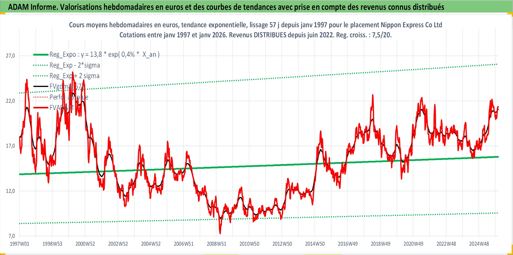 Site dédié aux investisseursPage dédiée sur site financeAnalyse des valorisations hebdomadaires de l'action Nippon Express Co Ltd. Cet actif est cote en JPY. Les valorisations sont en contrevaleur EURO et couvrent les semaines 1997W01 a 2026W05. Les revenus de cet actif financier sont pris en compte depuis la semaine 2022W26. La note ESG de cet actif n'est pas connue.